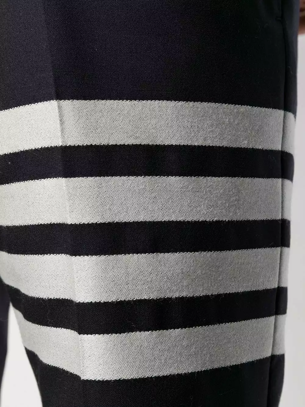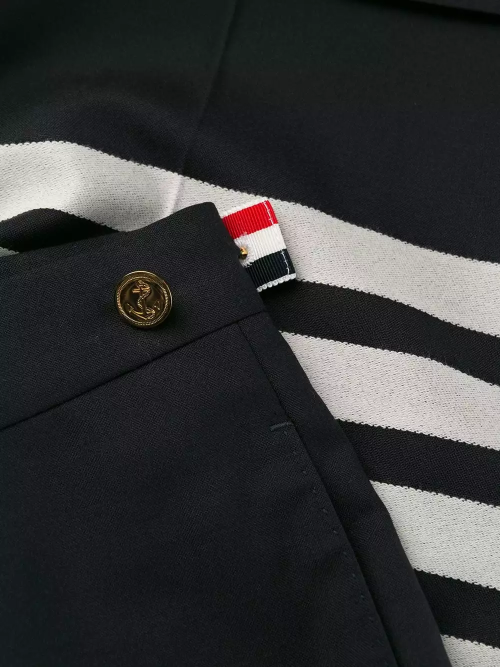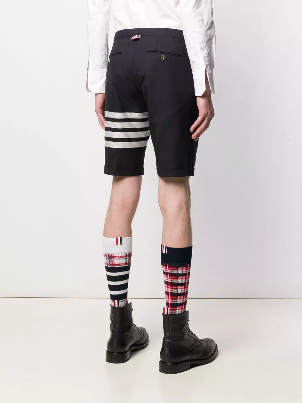 Combining the highest-quality fabrics and a conservative sensibility with a touch of irreverence and humour, these navy wool 4-Bar plain weave suiting shorts from Thom Browne are a classic. Featuring a concealed front fastening, four white stripes, back jetted pockets and turn-up hems.