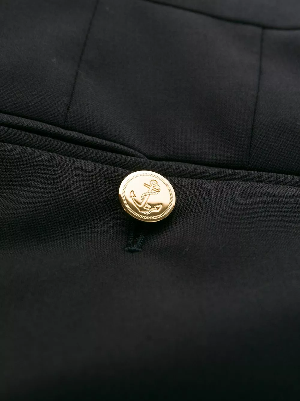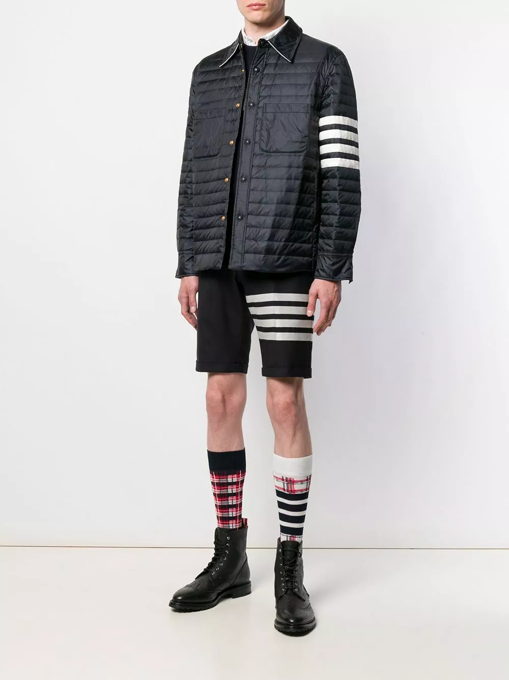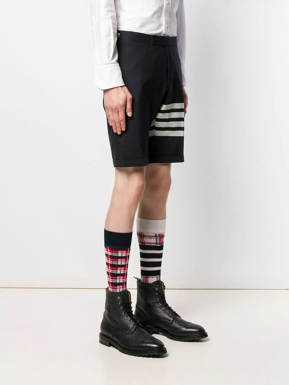 Combining the highest-quality fabrics and a conservative sensibility with a touch of irreverence and humour, these navy wool 4-Bar plain weave suiting shorts from Thom Browne are a classic. Featuring a concealed front fastening, four white stripes, back jetted pockets and turn-up hems.
