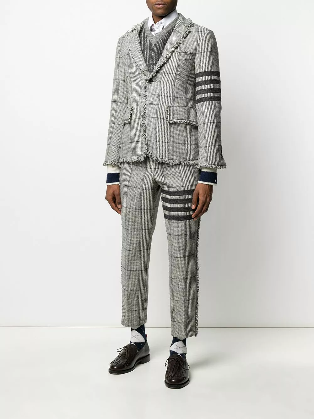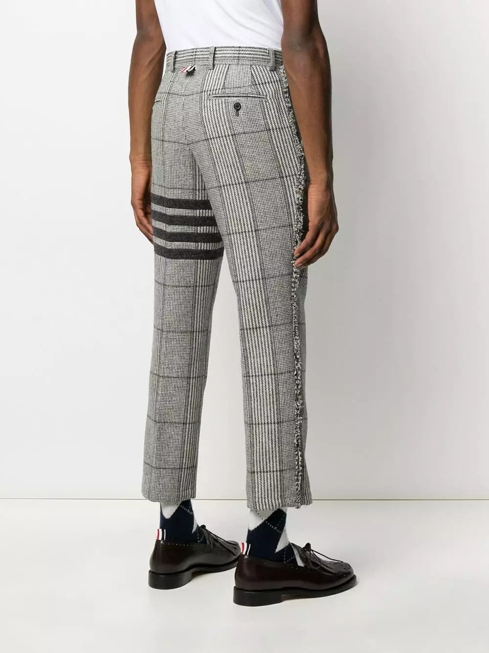 There’re some pieces that can transform our look into a winner. Boasting a wool construction, these 4-Bar Prince of Whales check frayed chinos from Thom Browne are without a doubt a successful choice. Checkmate. Featuring belt loops, a concealed front fastening, frayed edges, a straight leg, a cropped length, a check pattern and a 4-bar stripe detail.