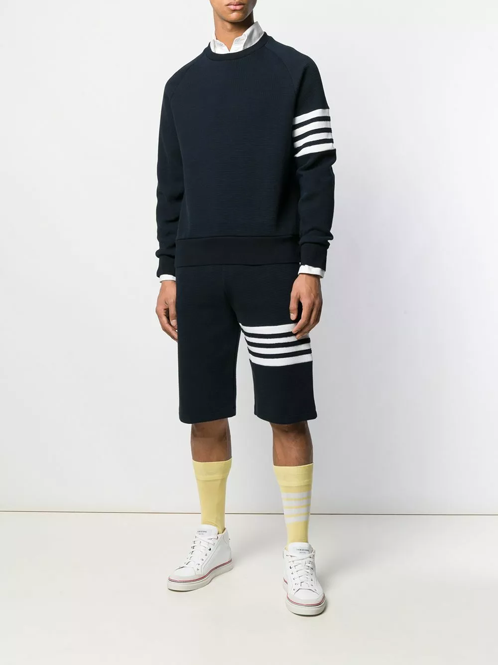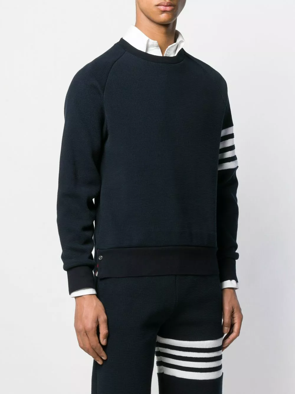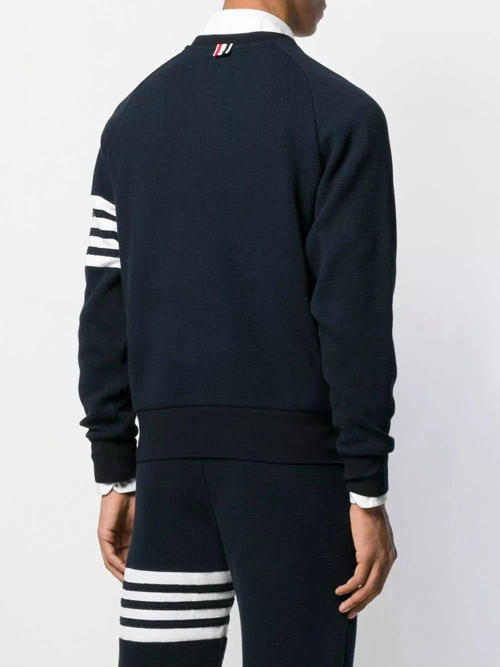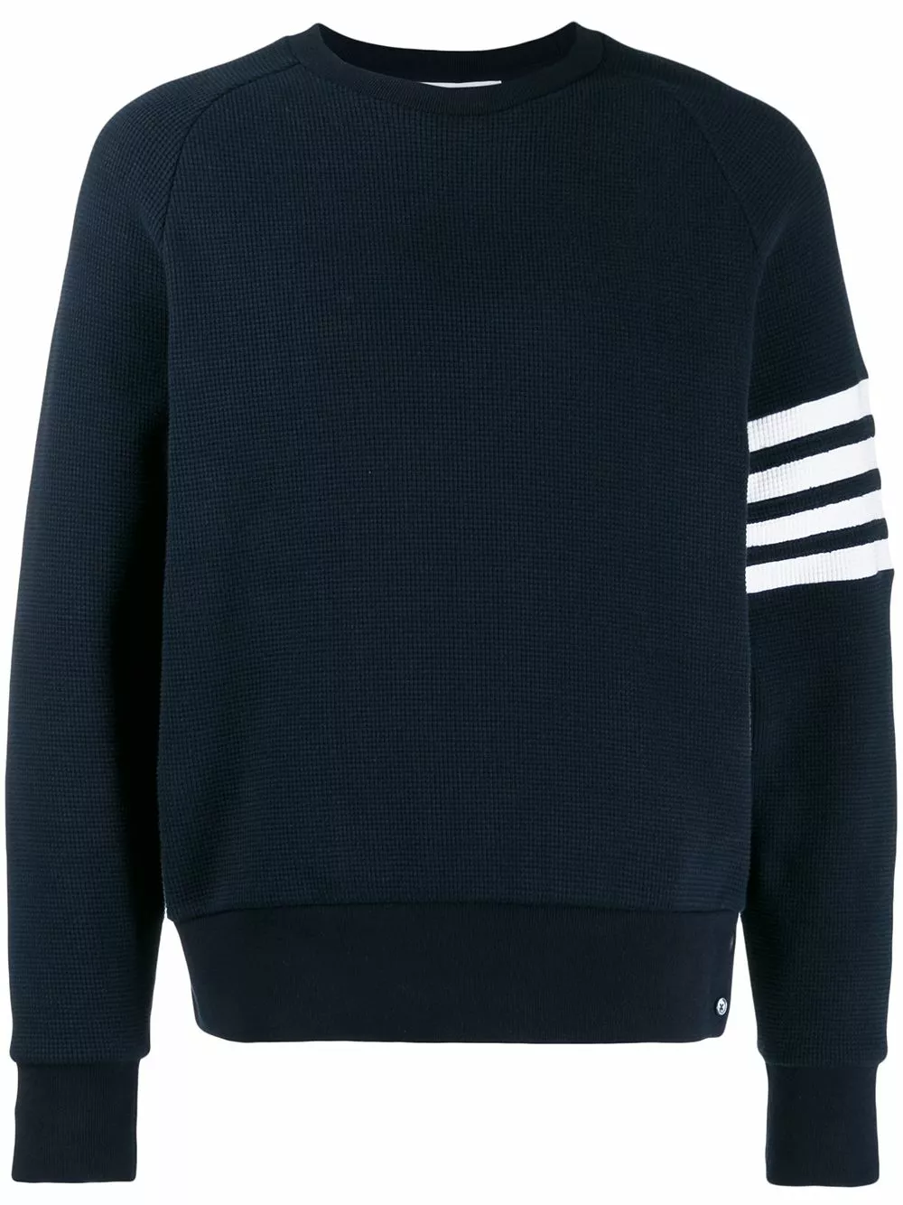 A lineup of investment pieces designed to withstand the test of time, Thom Browne’s most recent collection continues to blur the lines between refined tailoring and contemporary sportswear. As seen in this navy cotton 4-Bar raglan-sleeve sweatshirt that features long sleeves, ribbed details, a straight hem, a tricolour grosgrain tab on the rear and signature quadruple white stripes.
