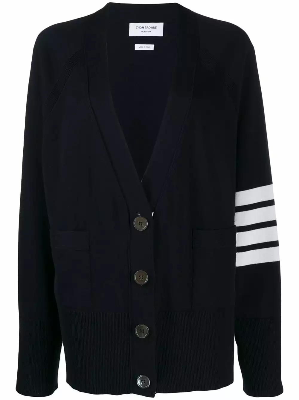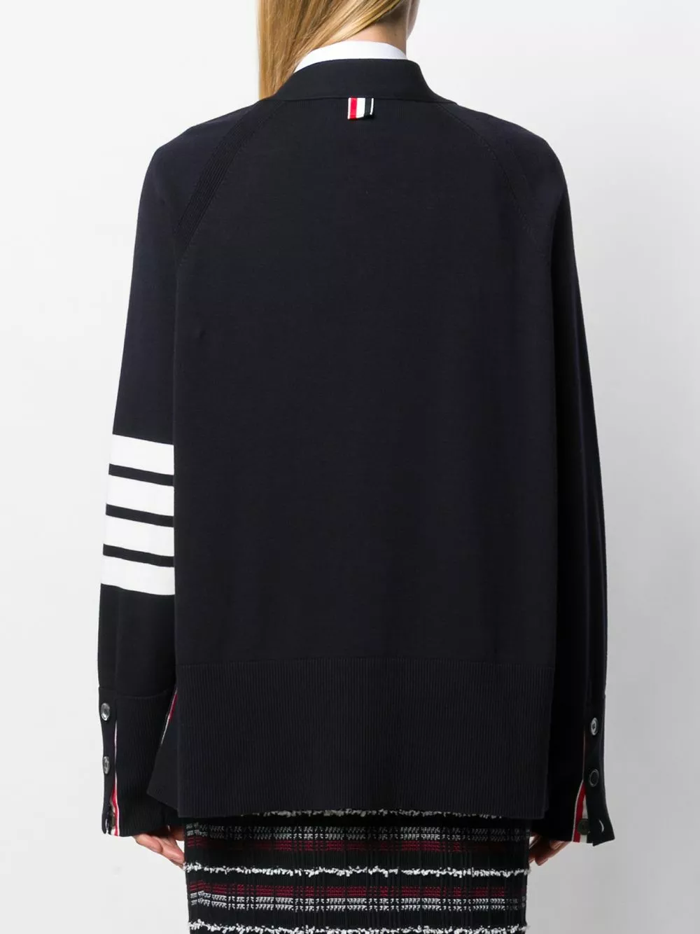 A wardrobe of reimagined – but never boring – classics, Thom Browne’s latest collection takes uniform dressing to chic new heights with designs like this navy cotton 4-bar raglan sleeved V-neck cardigan. Featuring elongated sleeves, a v-neck, a front button fastening, a ribbed hem and cuffs, two front patch pockets, a signature label tag at the back, a signature 4-bar motif at the sleeve and a signature striped print at the fastening.