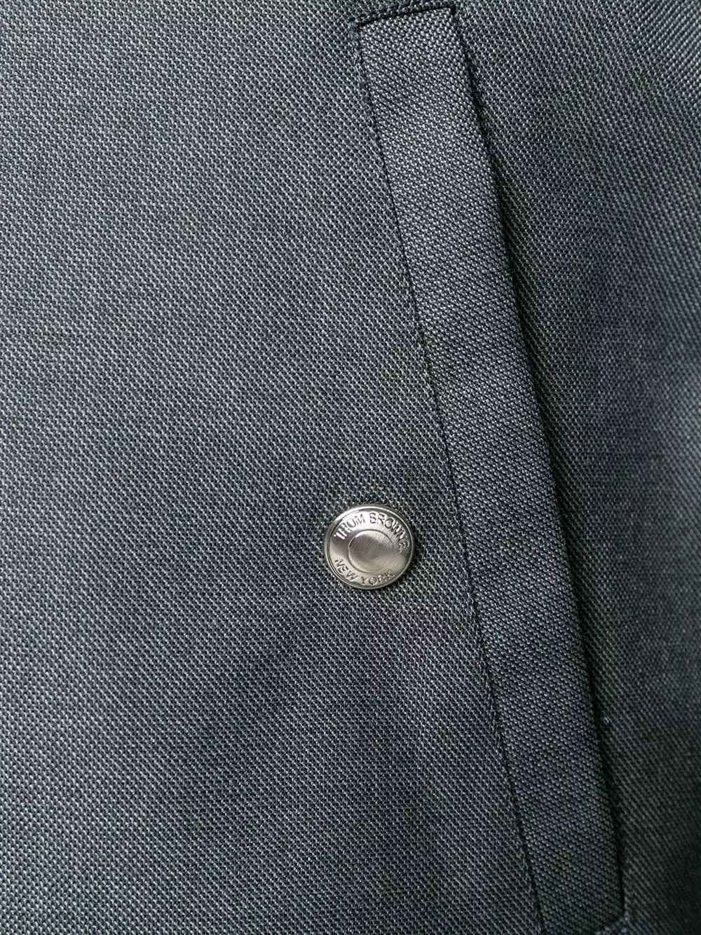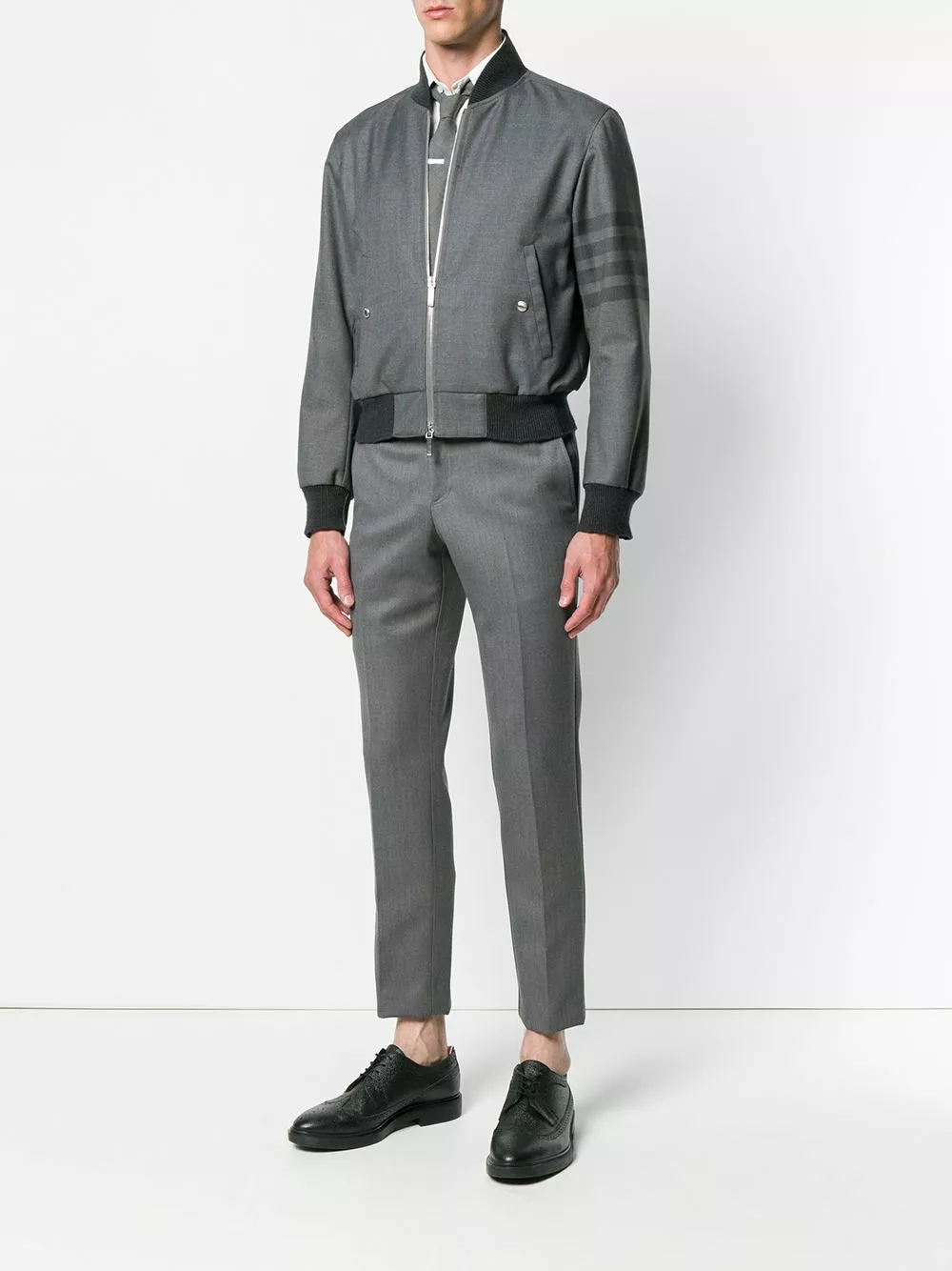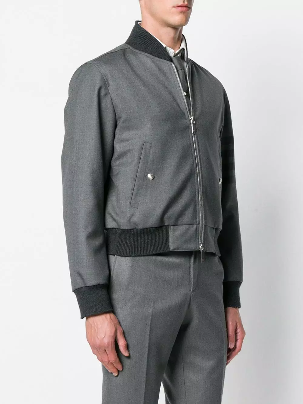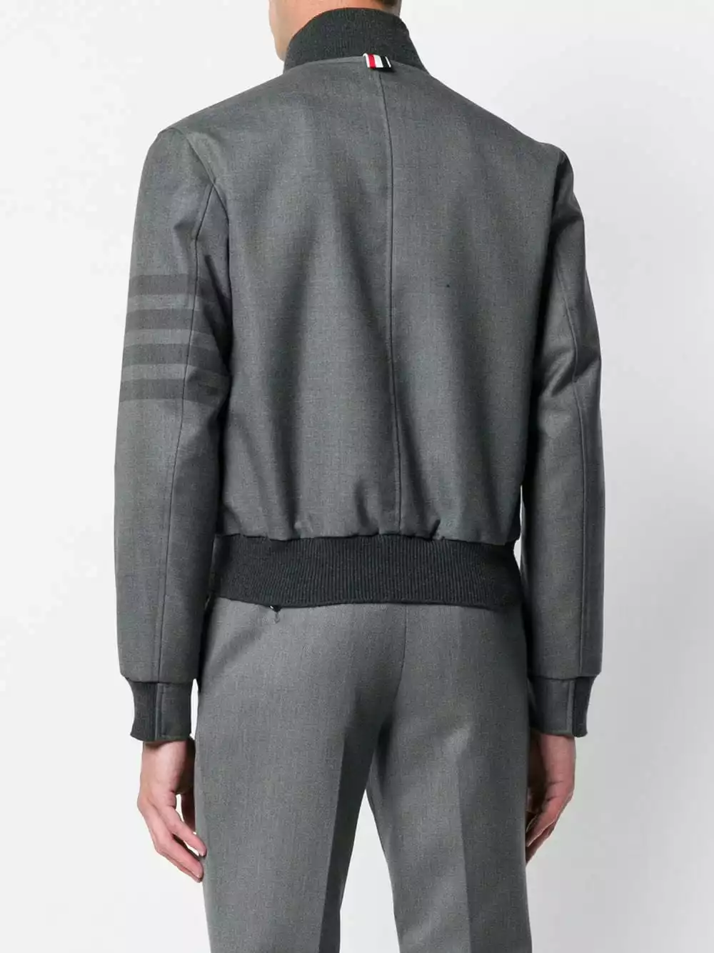 Grey wool 4-Bar Ribbed Knit Blouson Jacket from Thom Browne featuring a straight fit, a front zip fastening, a ribbed collar, a ribbed hem and cuffs, side pockets, a lining and four-bar stripes at the sleeve.