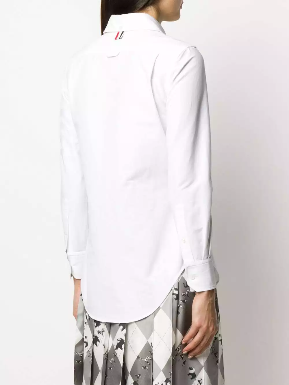 Are you bored with your current white shirt collection? Then it’s time to consider something a little unconventional, like this 4-Bar round collar Oxford shirt from Thom Browne. The tone-on-tone bar stripes on the sleeve add detail to this minimal piece. Featuring a curved hem, a patch pocket at the chest, a round collar, logo patch and a four-bar stripe on the sleeve.