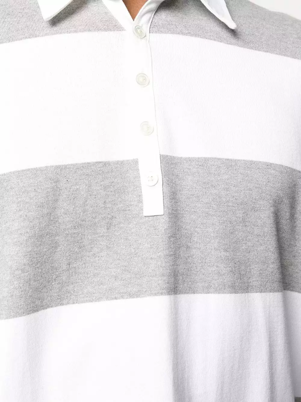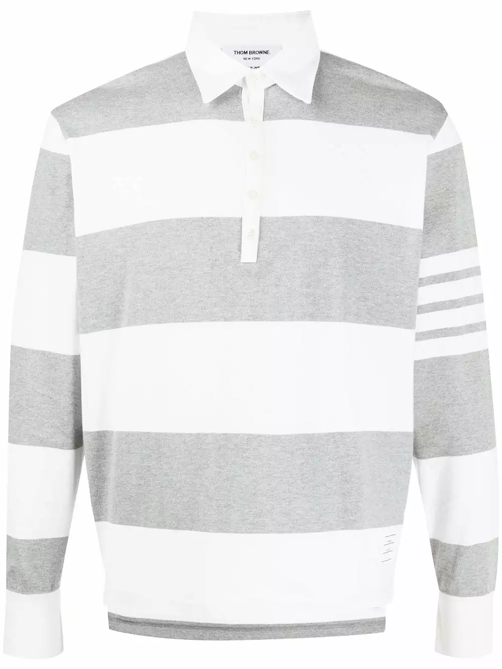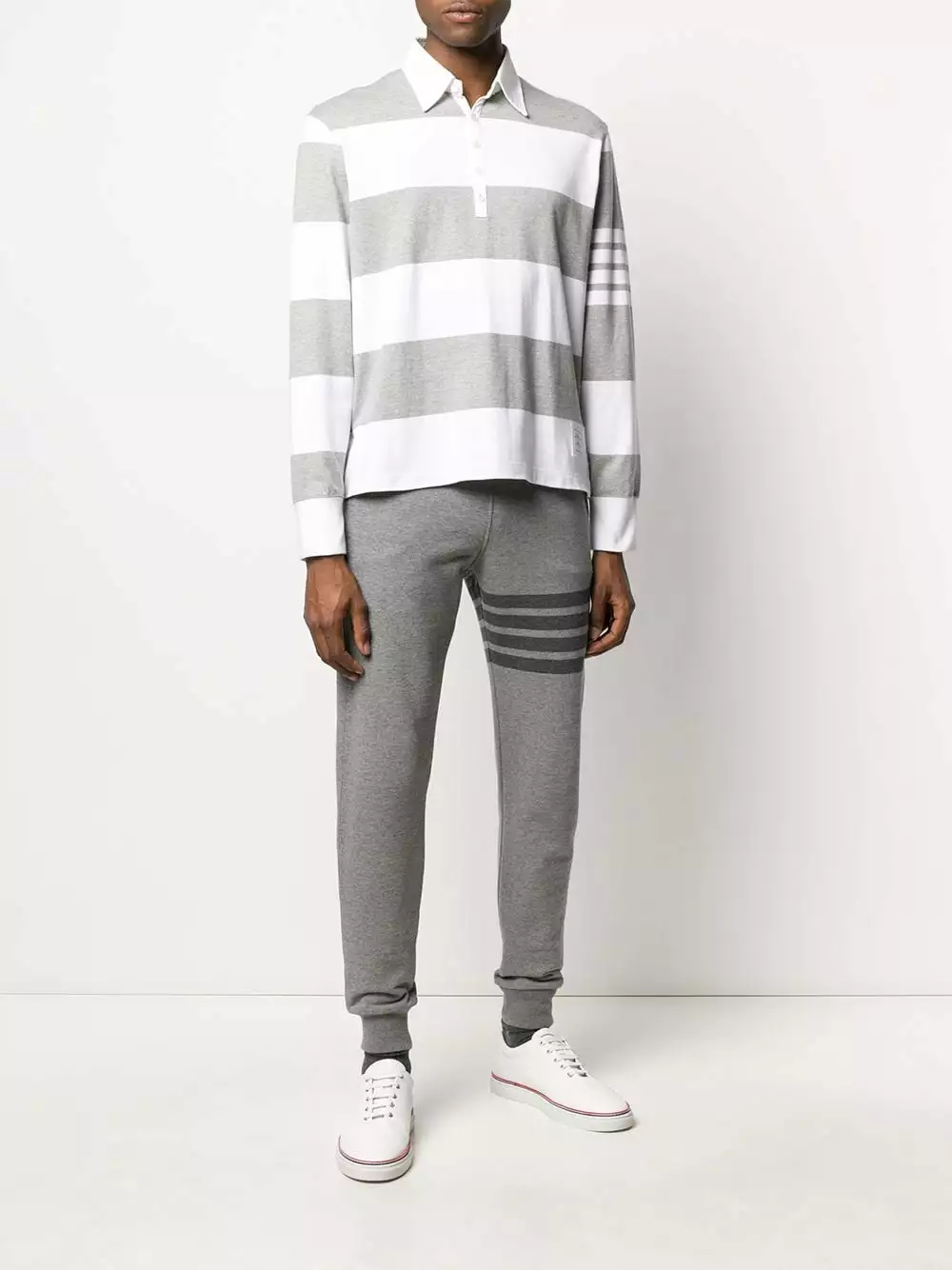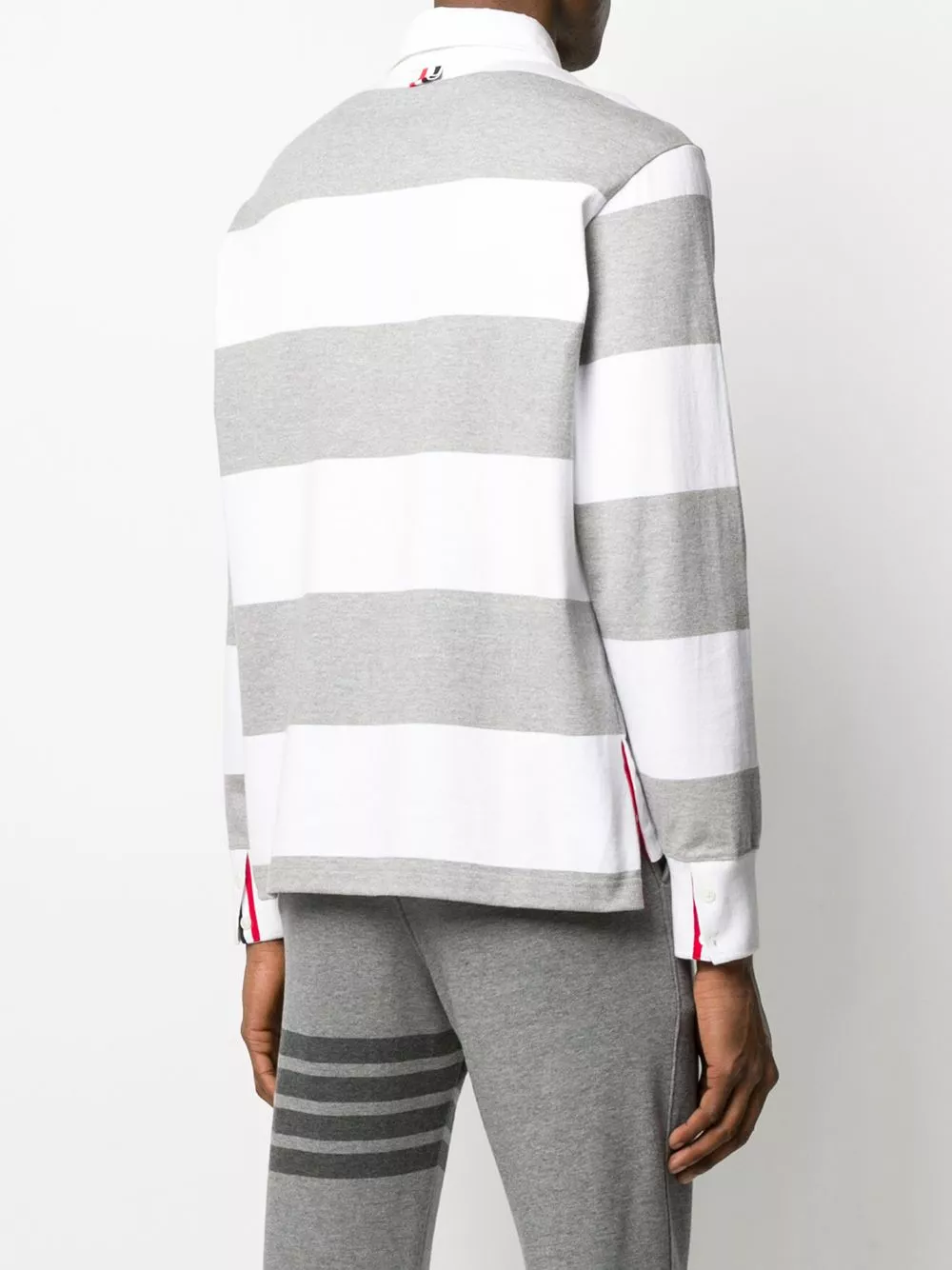 When you’ve got rugby match at 11 but lunch with the in-laws at 12:30. Crafted from striped pastel grey and white cotton, this oversized polo from Thom Browne is a sleek piece, bearing the brand’s signature 4-Bar stripes on the sleeve. Don’t get it stained. Featuring an oversized fit, a striped pattern, a classic polo collar, long sleeves, a stripe detail to the side and a front logo patch.