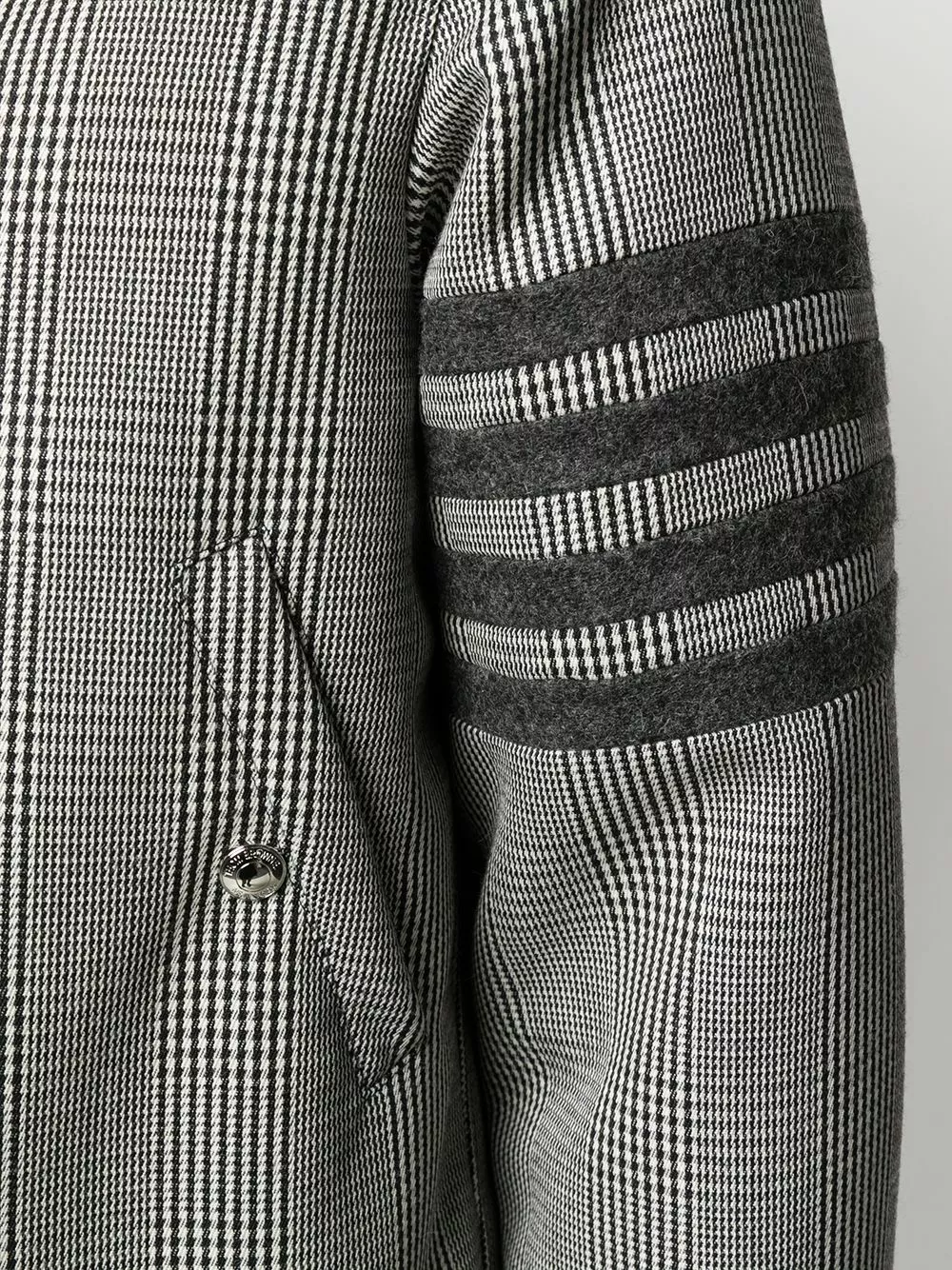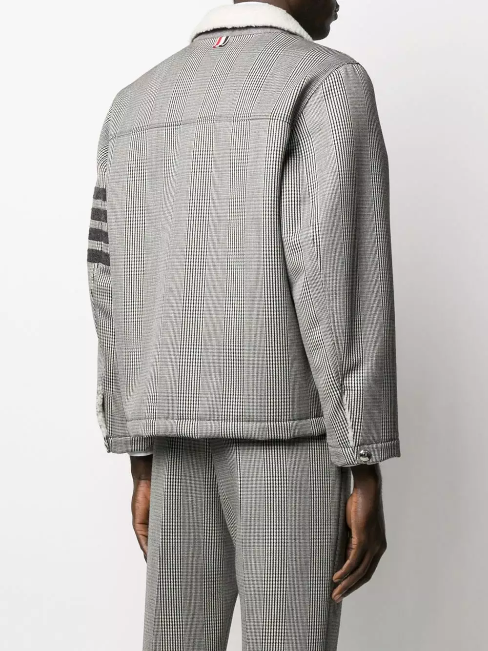 Looking for classic wardrobe pieces with a distinctive edge? Thom Browne will give you an easy route. This Prince of Wales check flight jacket is lined with ultra-soft shearling to keep warmth in, complete with the signature 4-Bar striped pattern on the sleeve and a boxy fit and front zip fastening to keep things simple. Featuring a cutaway collar, a front zip fastening, two front pockets and long sleeves.