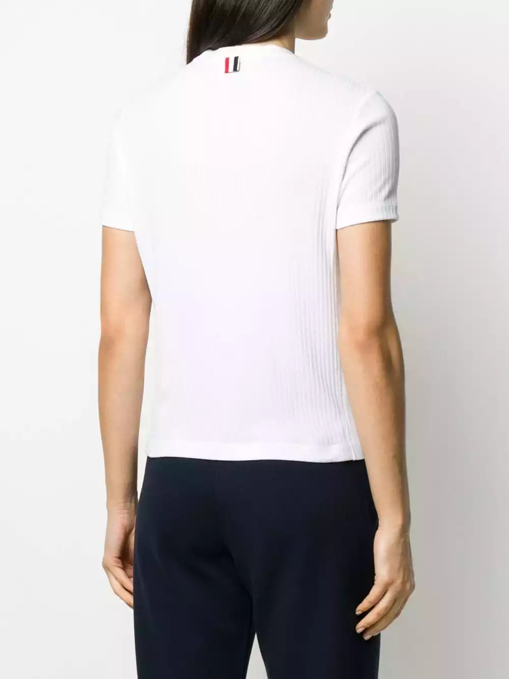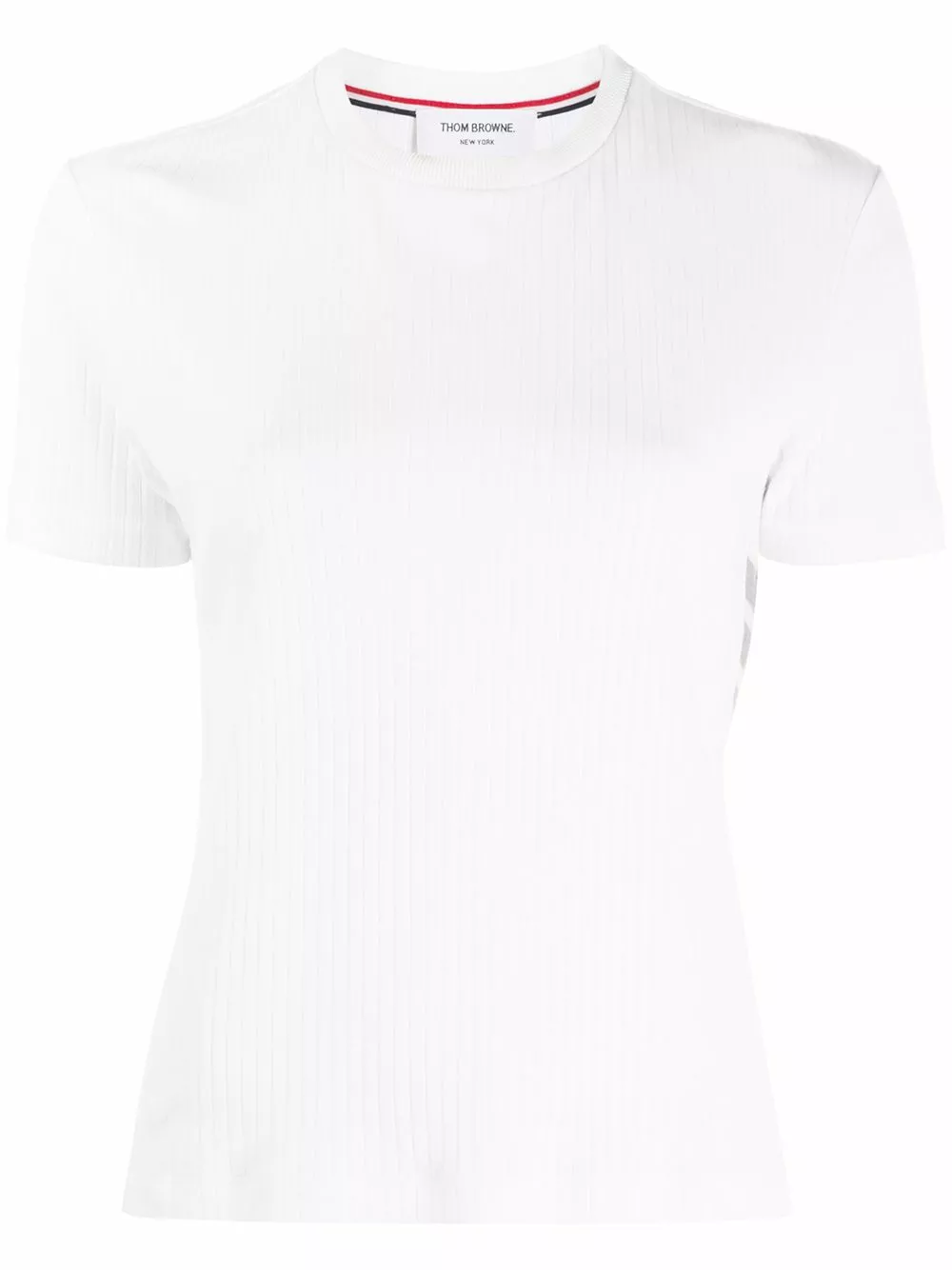 Life can be simple. All you have to do is go with the flow. Take this white cotton 4-Bar side insert T-shirt in high twisted rib from Thom Browne for instance, it only exists to give you multiple outfit choices. Ahh, the bliss. Featuring a round neck, short sleeves, a straight hem and a tricolour grosgrain tab on the rear.