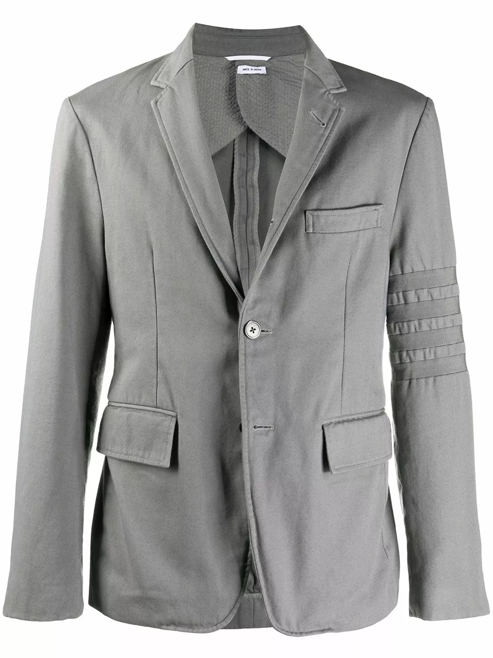 When it comes to gentlemen’s blazers, versatility is key. Made from grey cotton, this 4-Bar single-breasted blazer from Thom Browne can go from a business meeting to a casual date with friends. You choose.