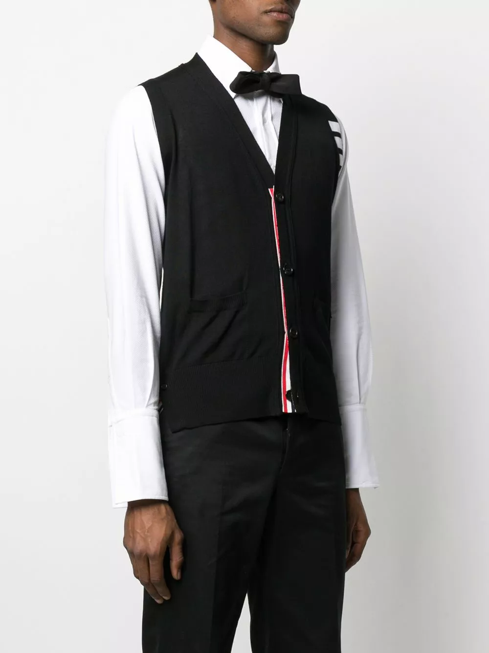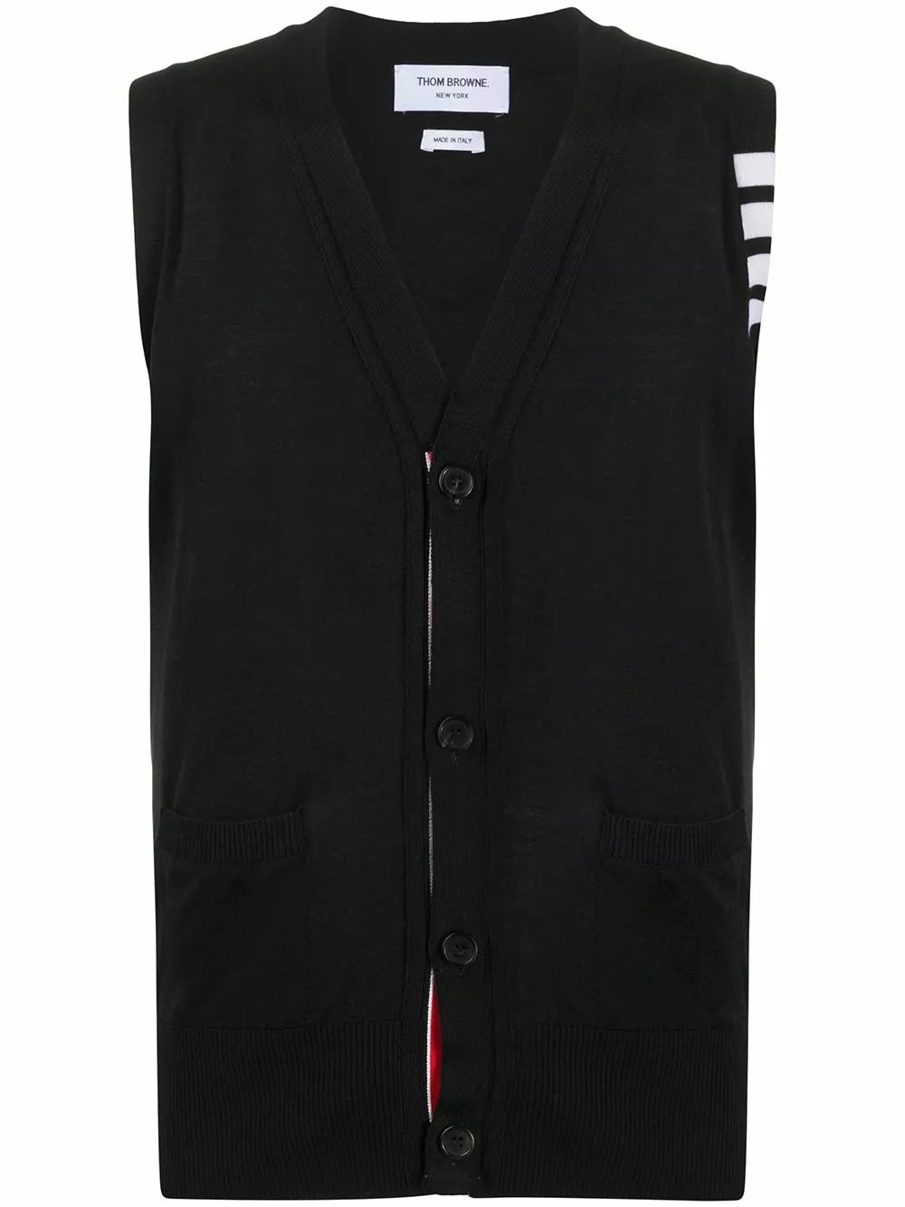 We bet the resurgence of sweater vests was the last trend you ever expected for SS21. Partake in it with this merino wool 4-Bar sleeveless V-neck cardigan from Thom Browne. Your grandad would approve. Featuring a stripe detail to the side, a v-neck, a button fastening and patch pockets.