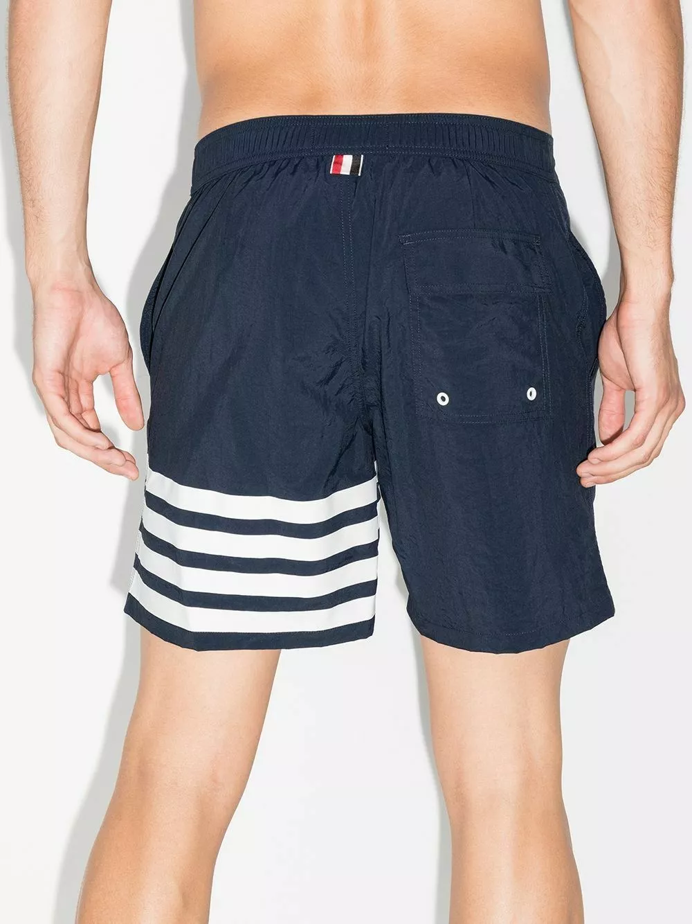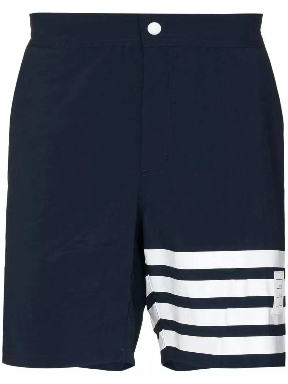 Combining highest-quality fabrics and a conservative sensibility with a touch of irreverence and humour, Thom Browne’s Autumn/Winter 2019 edit is full of modern must-haves. Crafted in Italy from a crisp technical fabric, these navy blue swim shorts feature a zip and press stud fastening, a rear pocket, a signature tri-colour striped tab at the back and four-bar stripes at the thigh. Swimwear must be tried on over your own garments.