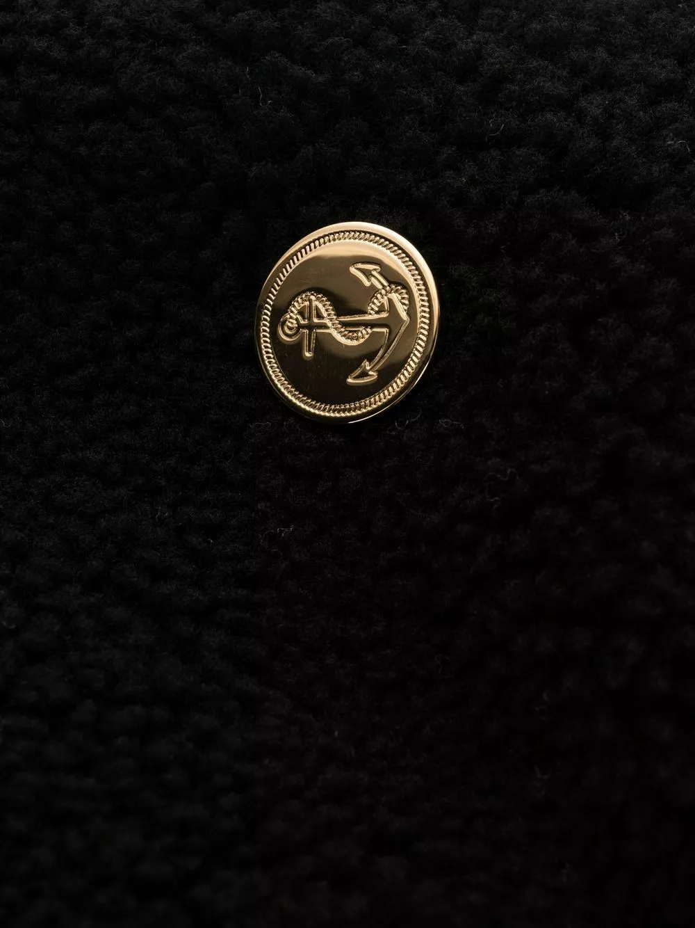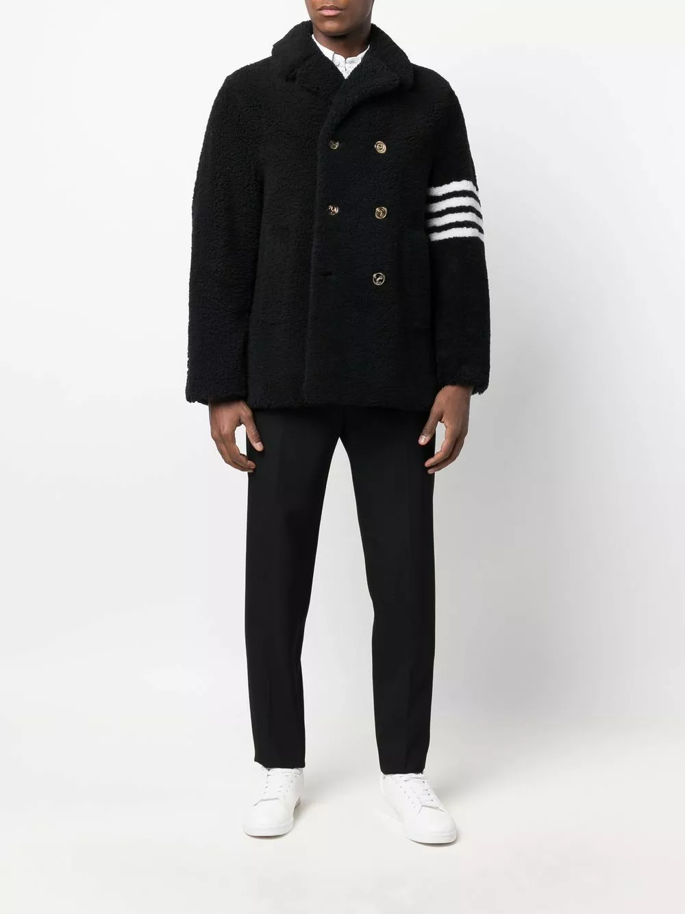 Thom Browne is famous for defying convention to present modern tailored designs as this double-breasted jacket. Distinguished by the textured finish, this piece is presented with the label’s signature 4-Bar at the left sleeve.