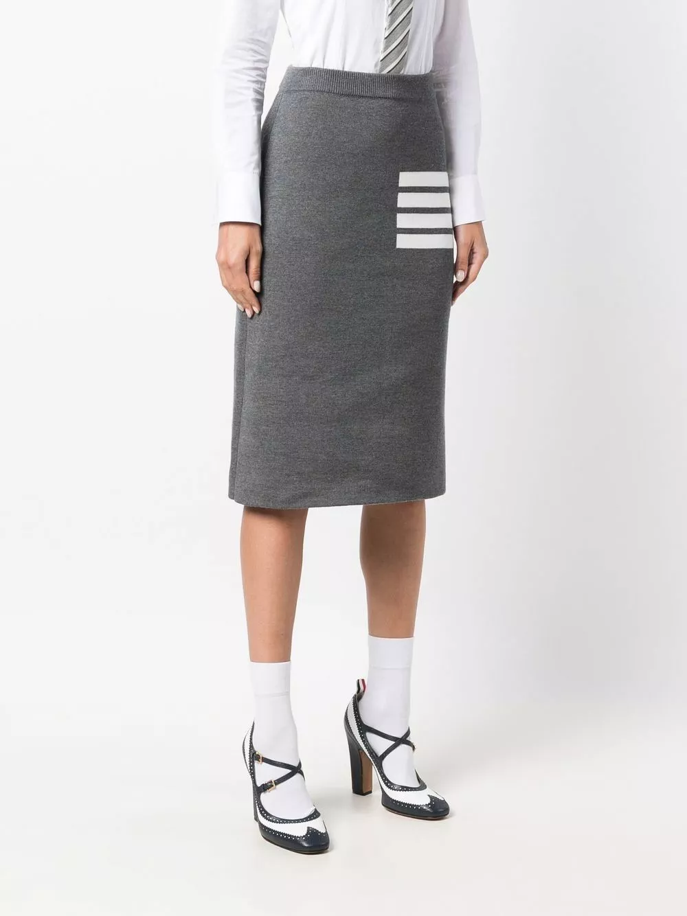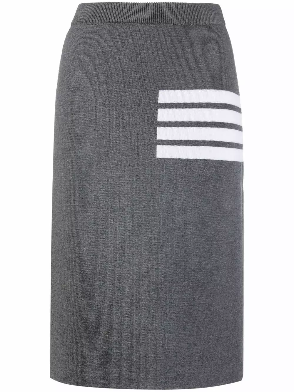 Spun from a virgin wool-blend, this medium grey skirt from Thom Browne is detailed with the signature 4-Bar stripe embellishment for a recognisable finish. The mid-length design has a knitted construction and falls to an elegant knee length.