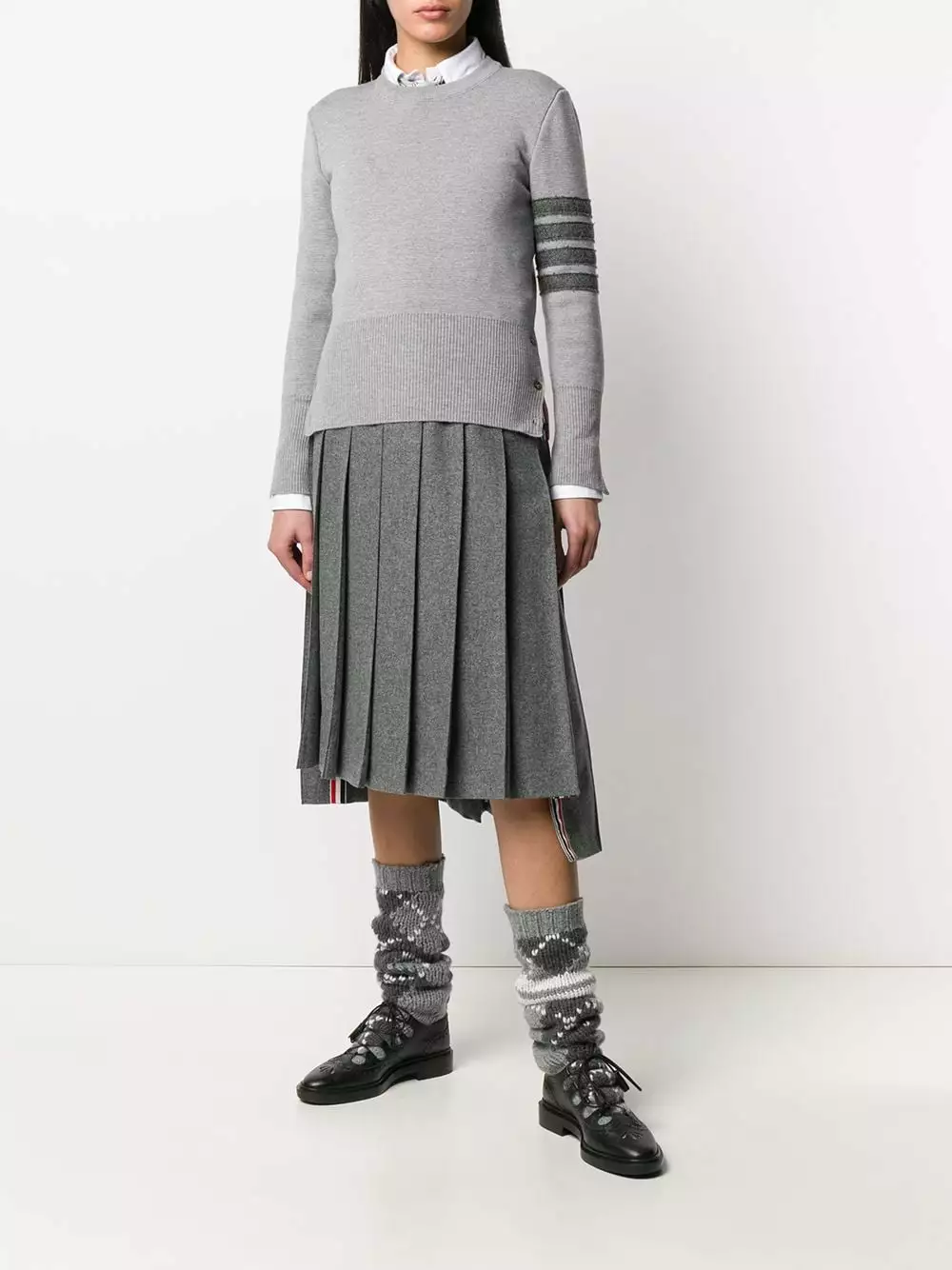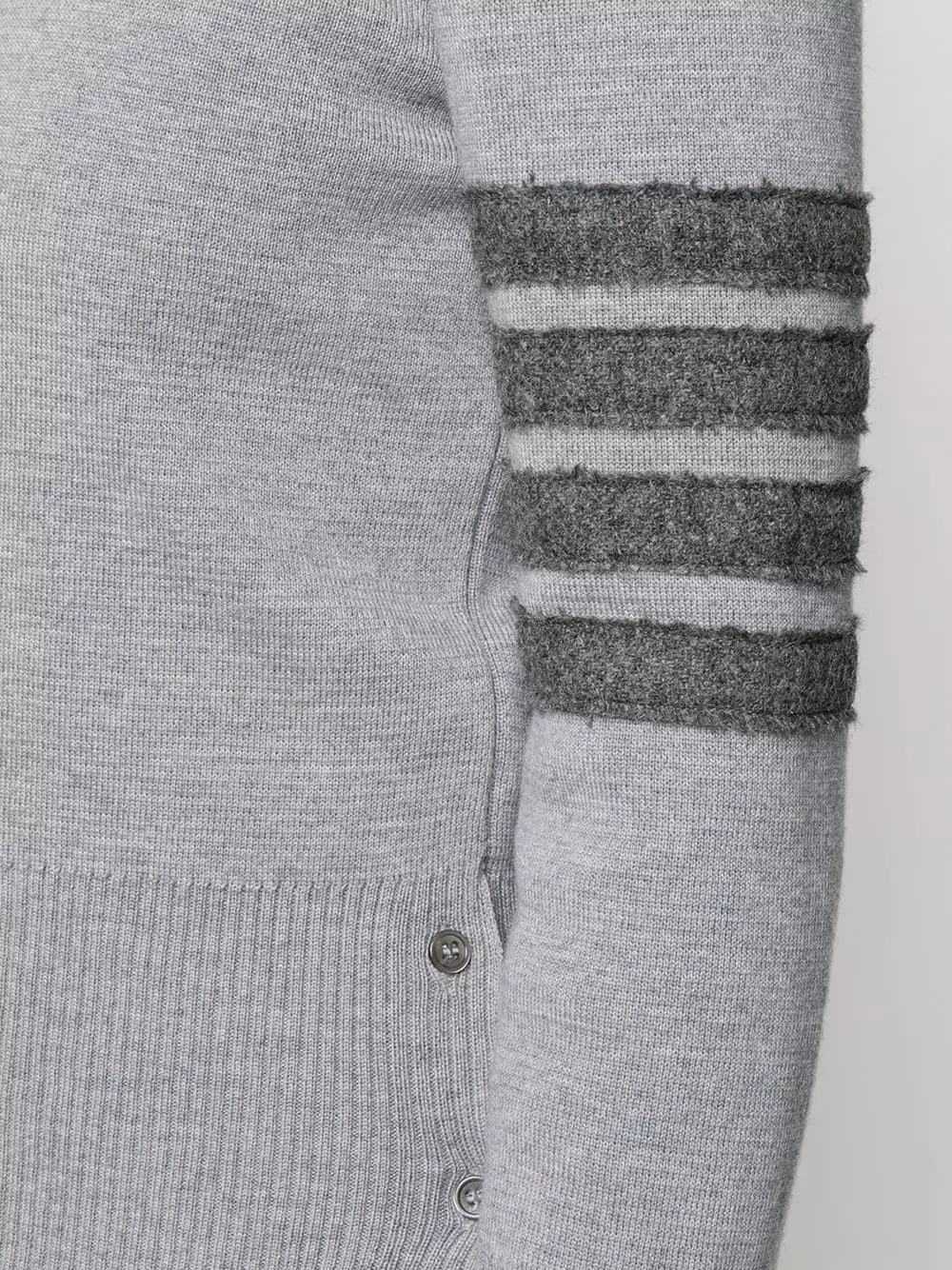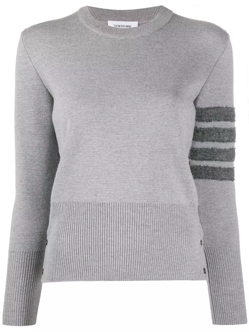 Feeling nostalgic for your old school look? Let Thom Browne help you out. This 4-Bar stripe pullover puts a grown-up twist on preppy style. Featuring a ribbed crew neck, dropped shoulders, long sleeves, a ribbed hem and cuffs, button cuffs, a RWB tab, a 4-Bar stripe, RWB details and buttons to the hem.