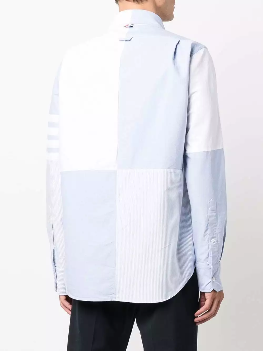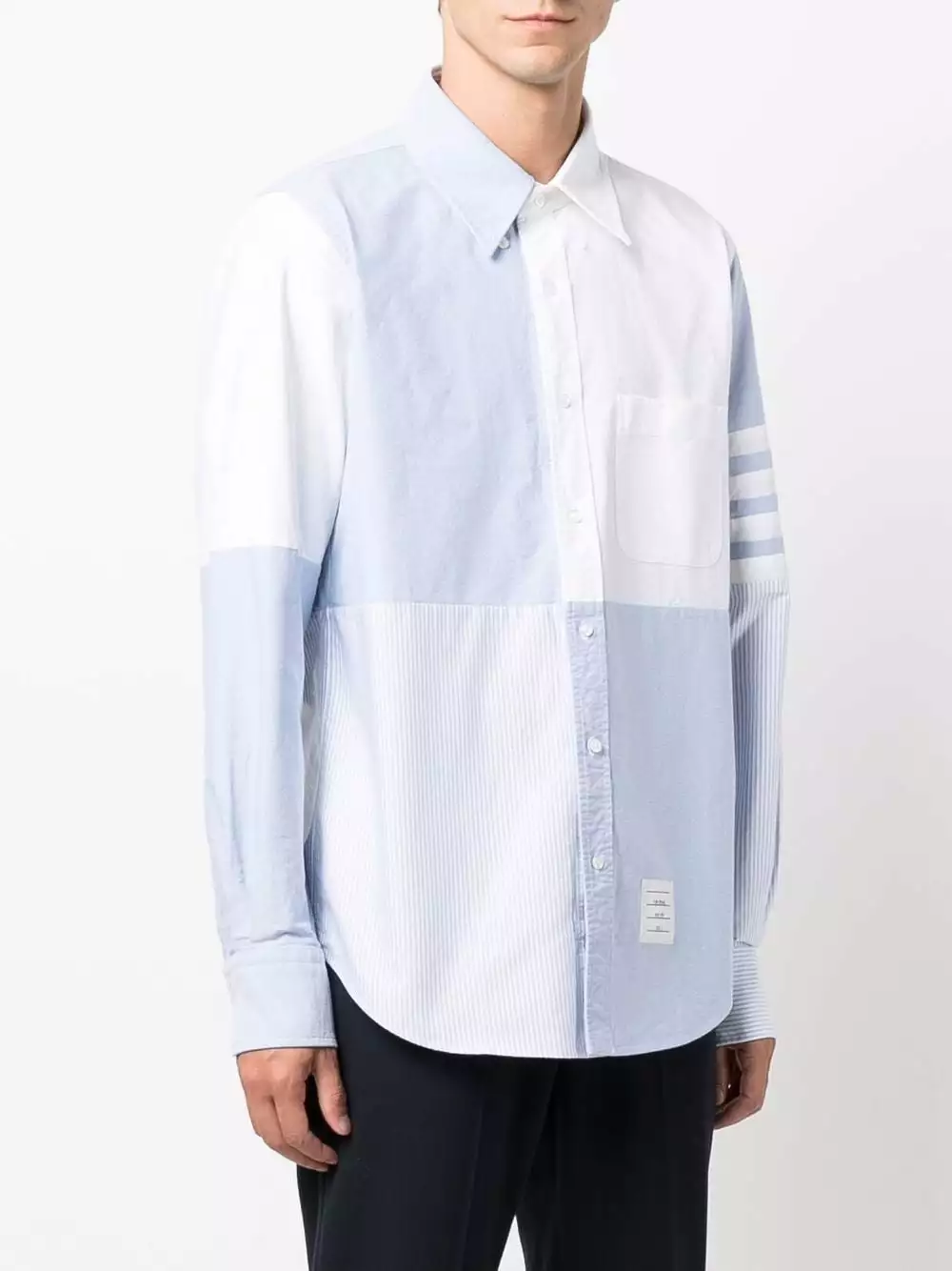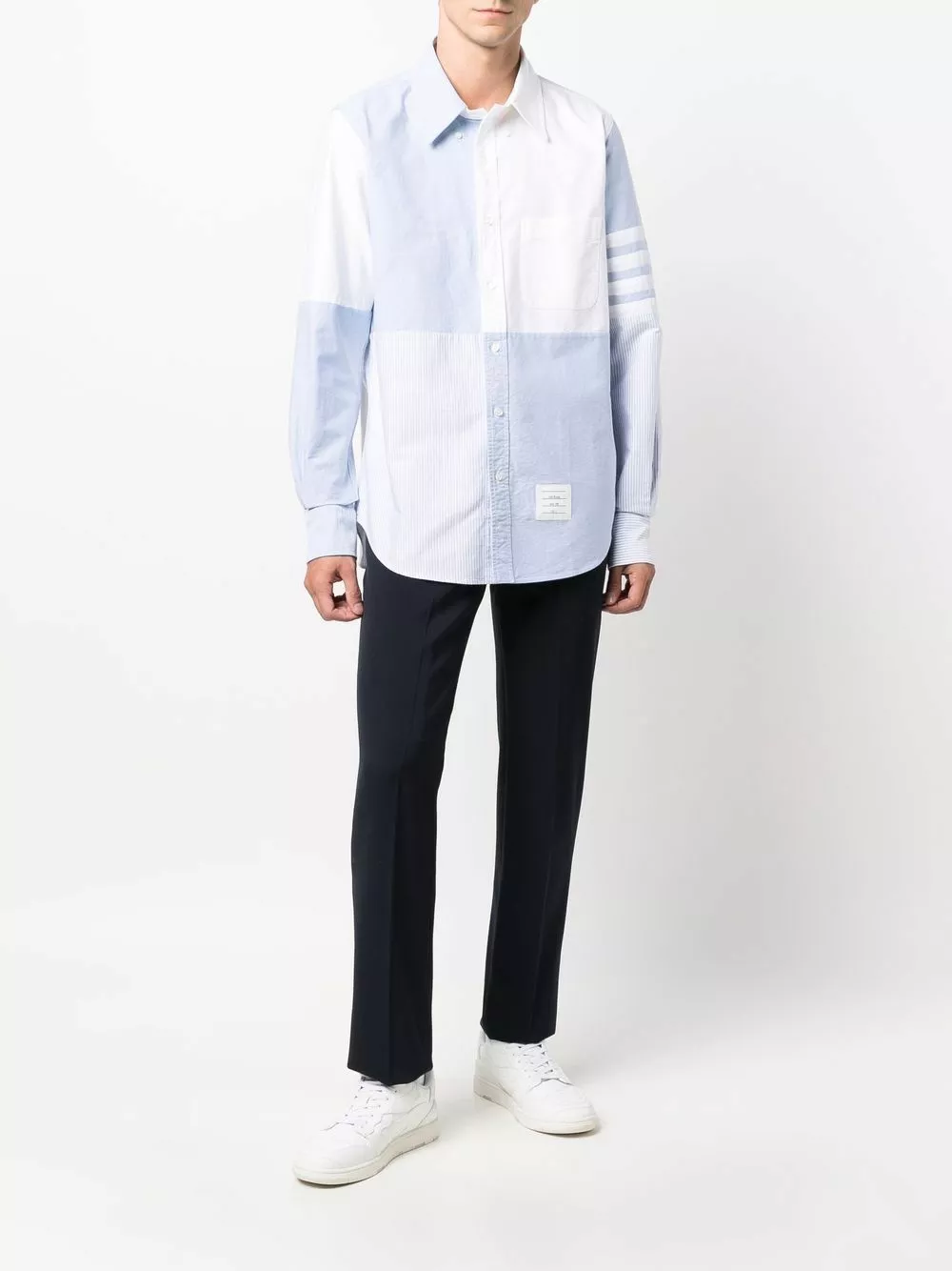 A panelled design brings a playful feel to this long-sleeve shirt from Thom Browne. Cut to a straight-fit, this blue and white piece is finished with a 4-Bar stripe on the left sleeve for a signature finish.
