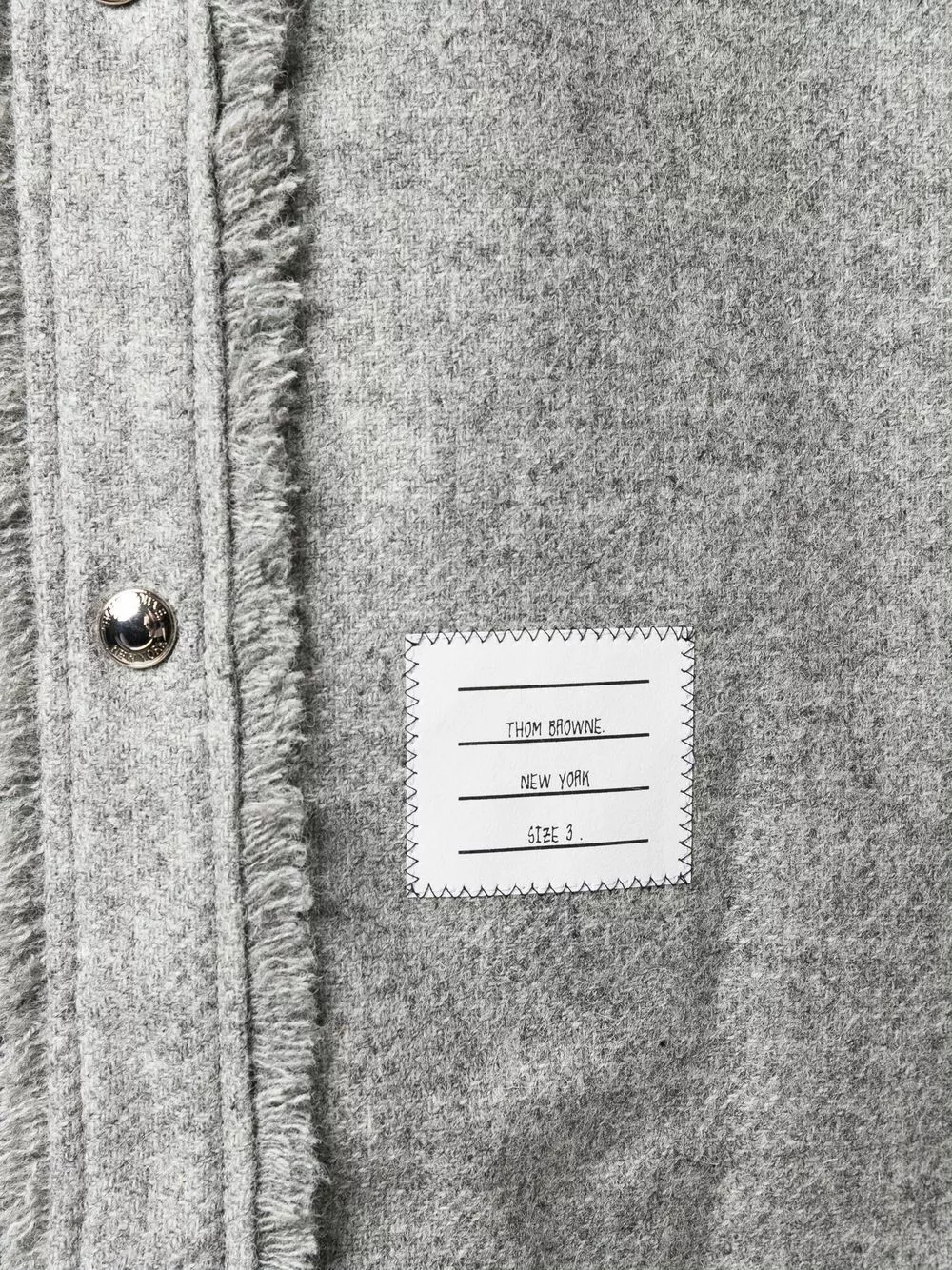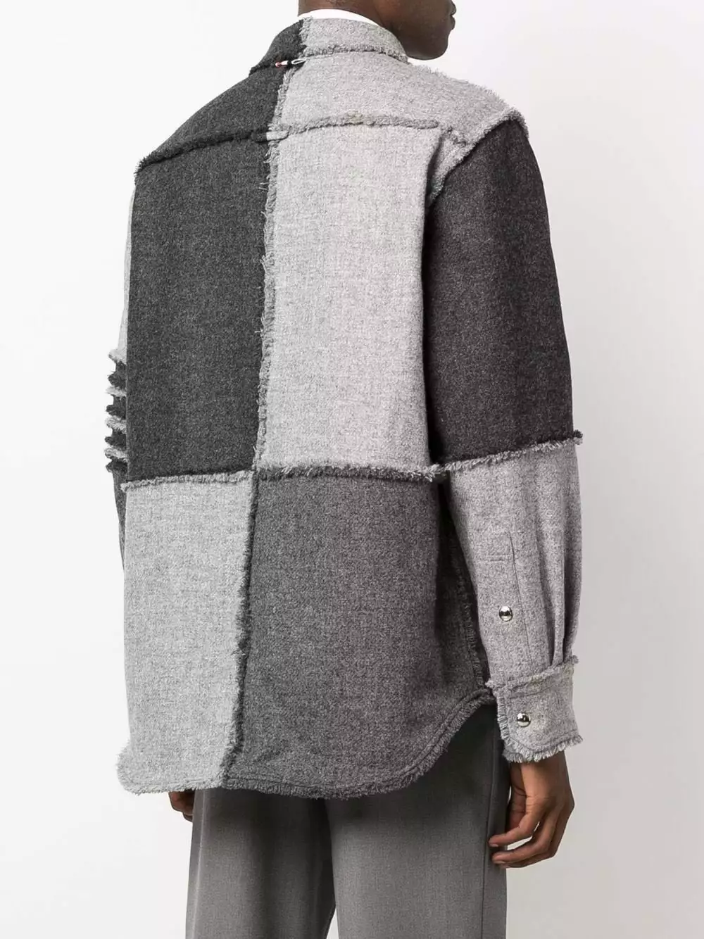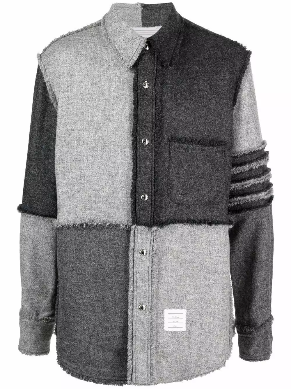 Thom Browne’s signature 4-Bar Stripe is reinvented in this shirt-jacket. With frayed edges and three distinct tones of grey in its patchwork design, this piece from the AW21 collection has the iconic house symbol with a distressed finish.
