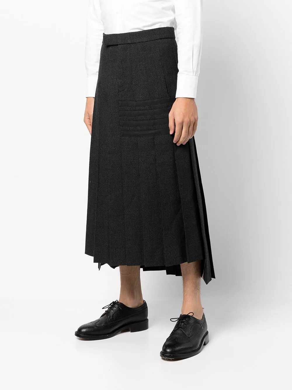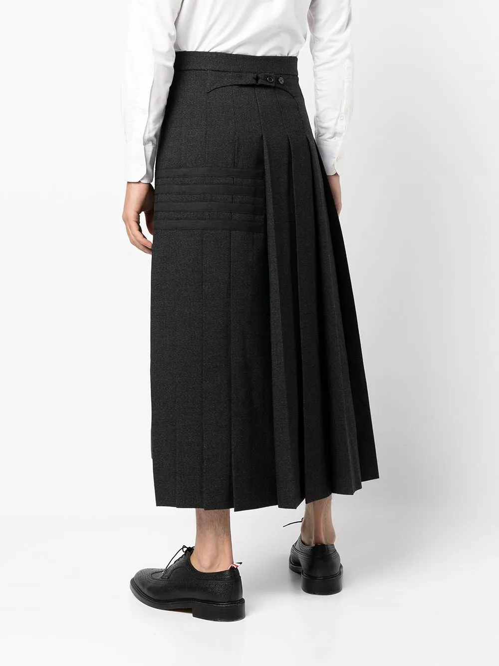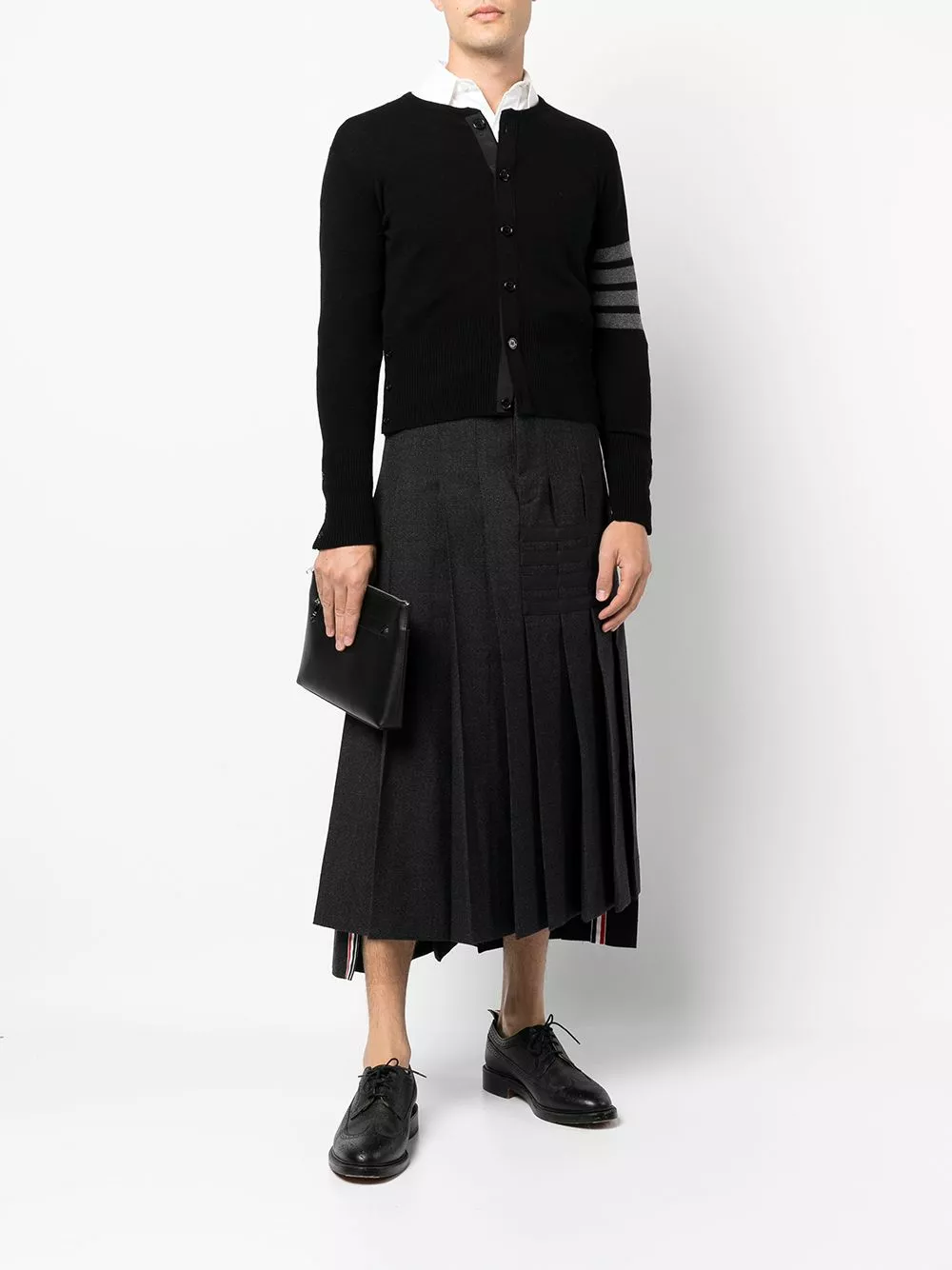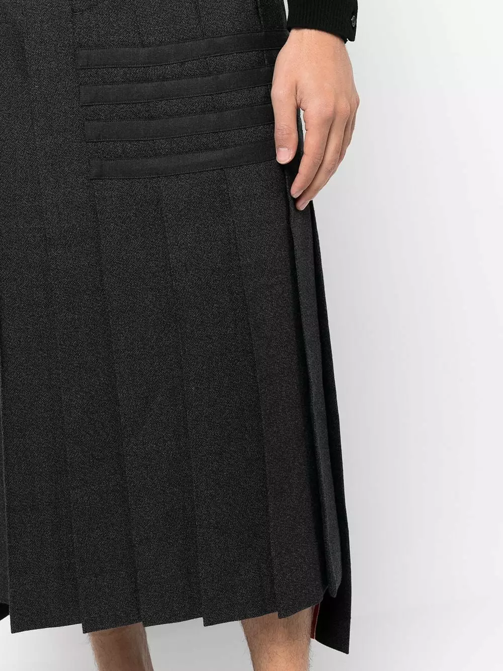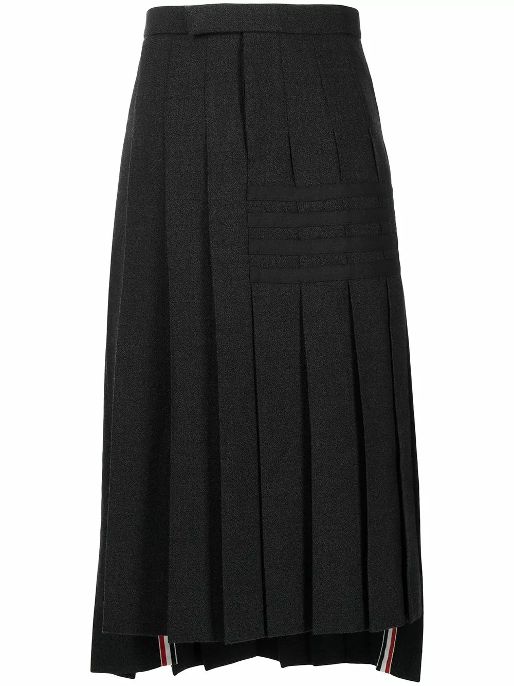 An iconic symbol of the Thom Browne house, the 4-Bar Stripe is seen in every collection. For AW21, it’s subtly added to the side of this fully-pleated midi skirt, in a tonal dark grey hue.