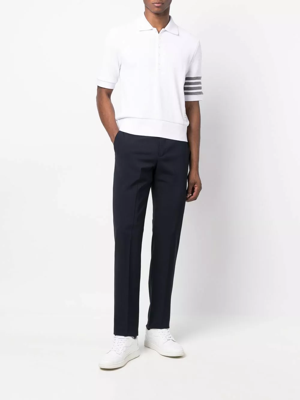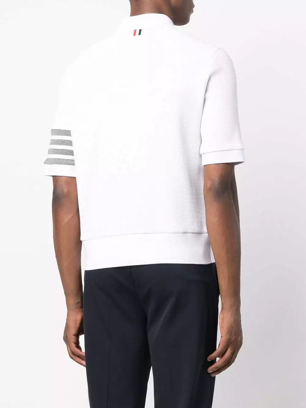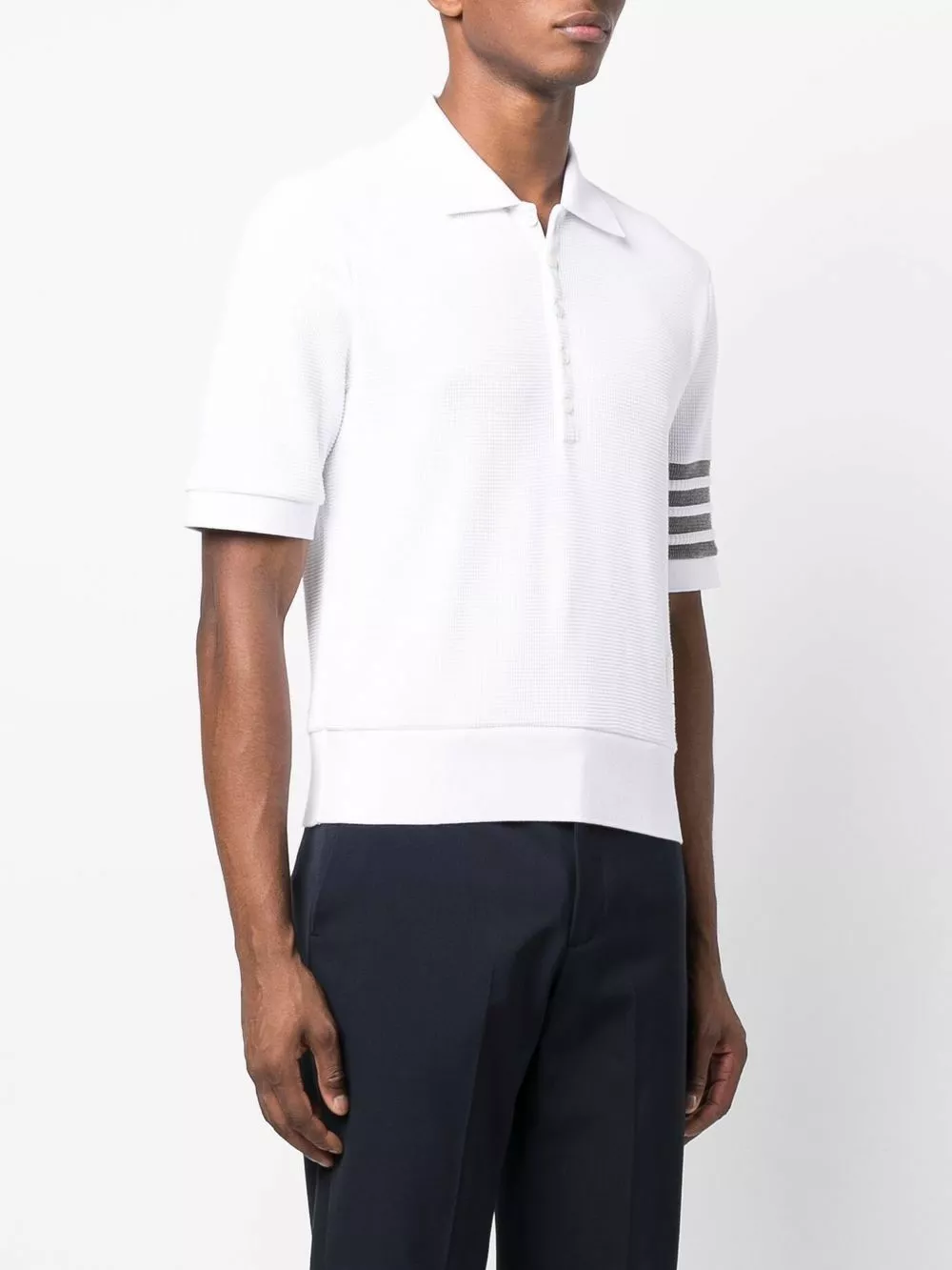 Thom Browne presents a sporty aesthetic with this polo shirt. In soft white and grey tones, this piece boasts a classic waffle knit, with the brand’s signature 4-Bar stripe to the sleeve.