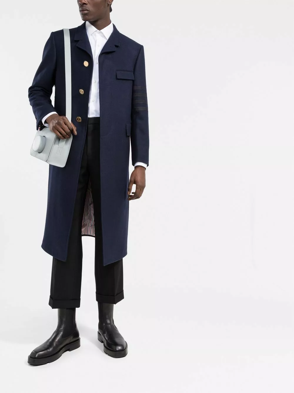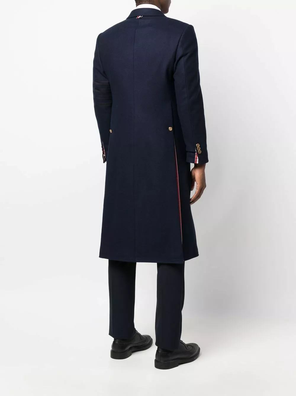 Thom Browne uses collegiate undertones and signature motifs to design the modern tailored pieces. This classic midi coat features a distinguishing 4-bar stripe detail on the sleeve and an iconic RWB stripe to the rear.