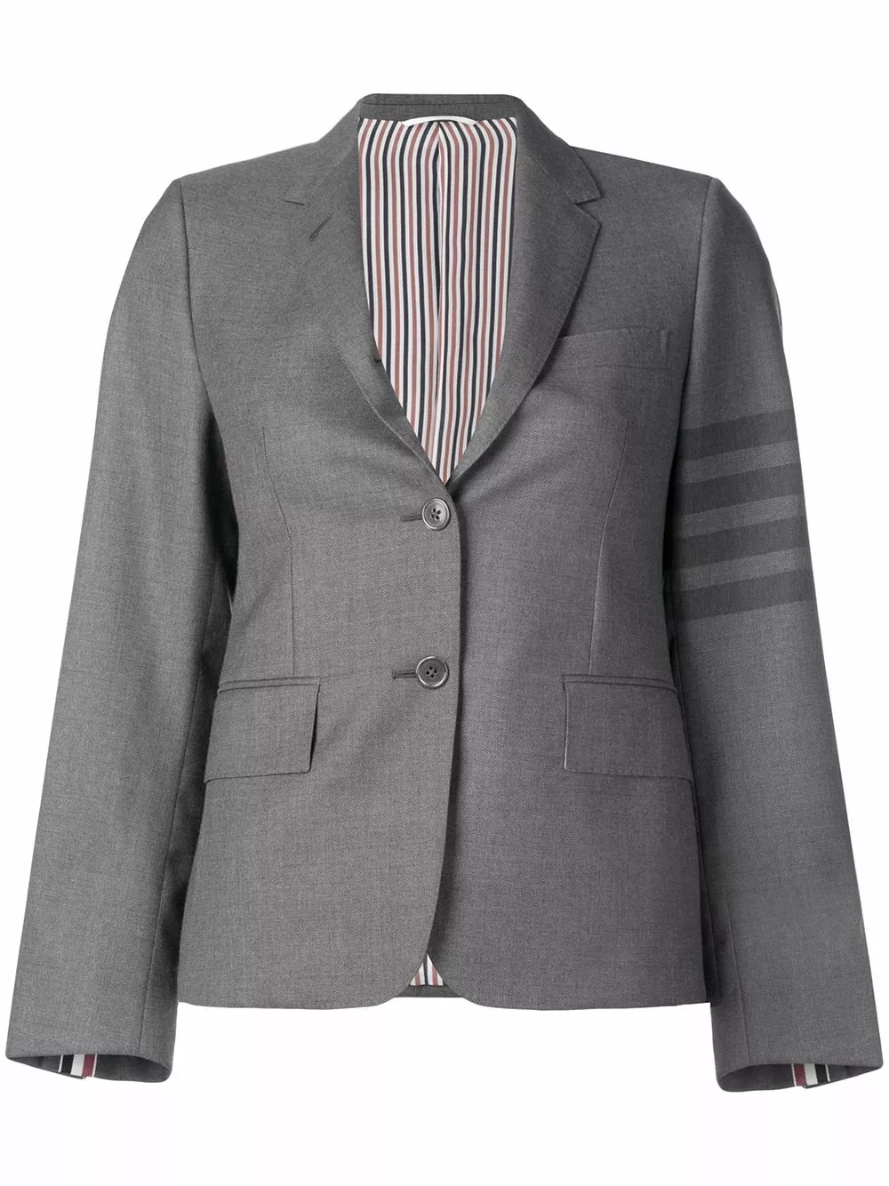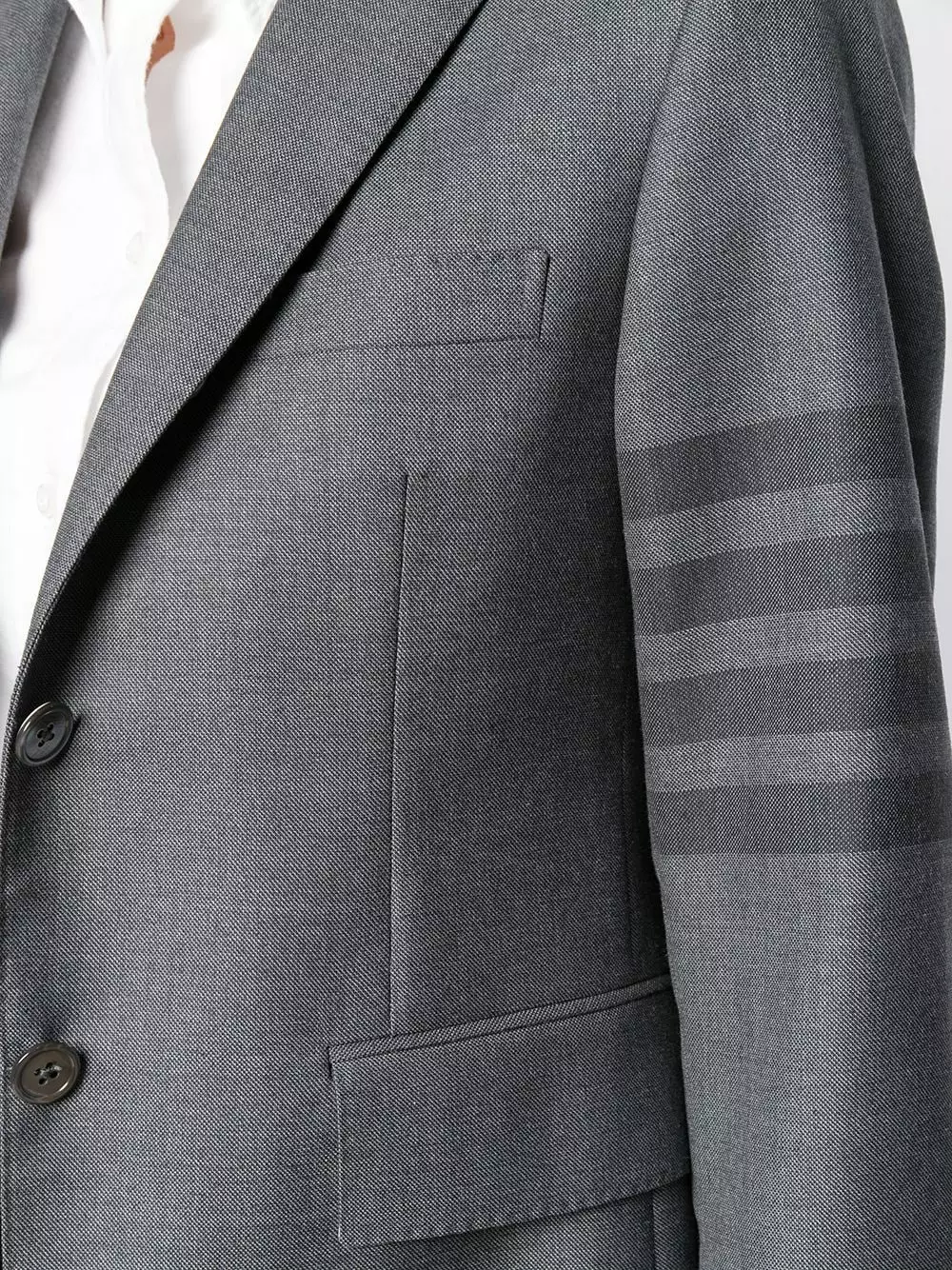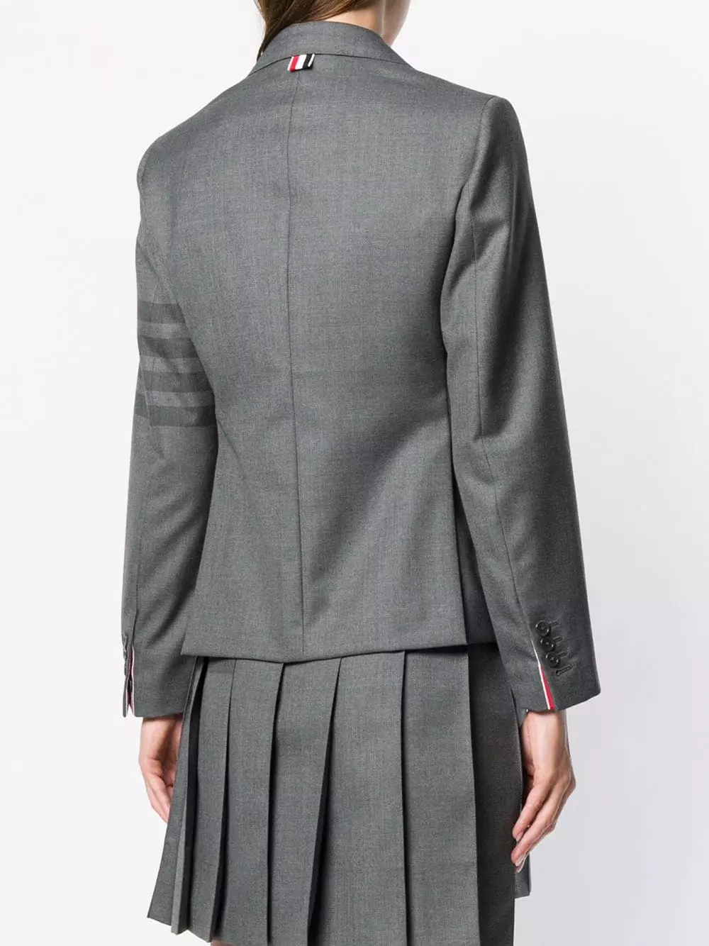 Grey wool 4-Bar tailored blazer from Thom Browne featuring notched lapels, a front button fastening, long sleeves, button cuffs, front flap pockets and a double vent to the rear.
