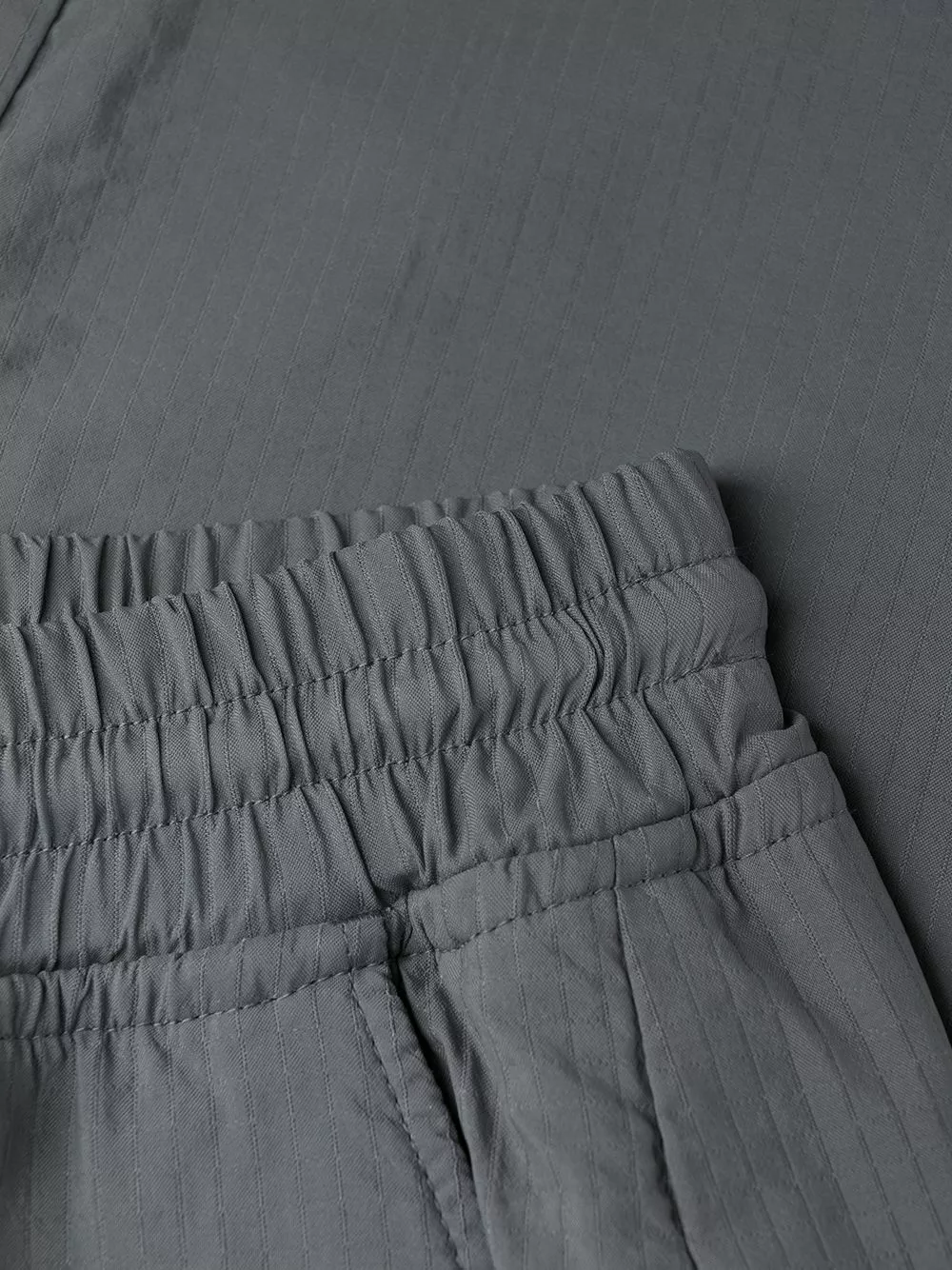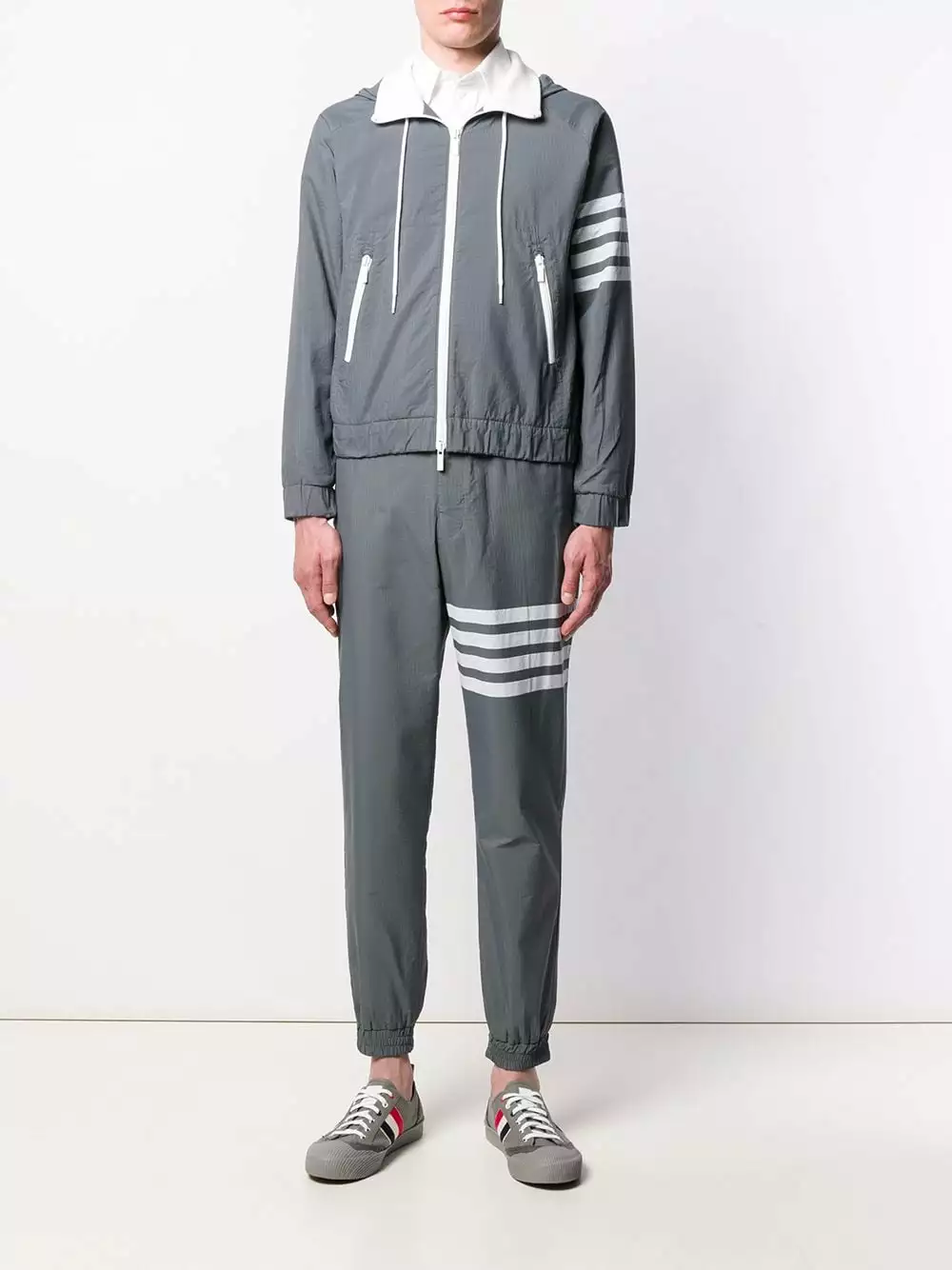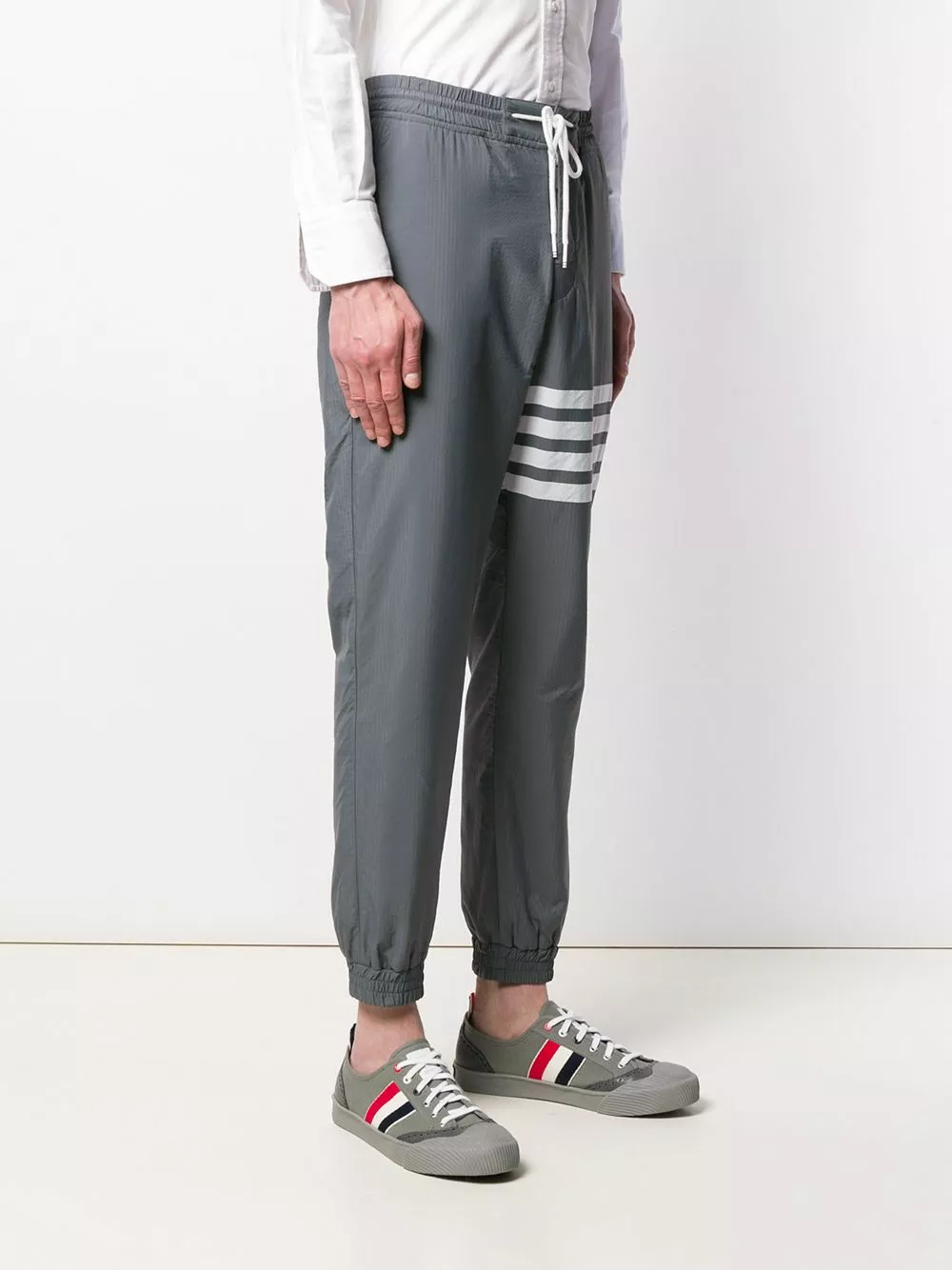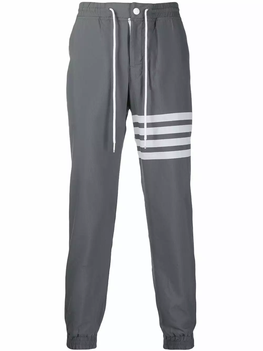 Looking for classic wardrobe pieces with a distinctive edge? Thom Browne will give you an easy route. These medium grey engineered 4-bar track pants from Thom Browne feature an elasticated drawstring waist, side slit pockets, a tricolour tab to the back, a slim leg with gathered ankles and the signature 4-Bar stripes to the left thigh.