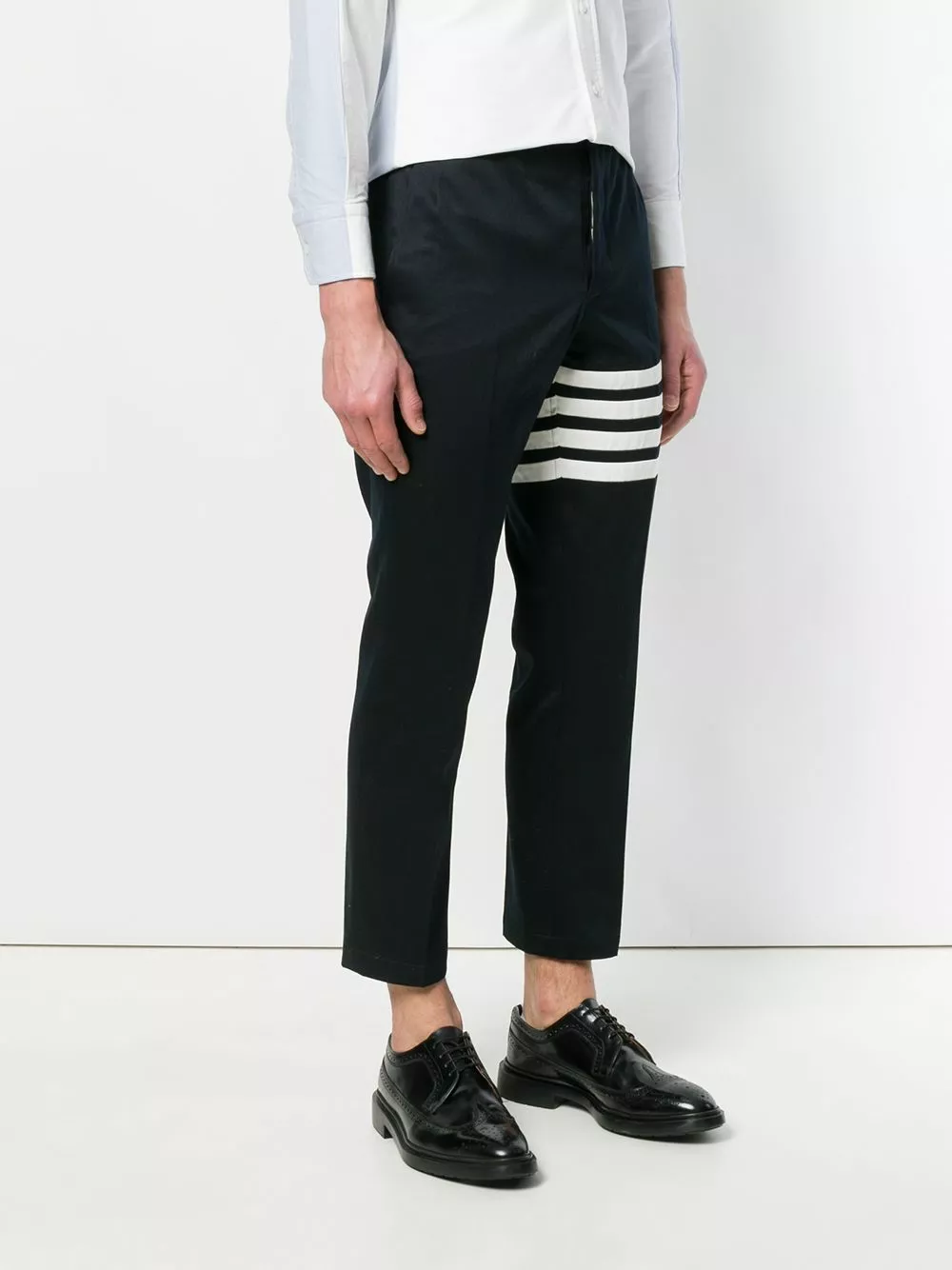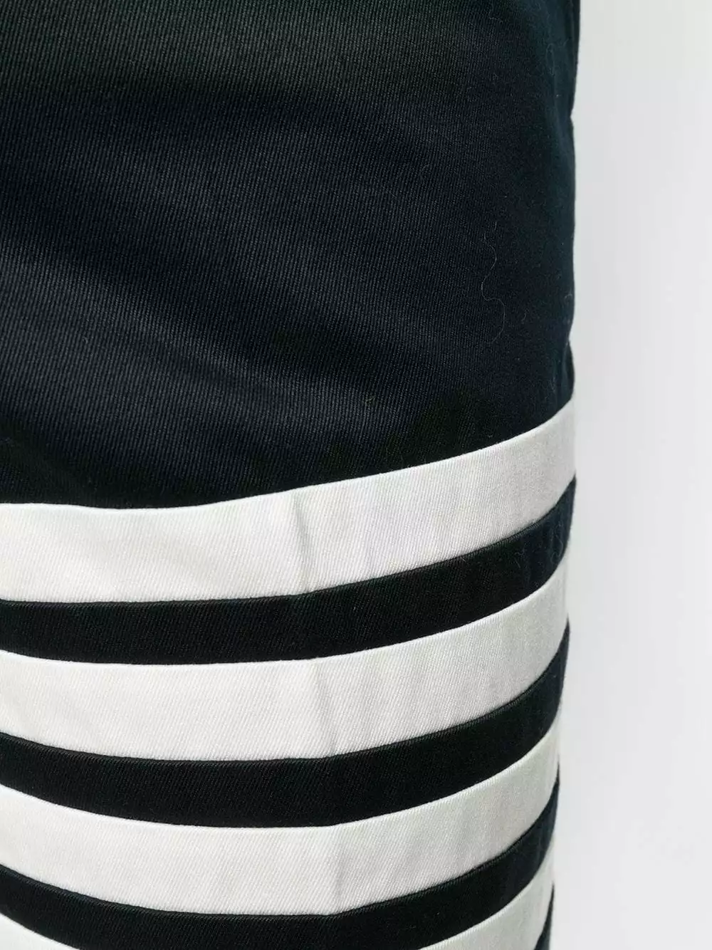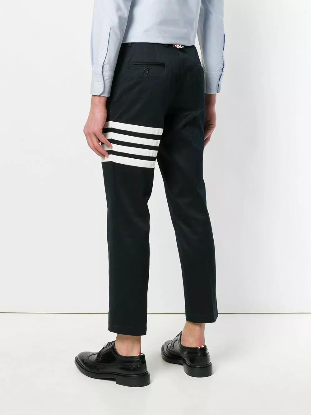 Business and pleasure combine in these trousers from Thom Browne. In a relaxed shape and a cotton twill construction – this pair looks just as at home in an important meeting as they do at your favourite bar. Just don’t bring your cocktail to work. Featuring a mid-rise, a slim fit, a button and zip fly, a waistband with belt loops, side slit pockets, two back buttoned welt pockets, creases, cropped, a signature tri-colour striped trim and sporty stripes at the left leg.