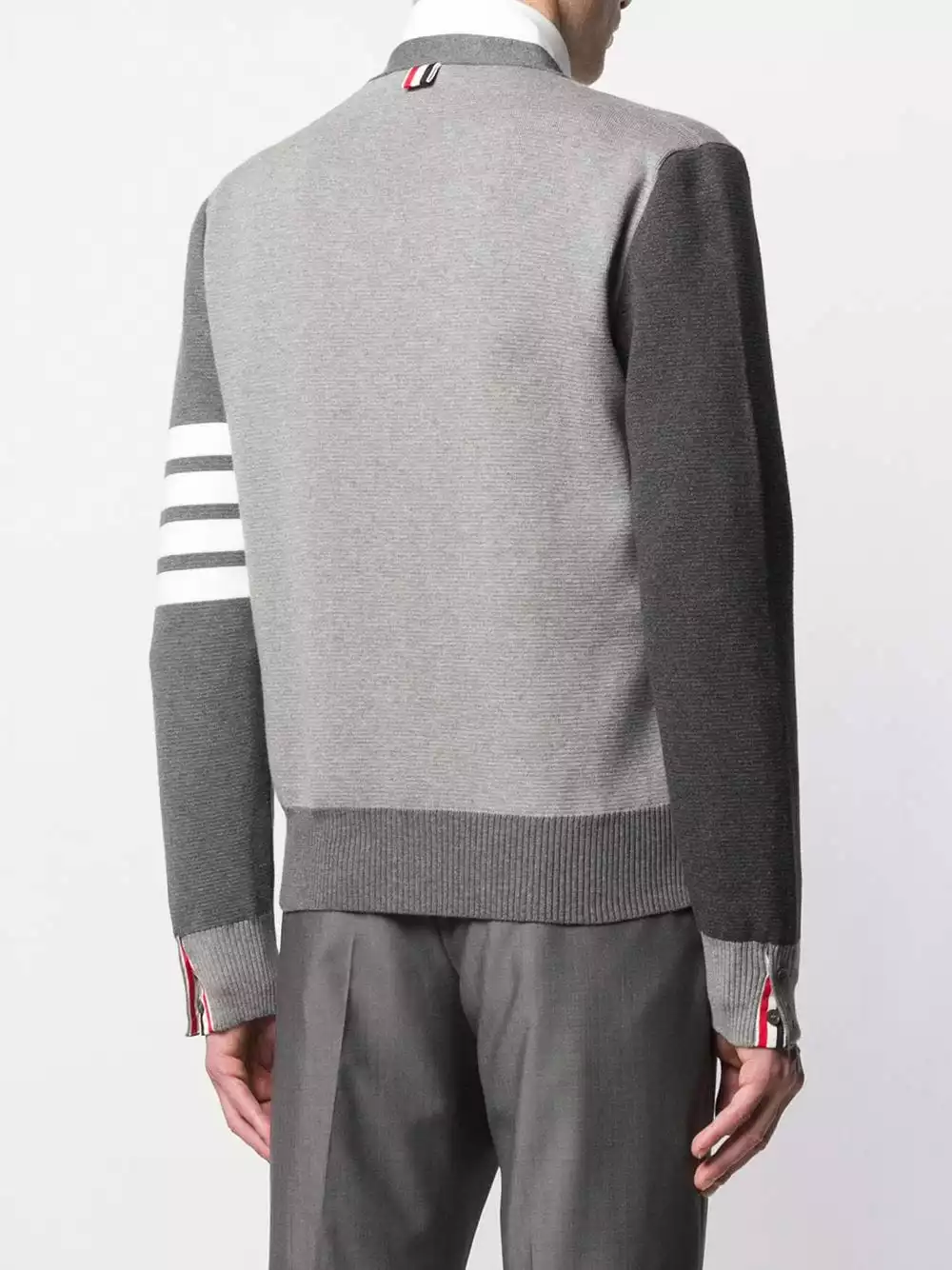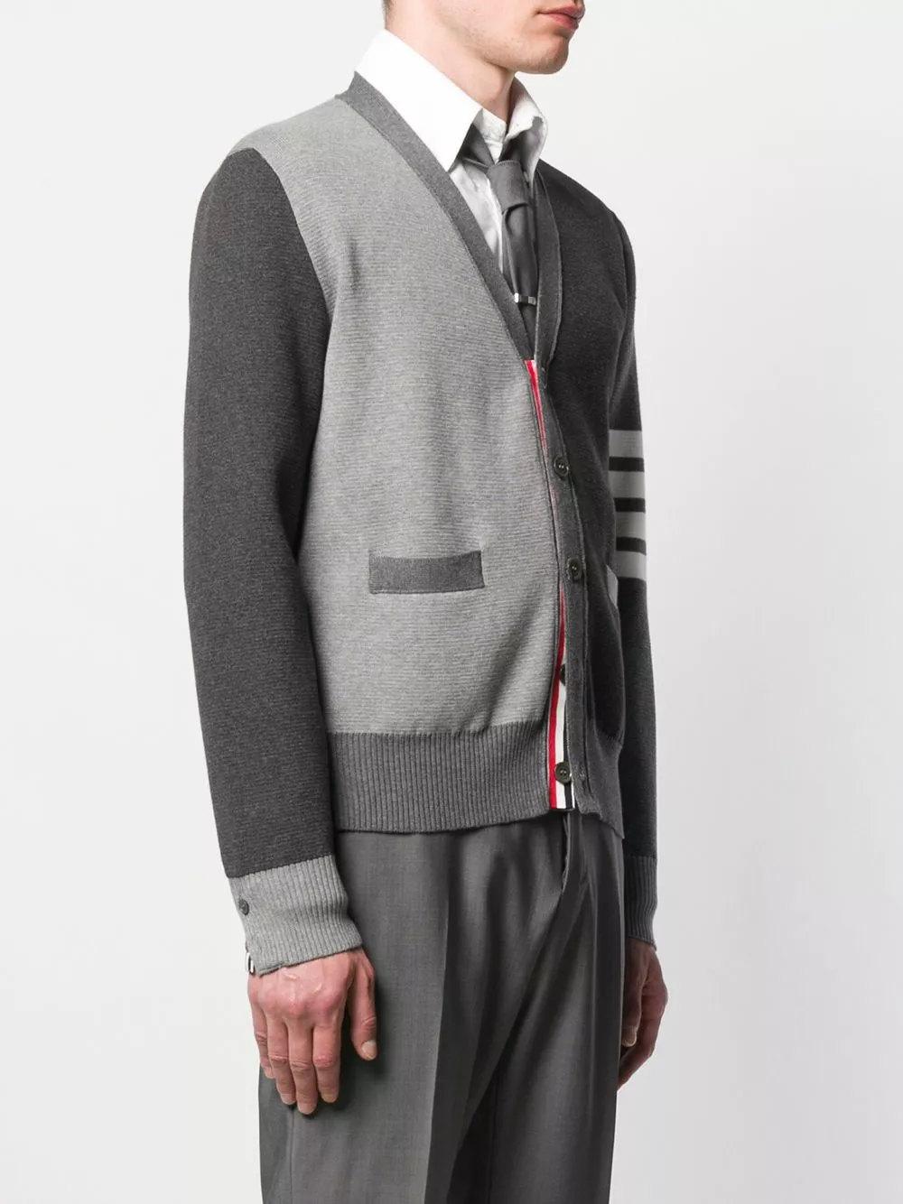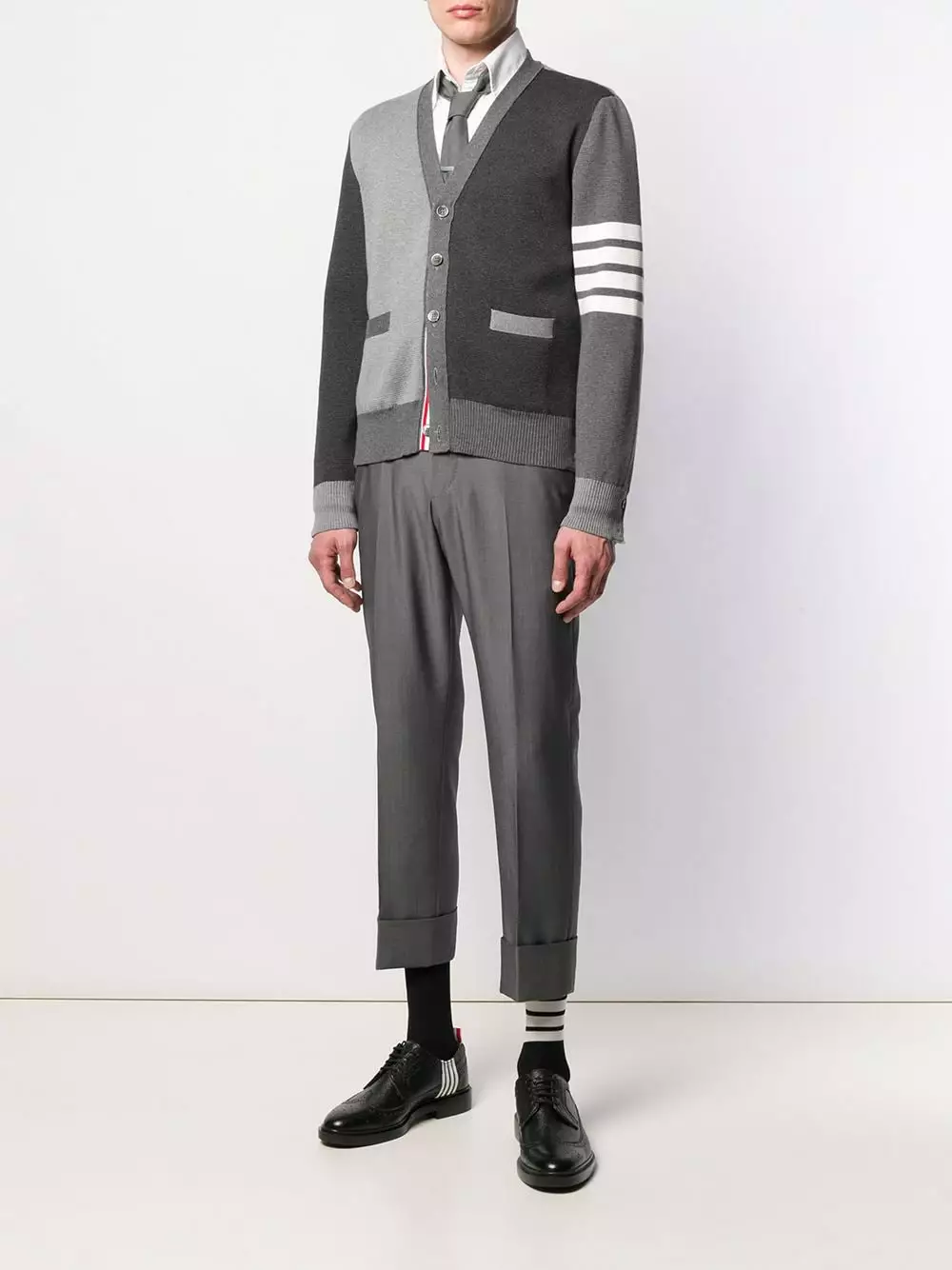 Thom Brown’s expertise in technical, tailored and luxuriously fabricated aesthetic is clearly evident in this cotton 4-Bar V-neck cardigan. Featuring a v-neck, a front button fastening, long sleeves, a ribbed hem and cuffs, two front pockets, a tonal design and a 4 bar detail.