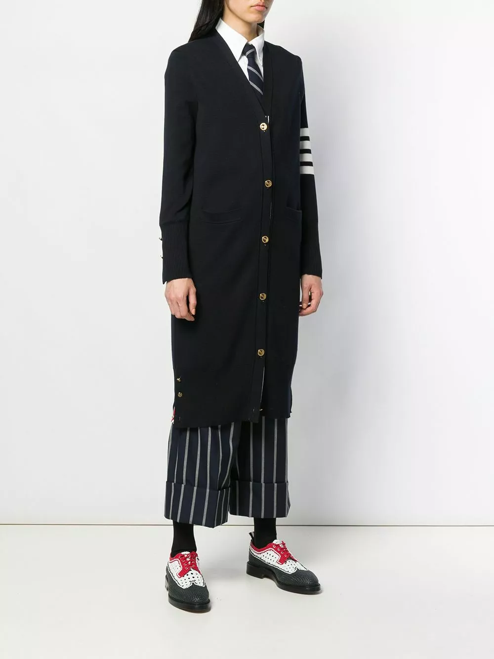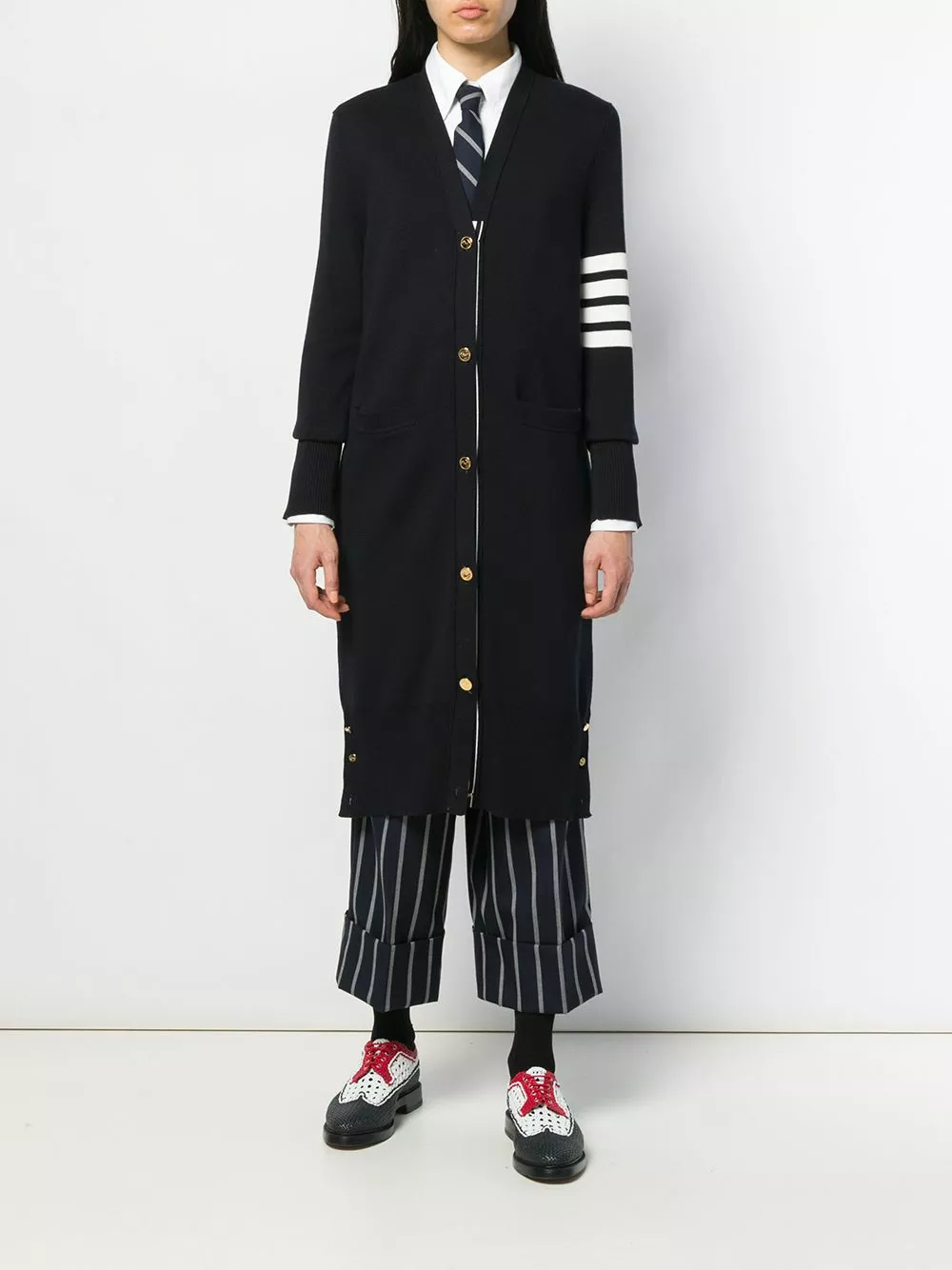 Sometimes, you don’t want to choose between comfort and style. This 4-Bar v-neck long cardigan from Thom Browne is for those times. Refuse to compromise. Featuring a v-neck, a front button fastening, long sleeves, button cuffs, a side button fastening, a ribbed hem and cuffs, a mid-length, a signature grosgrain loop tab and a 4-Bar stripe.