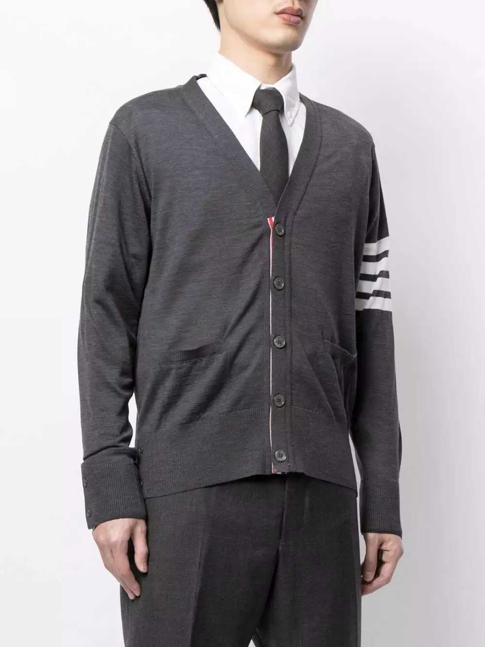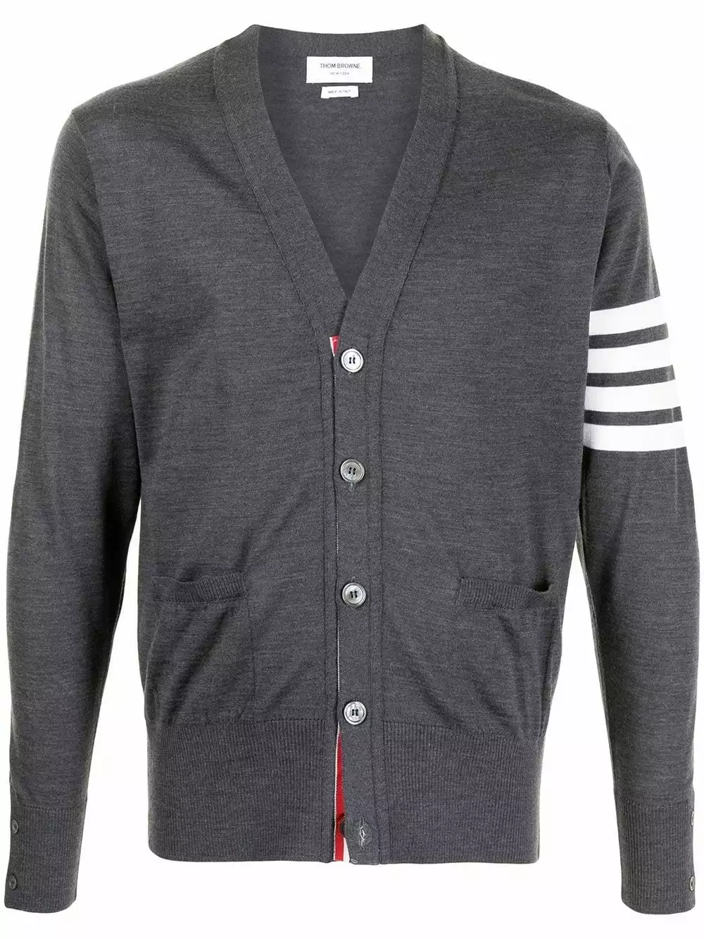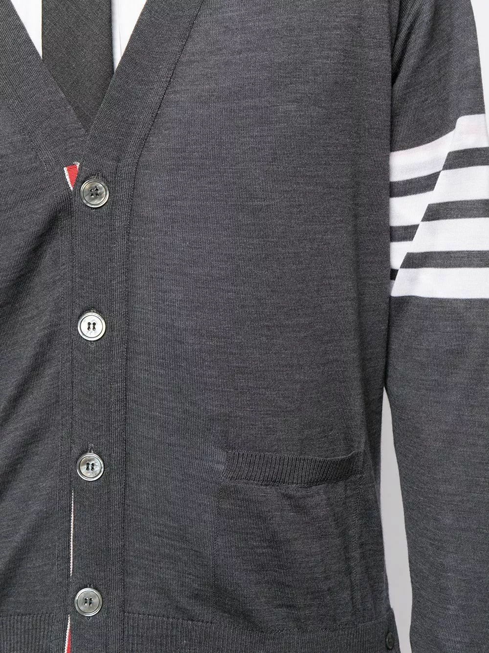 Thom Browne solves all your seasonal knitwear problems with this V-neck cardigan. Crafted from merino wool in a fine knit, this buttoned piece is detailed with the signature 4-Bar stripe and RWB stripe trim. Perfect for wearing year in, year out.