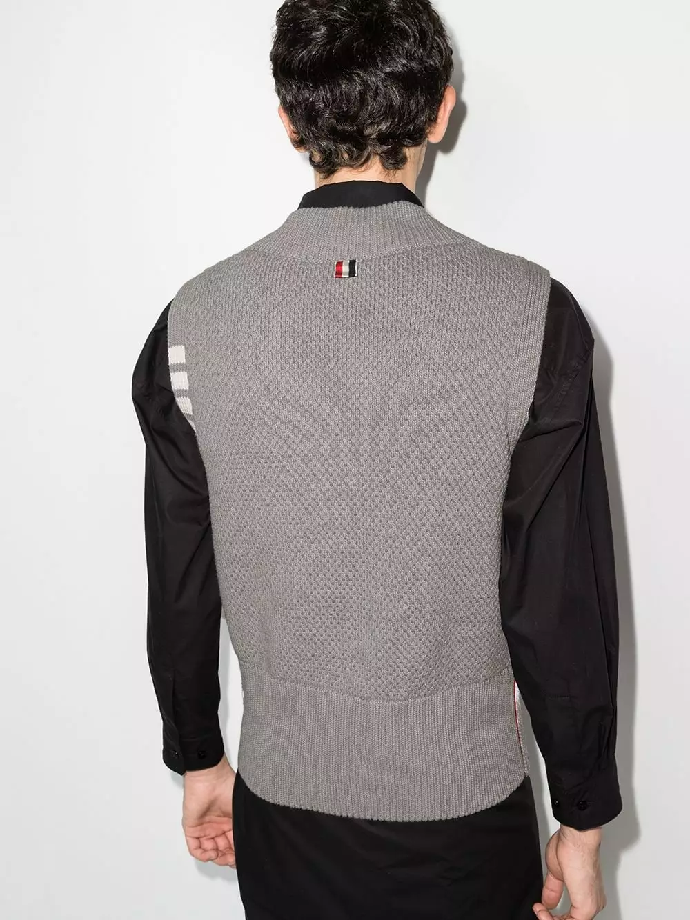 Thom Browne infuses its signature motifs in this light grey knitted vest. Boasting a 4-bar motif at the shoulder and an RWB striped at the side and rear, this SS22 pick features a V-shaped neckline and is cut for a relaxed fit.