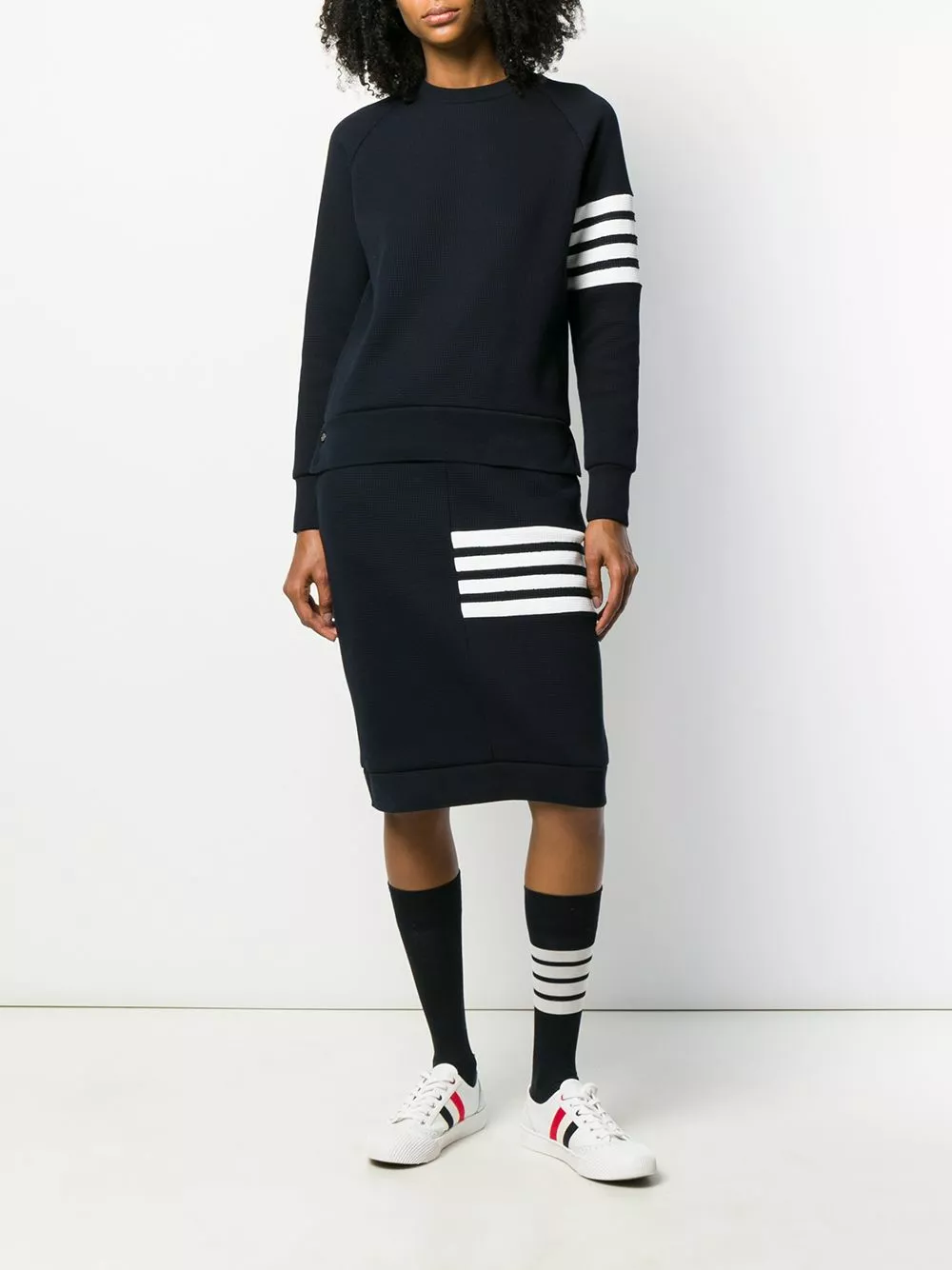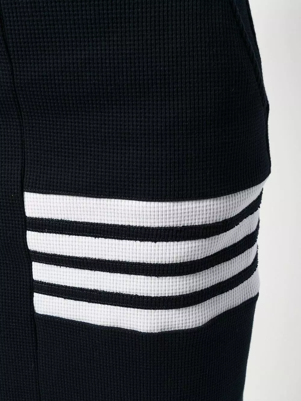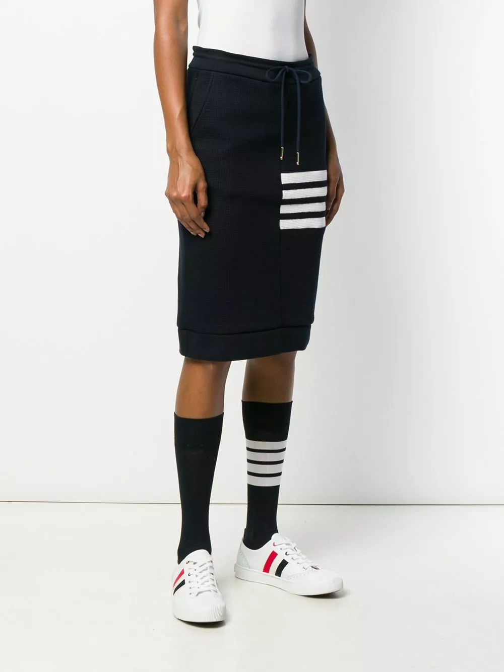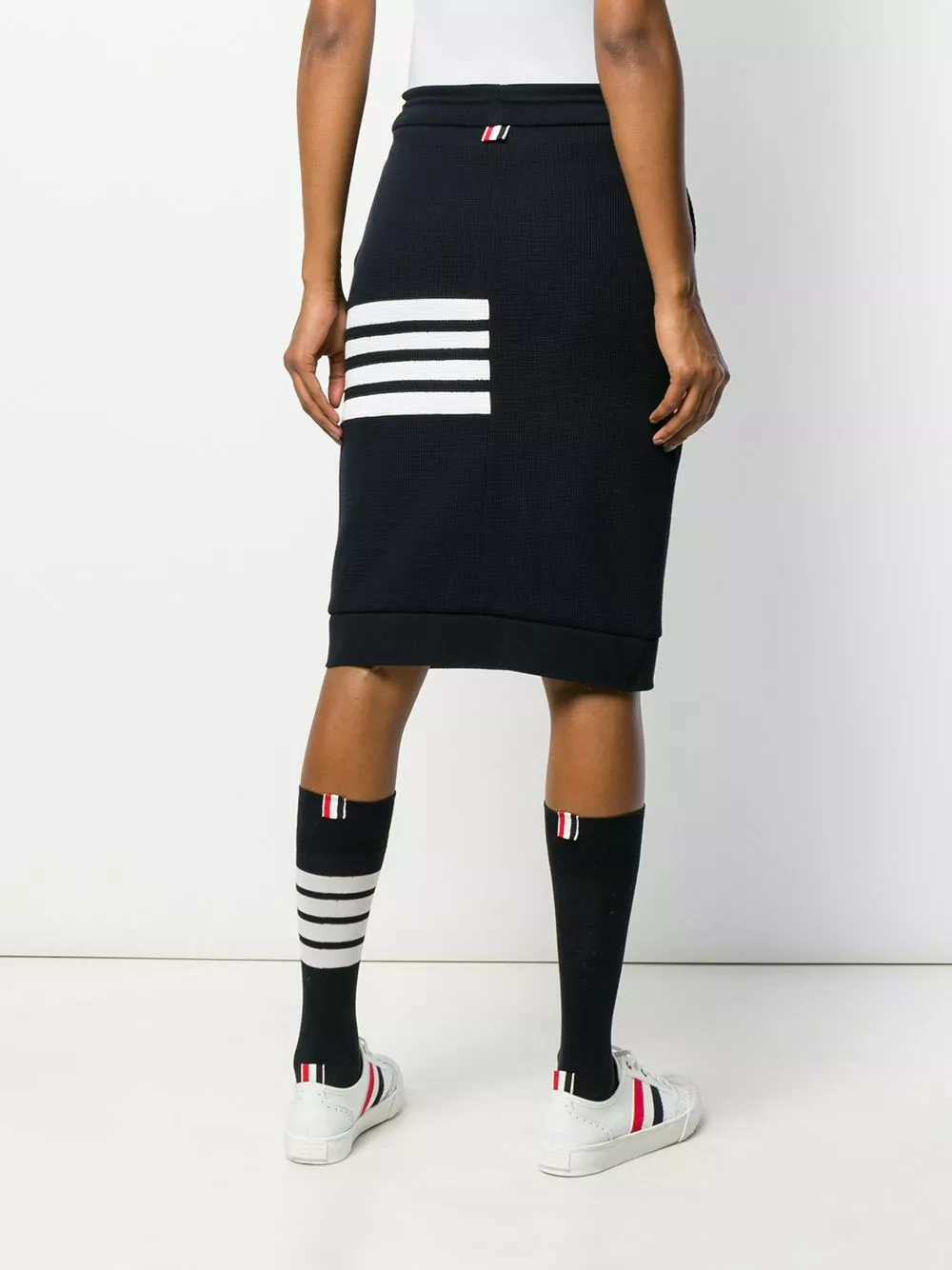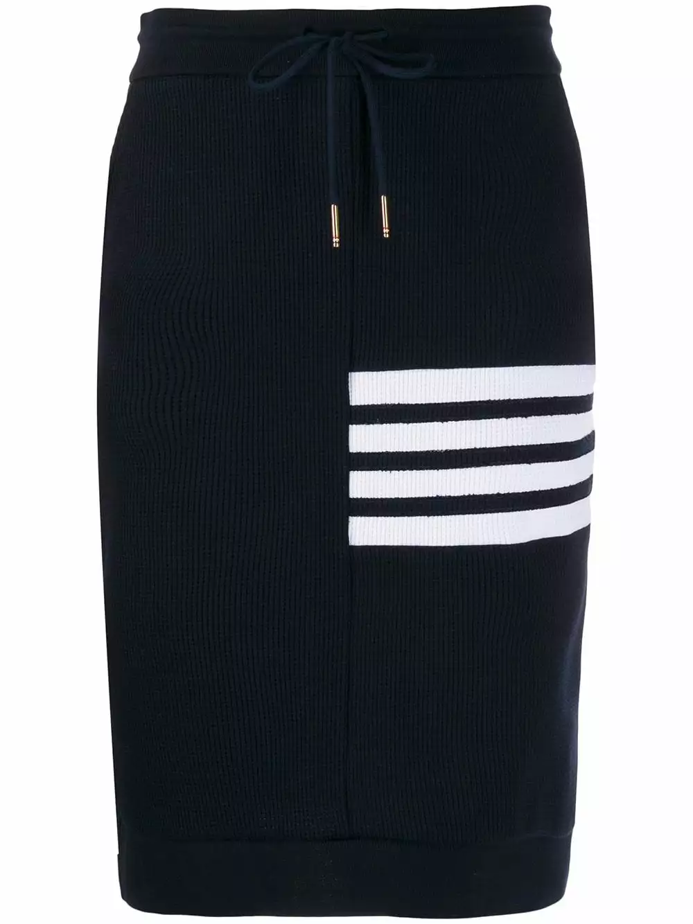 Is a sports-look right up your street? Win the style game with this 4-Bar waffle knit sack skirt from Thom Browne. No running or catching balls required! Featuring a high waist, a drawstring waist, side slit pockets, a textured style, a mid-length, a signature three stripe detail, a mid-length, a signature grosgrain loop tab and a 4-Bar stripe.
