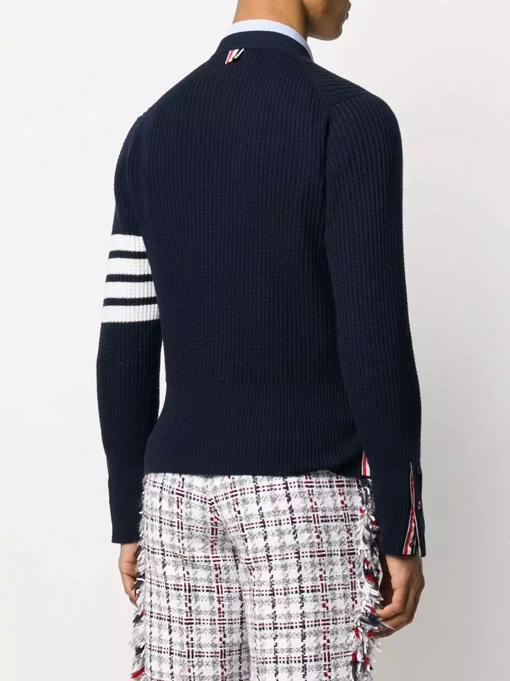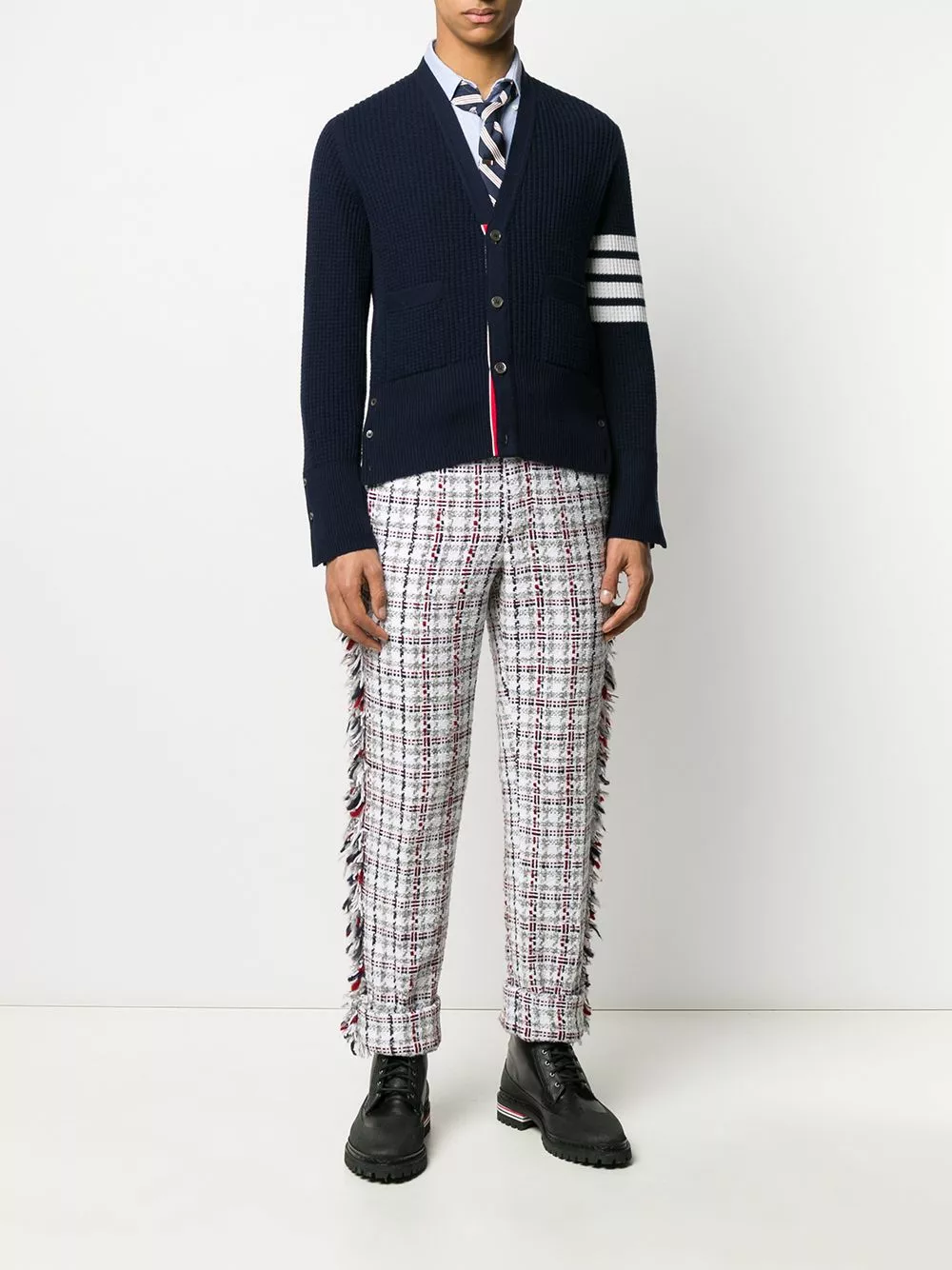School uniform vibes…but make it fashion. This preppy piece features the brand’s signature 4-Bar stripe to the sleeve, for maximum impact. A cashmere cardigan is always a great choice. Featuring a v-neck, a ribbed design, a front button fastening, two front pockets, long sleeves, button cuffs and a 4-Bar stripe.