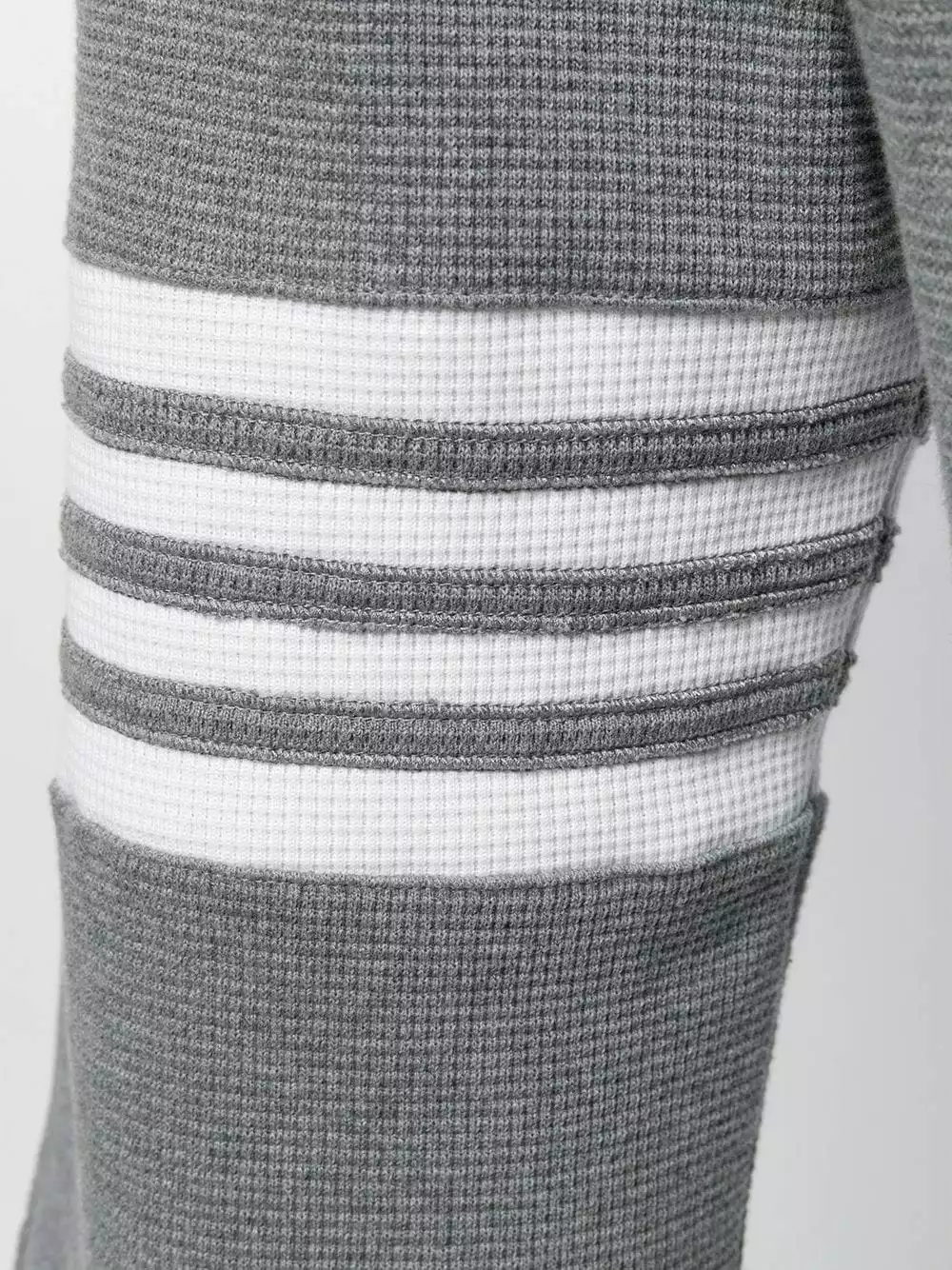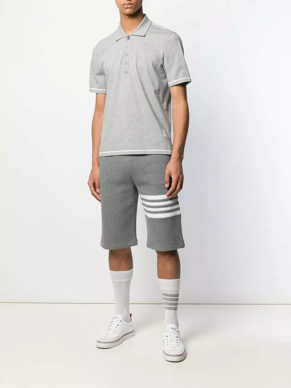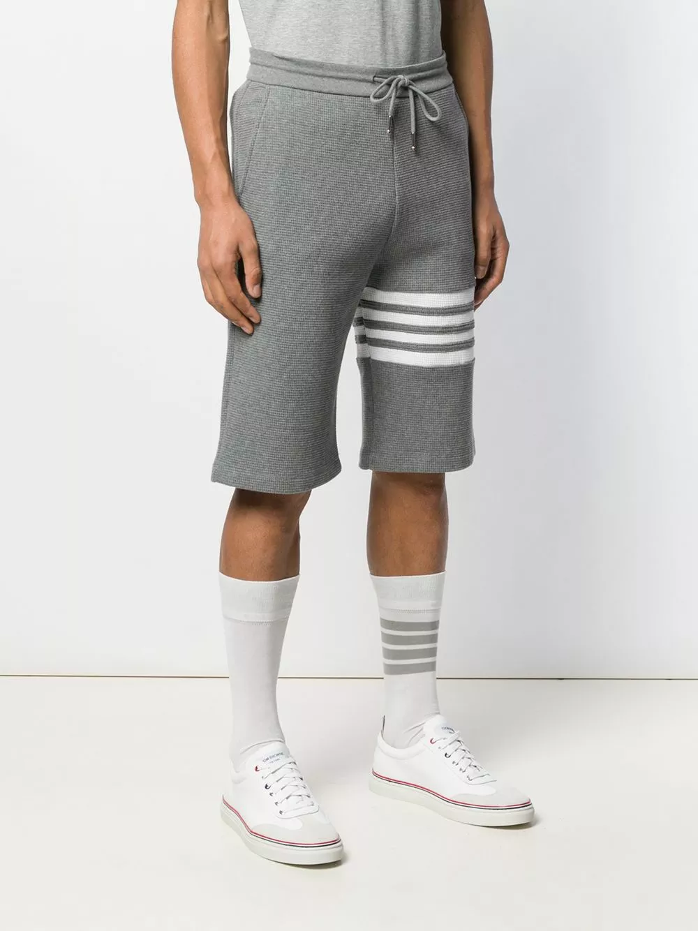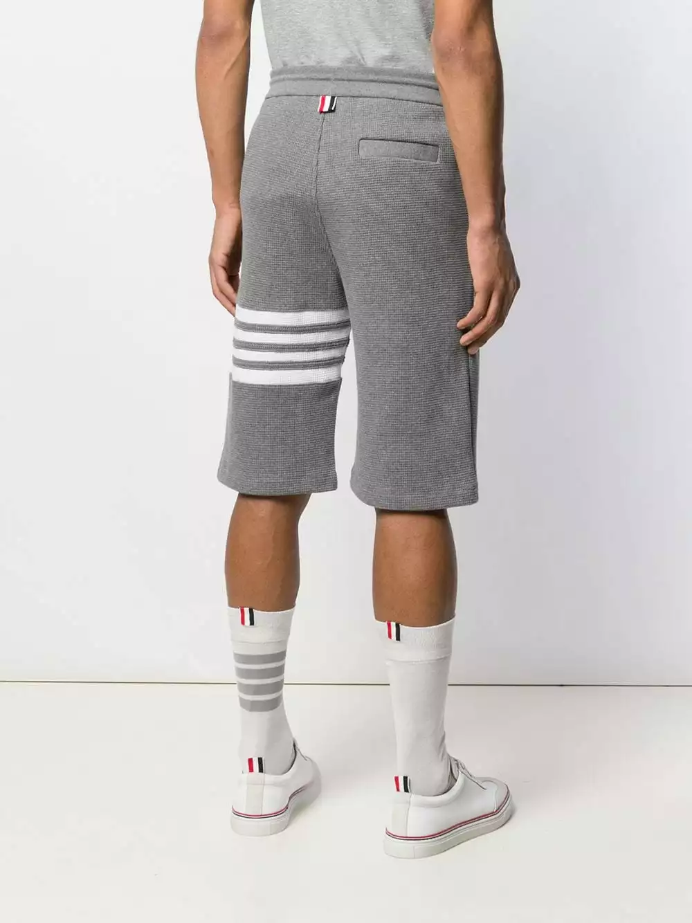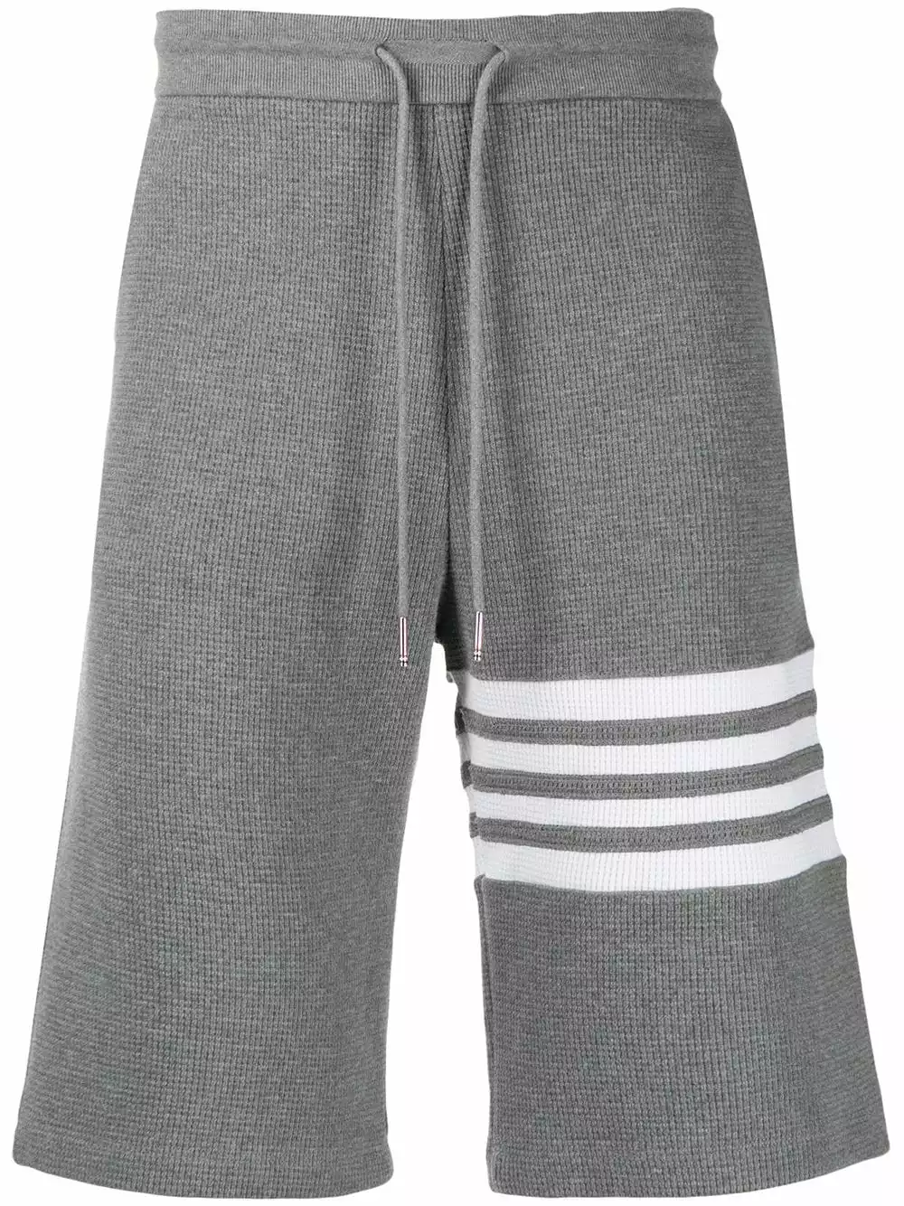Thom Browne’s expertise in technical, tailored and luxuriously fabricated aesthetic is clearly evident in these medium grey cotton waffle stitch 4-bar stripe track shorts from Thom Browne. Featuring an elasticated drawstring waist, side seam pockets, a back pocket and a 4-bar stripe detail.