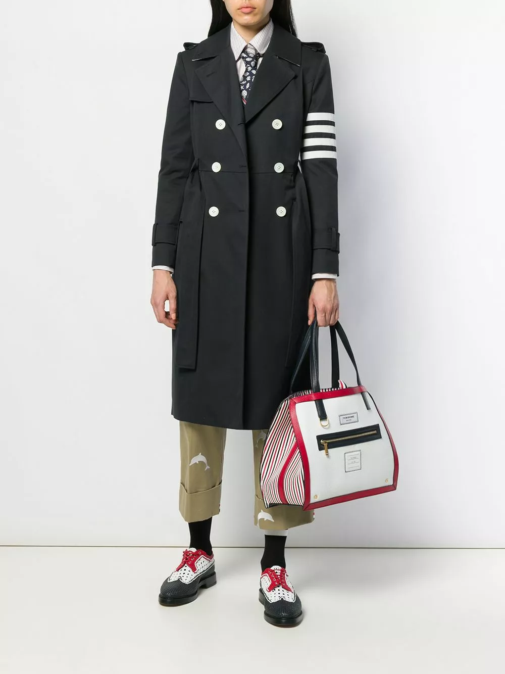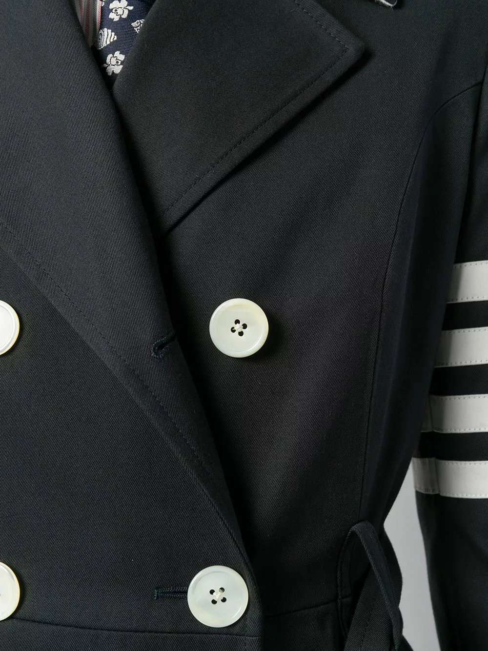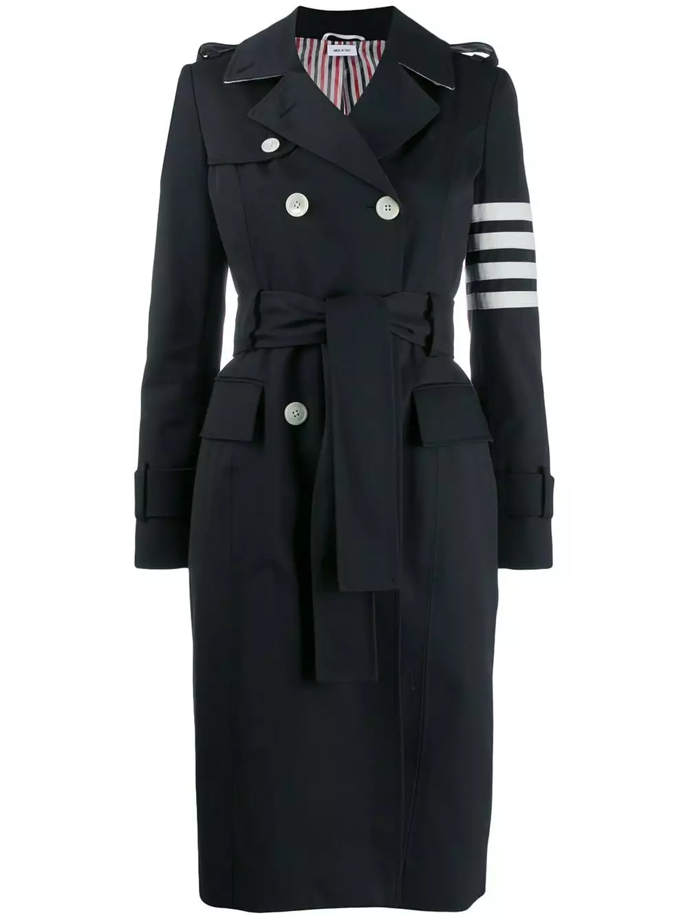 Looking for a piece that you can rely on? This navy cotton twill 4-Bar waterproof trench from Thom Browne is never gonna give you up. It’s also never gonna let you down. Featuring classic lapels, a double breasted front fastening, epaulettes on the shoulders, flap pockets, a belted waist, long sleeves, button cuffs, a rear central vent, a mid-length, a signature grosgrain loop tab, RWB stripes and a white 4-Bar stripe.