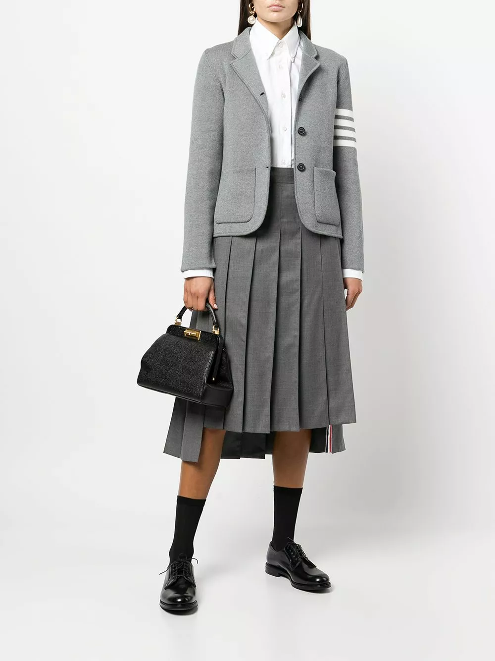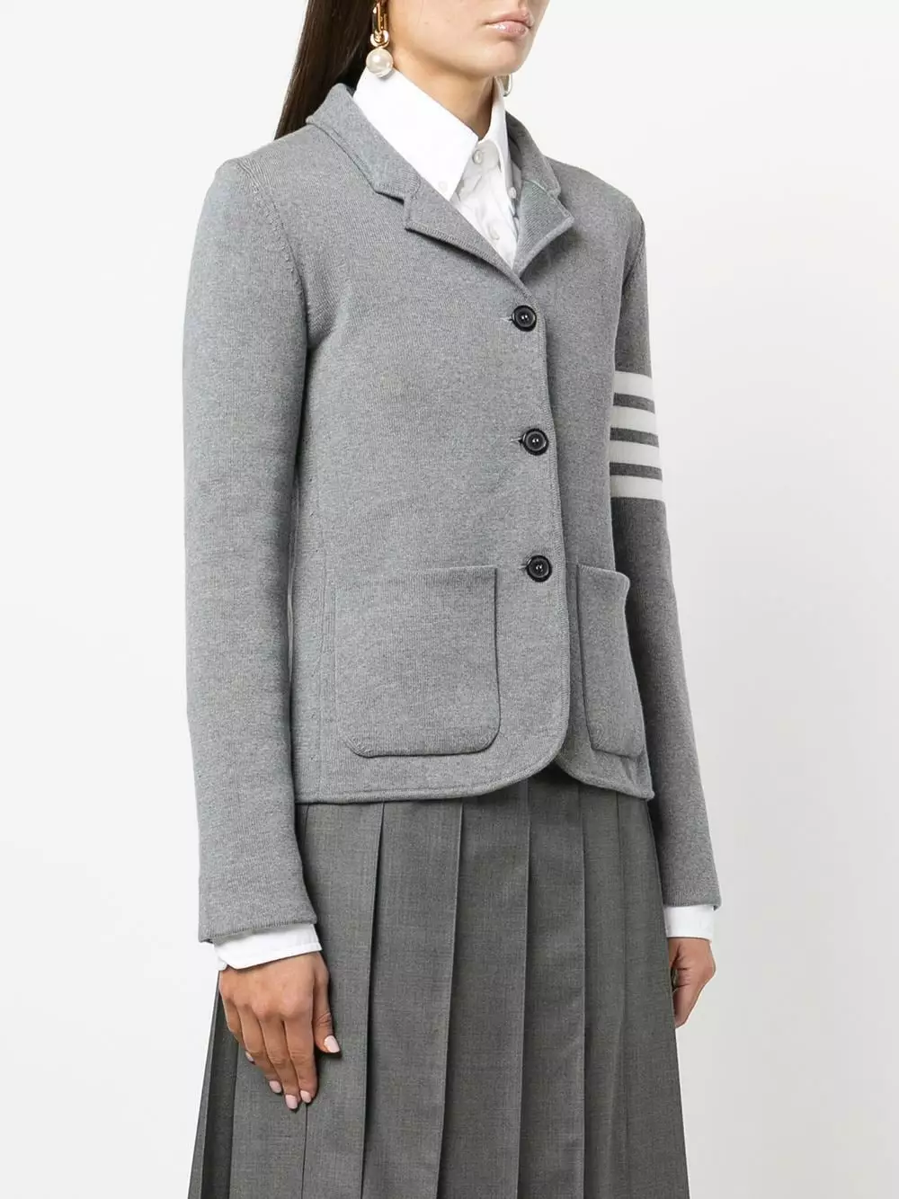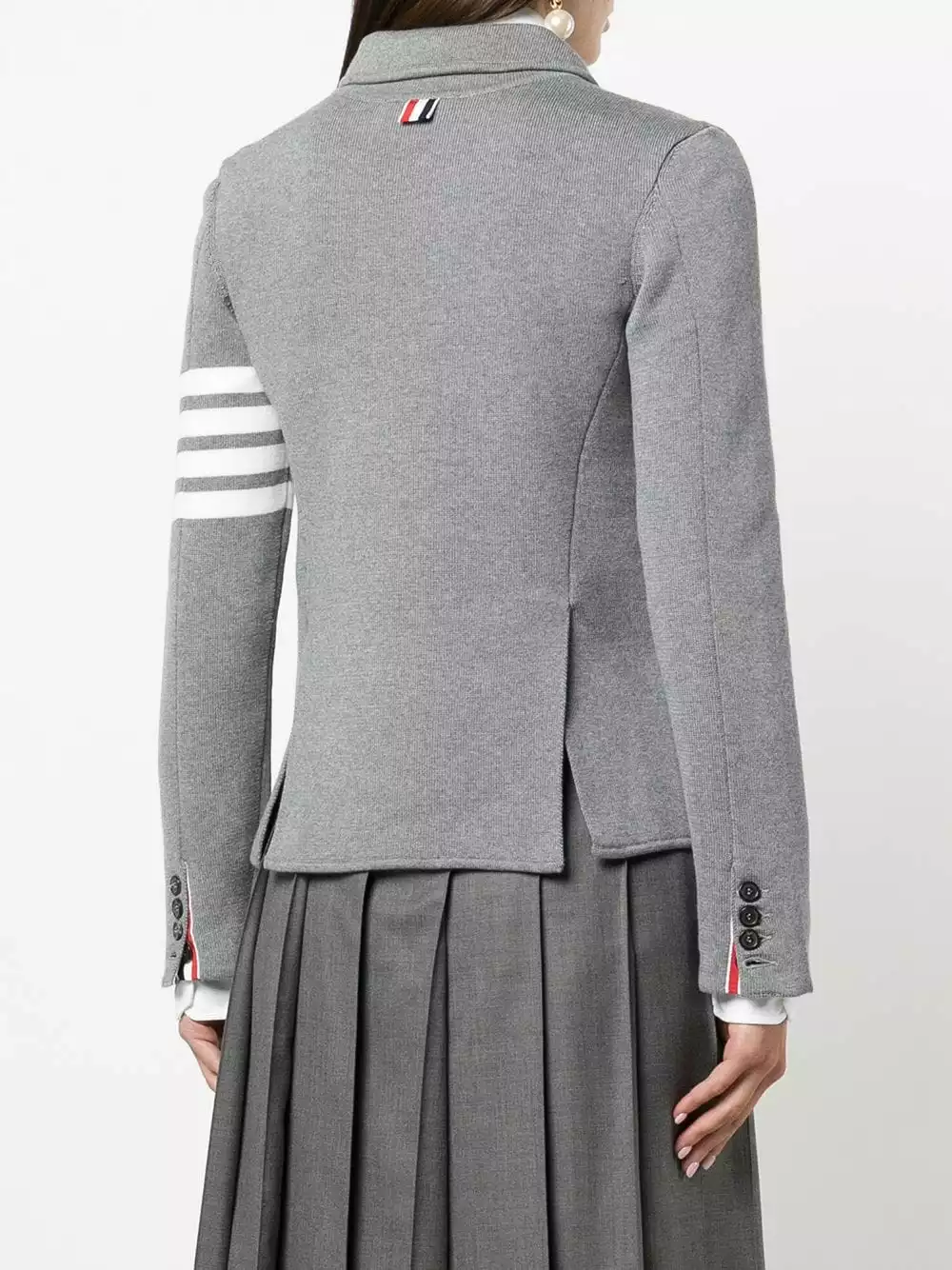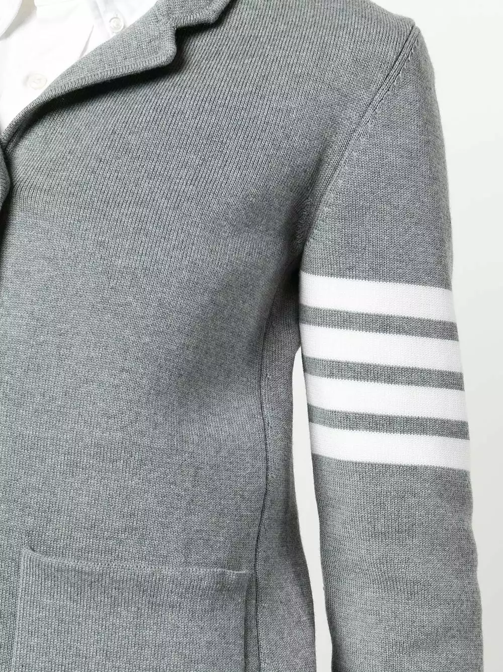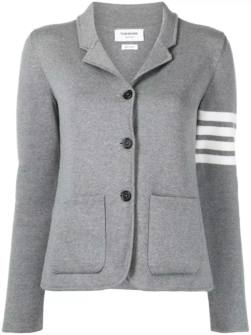 Spun from soft merino wool, Thom Browne presents this single-breasted jumper as part of its AW21 offering. Presented in a smoke-grey hue, the left sleeve is circled by the brand’s signature 4-Bar motif.