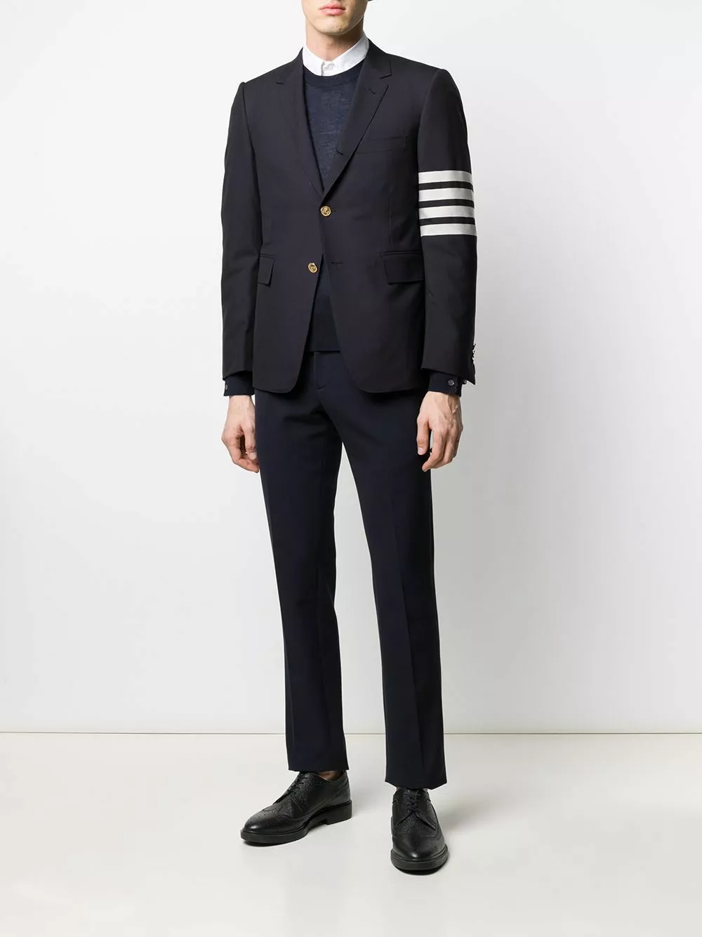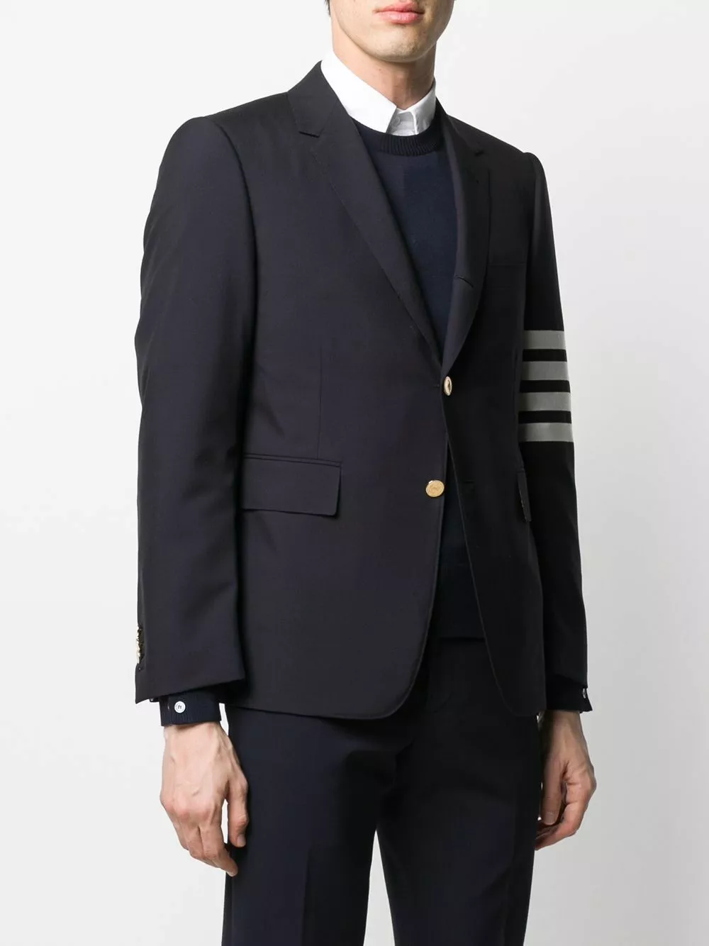 Looking to smarten up your everyday? Thom Browne’s 4-Bar wool sport coat could be just what you need. Fabricated in Italy from navy blue wool, it’s cut to the label’s signature shrunken fit. Featuring notched lapels, a front button fastening, a front button fastening, gold-tone hardware, a chest pocket, front flap pockets, long sleeves, button cuffs, a signature tri-colour striped trim, tri-stripe lining and a rear tri-stripe logo tab.