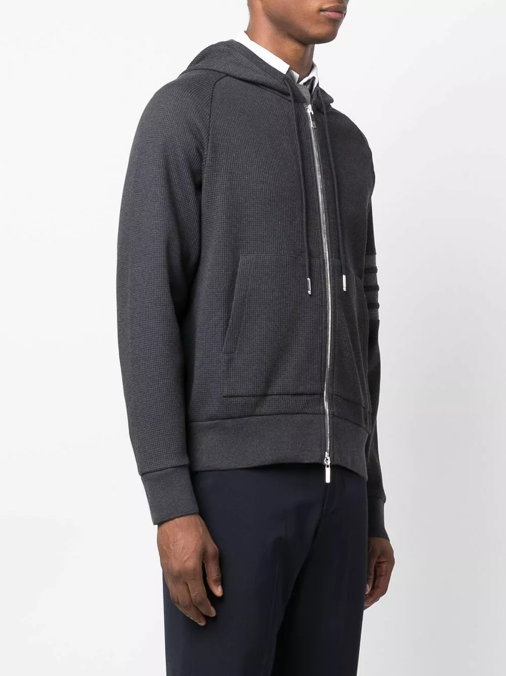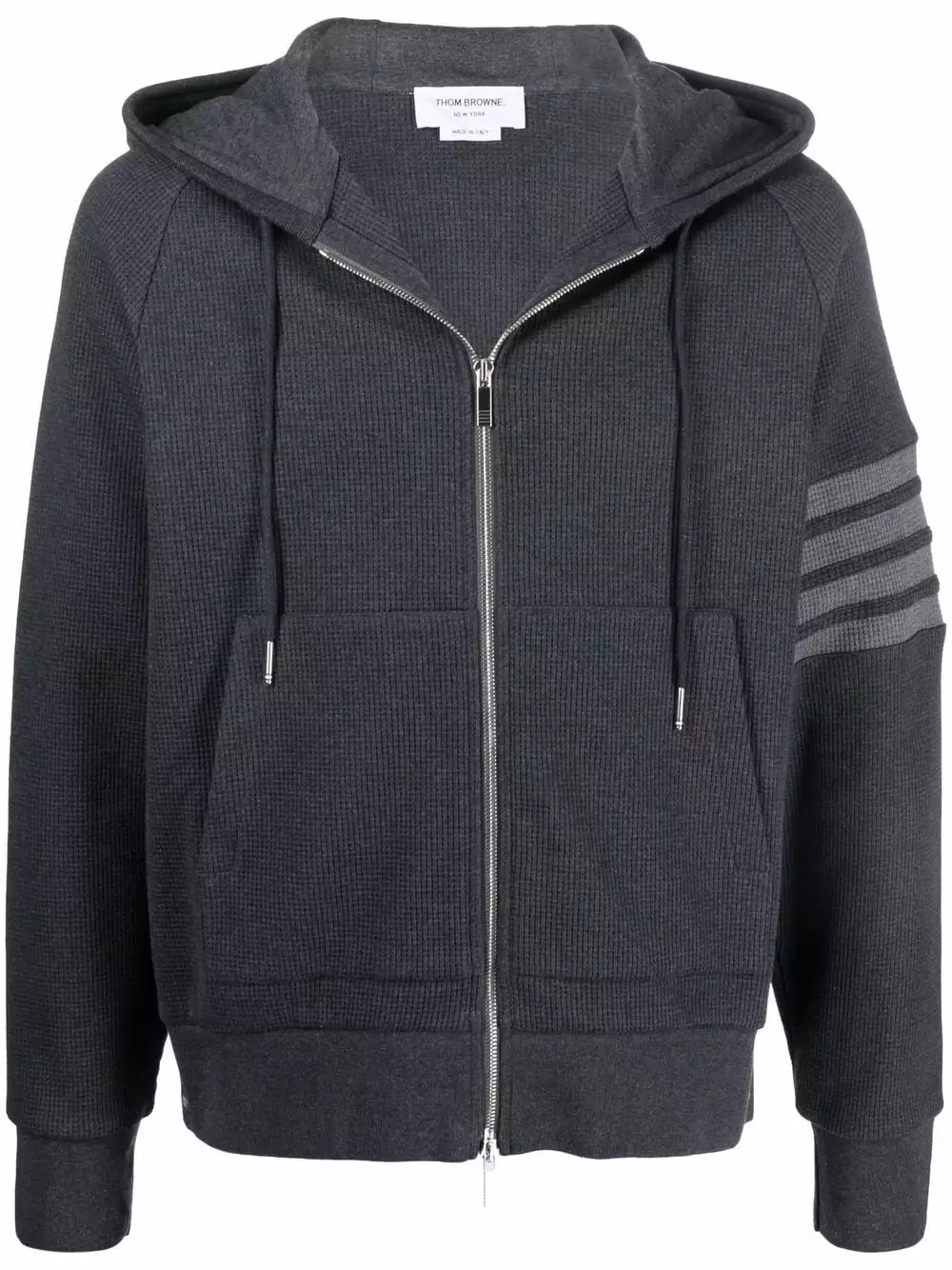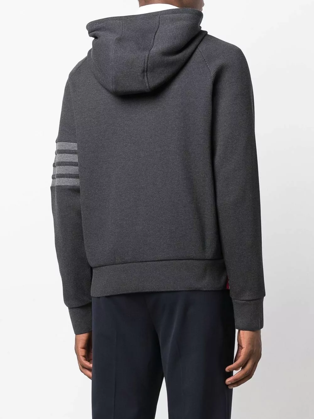 Produced in a waffle fabrication, this charcoal grey Thom Browne cotton hoodie features the brand’s signature 4-Bar stripe detailing to the sleeve.