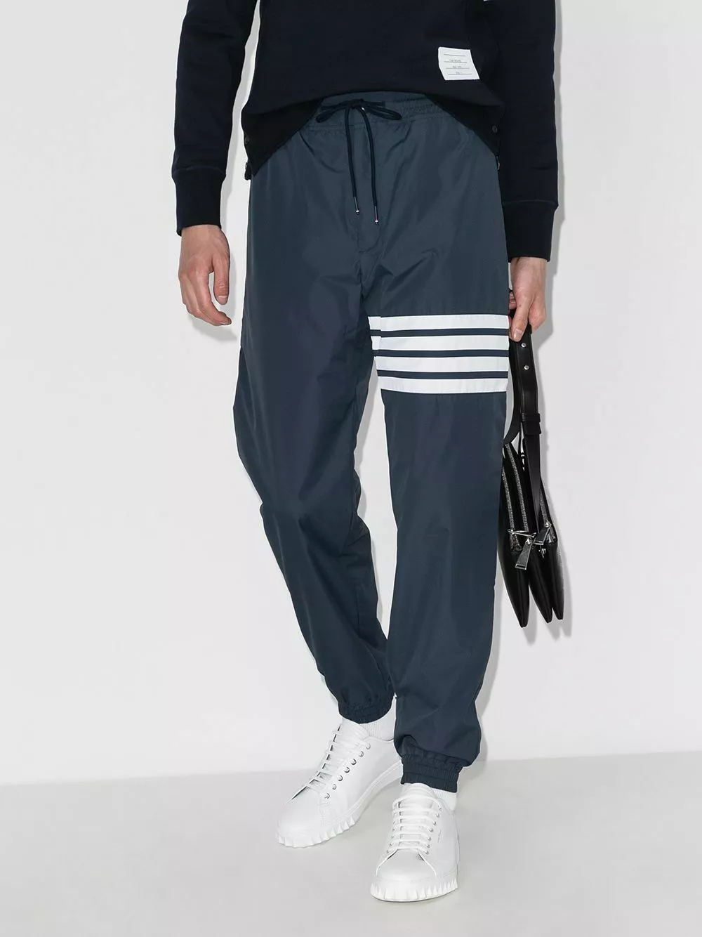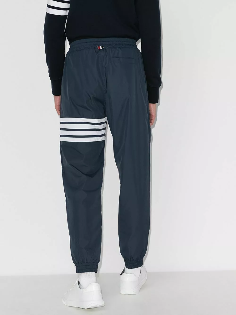 Navy blue 4 stripe flyweight track trousers from THOM BROWNE featuring elasticated waistband, drawstring fastening, two side slit pockets, elasticated cuffs and rear slit pocket.
