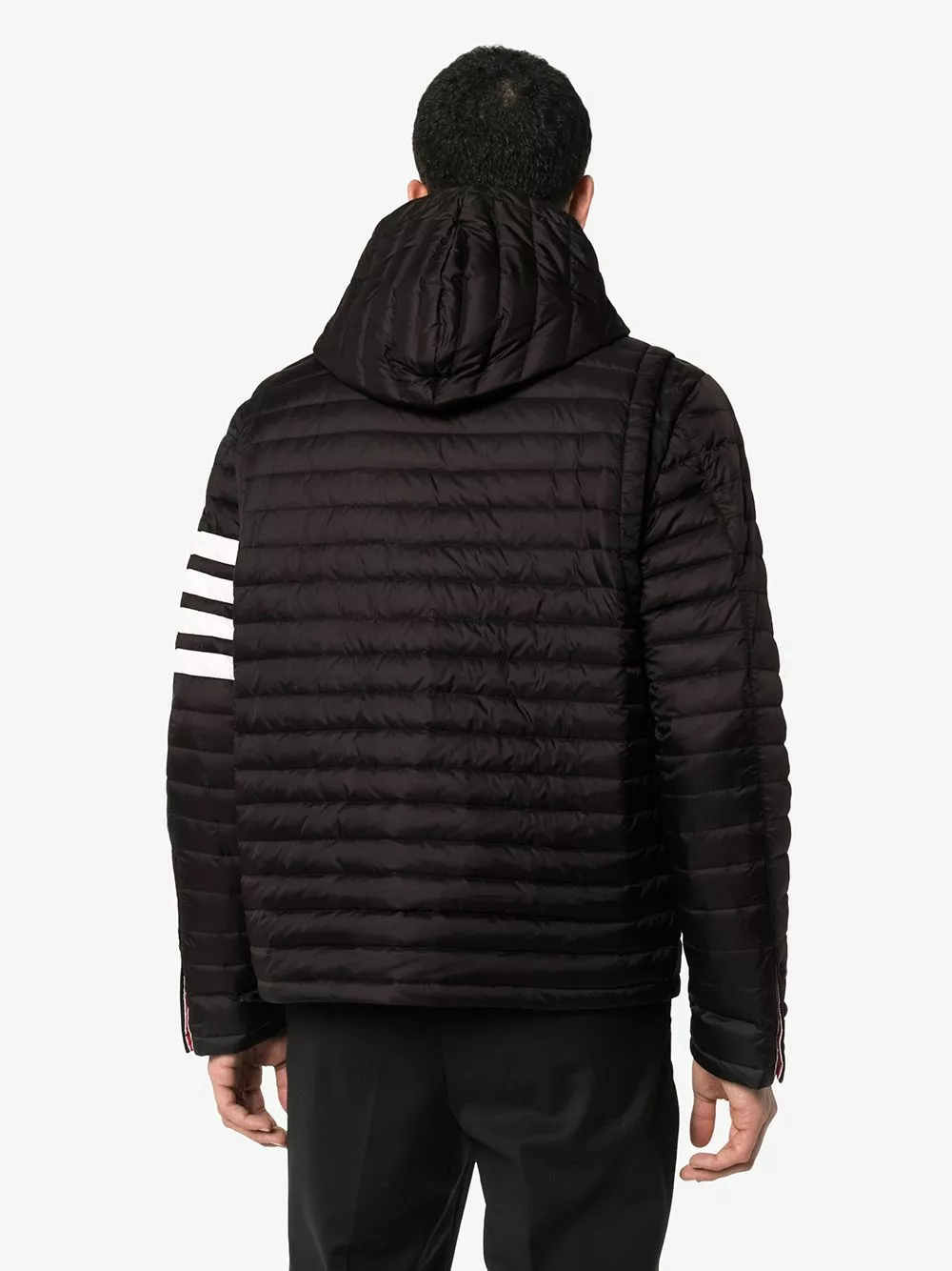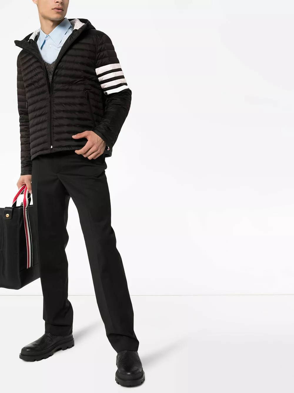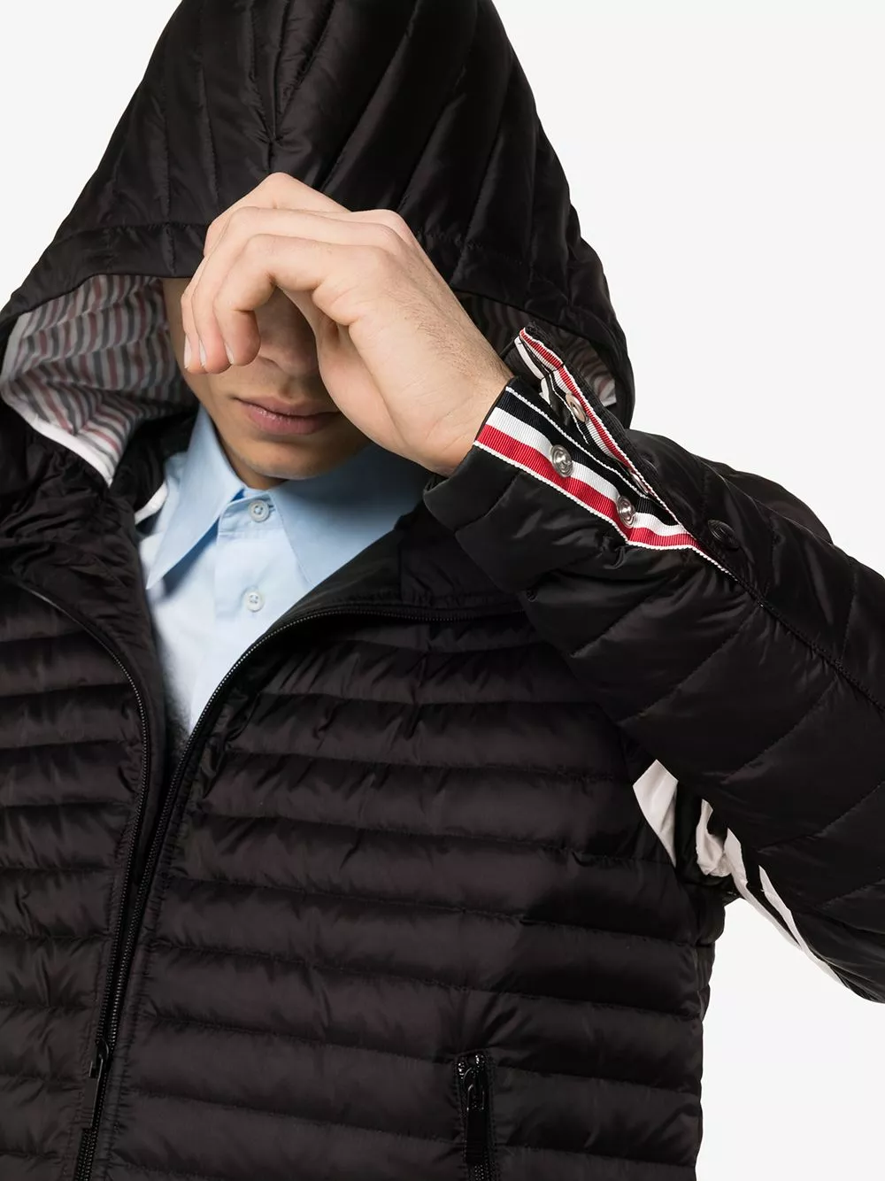 Keep yourself protected when the heavens open and it starts raining cats and dogs outside. Head out in this black 4 stripe padded jacket from Thom Browne and don’t let the weather get you down. Featuring hooded, a front zip fastening, front zipped pockets, a relaxed fit and long sleeves.