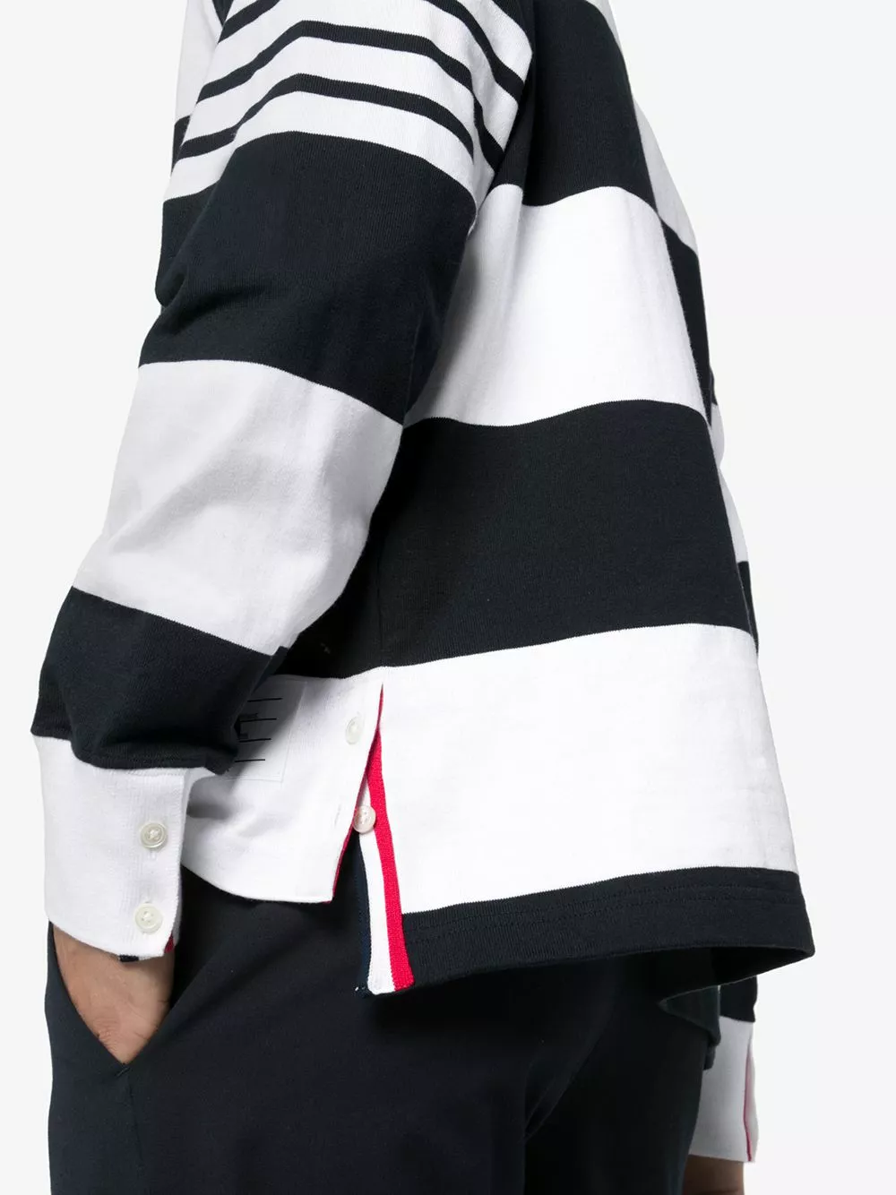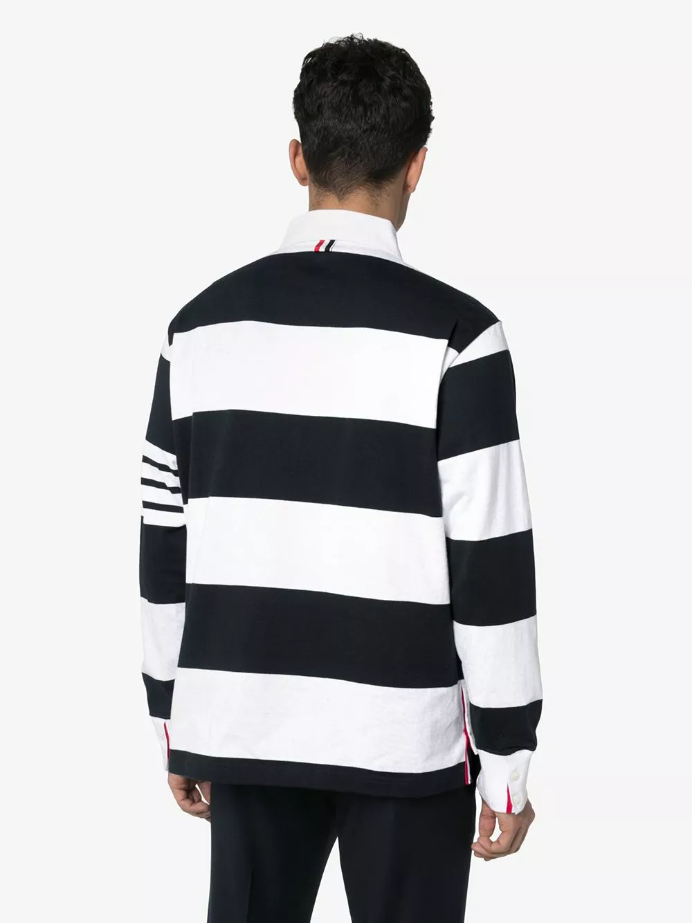 Thom Browne’s polo shirt instantly makes you think of traditional rugby styles – but cooler. It wouldn’t be complete without the brand’s 4-stripe pattern, would it? Earn your stripes and add it to your wish list. Featuring a button fastening, 4-stripe pattern and signature tri-colour striped trim.