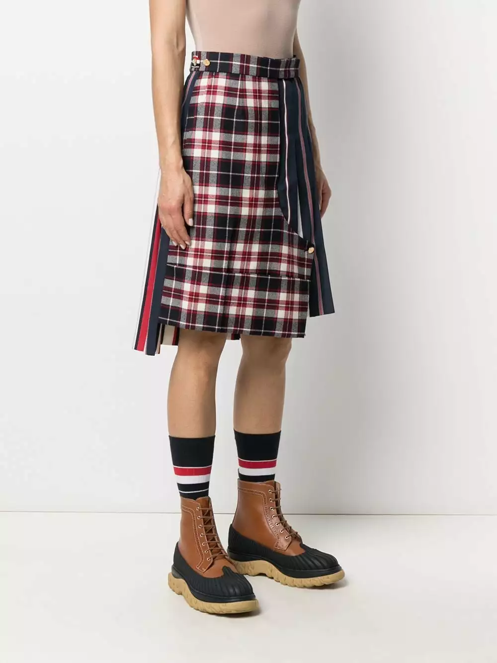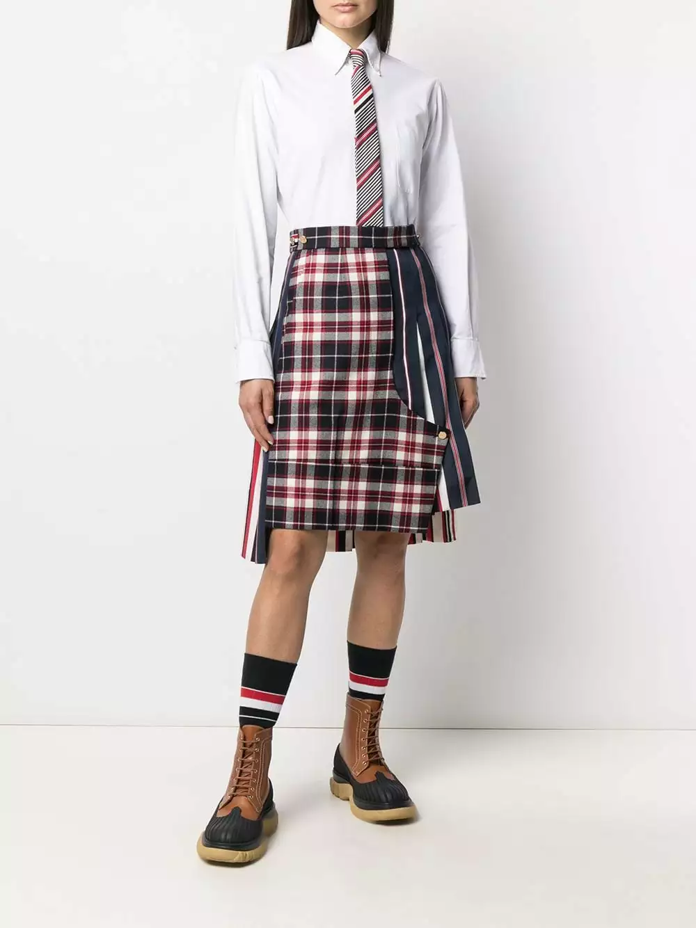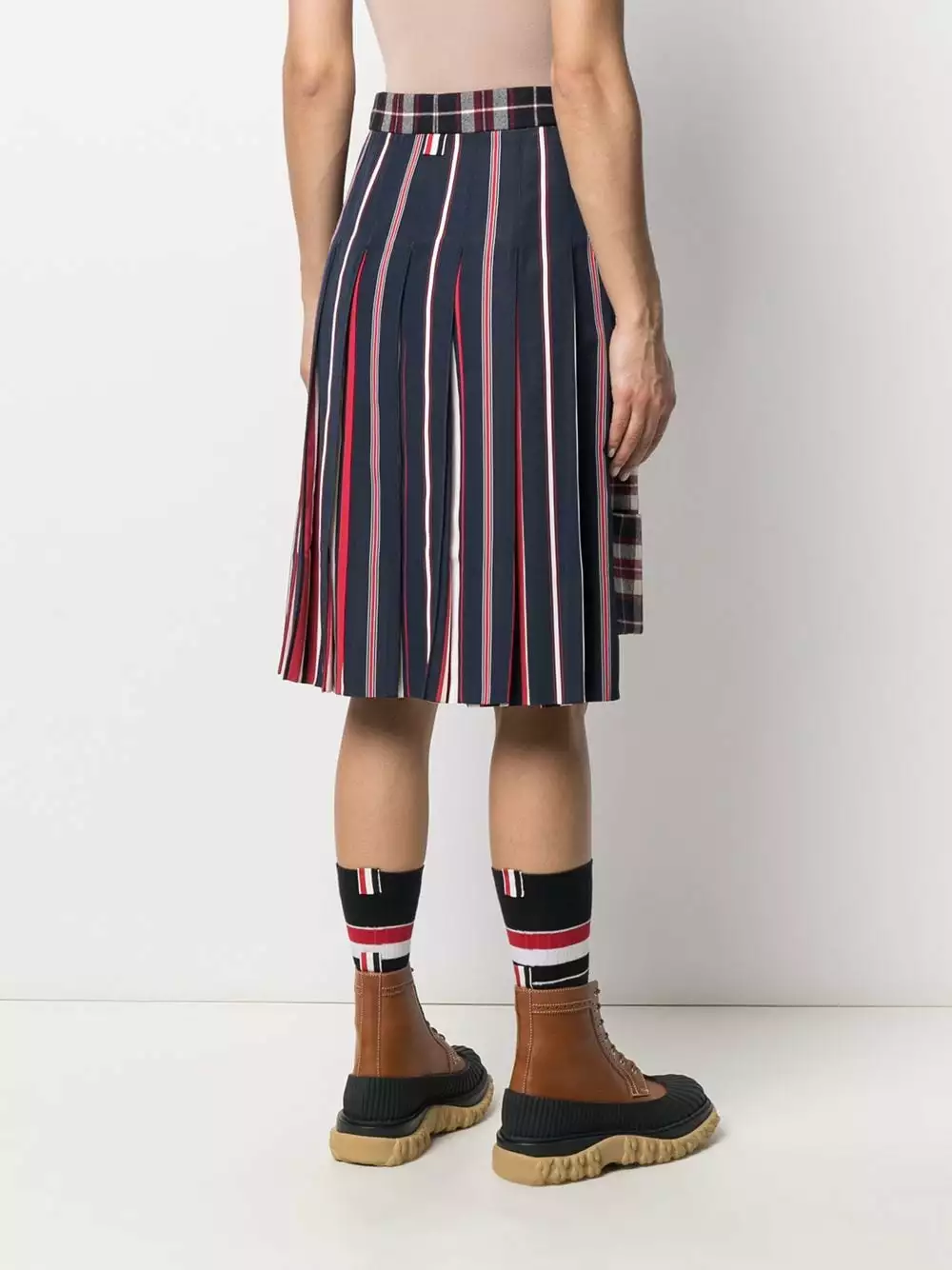 Looking to update your daily uniform? This tri-colour asymmetric alternating stripe pleated mini sack skirt is just the piece you need. Thank you Thom Browne.