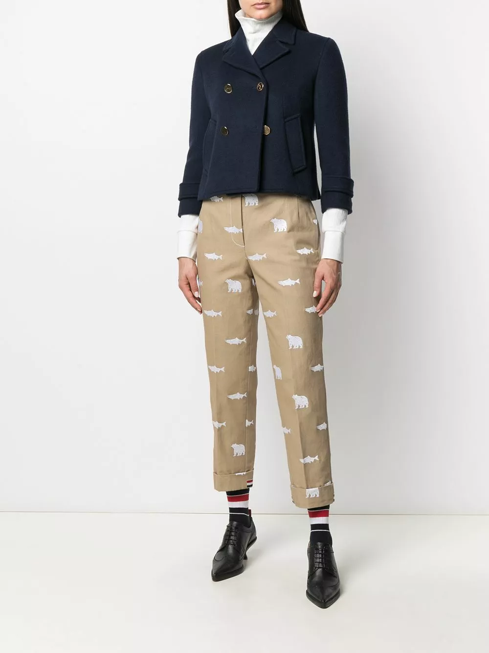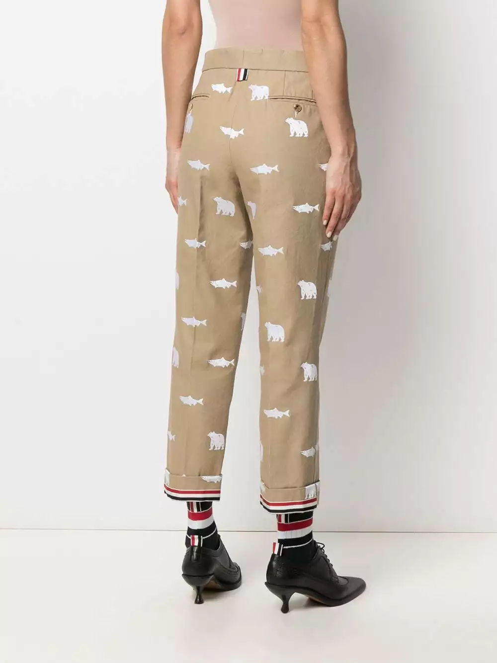 Fed up of making pointless conversation about the weather? Stop then and let your trousers do the talking if they’re as eye-catching and conversation commandeering as this pair of salmon and bear embroidered ones by Thom Browne. No need for small talk.
