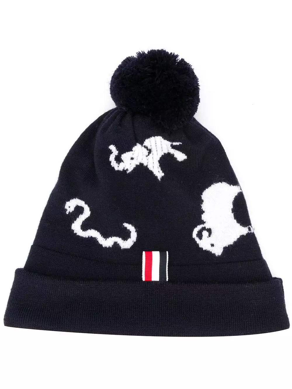 Get a headstart on your AW20 wardrobe. Cosy up wearing this animal intarsia merino wool hat from Thom Browne. It’s the ultimate winter warmer. Featuring a pompom detail, an animal intarsia and an RWB tab.