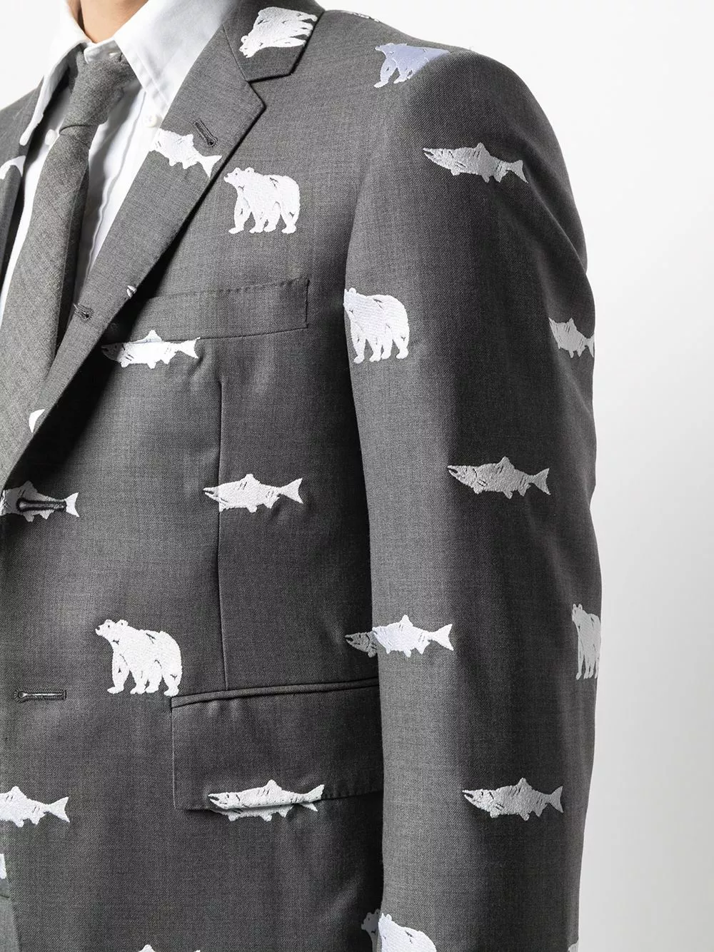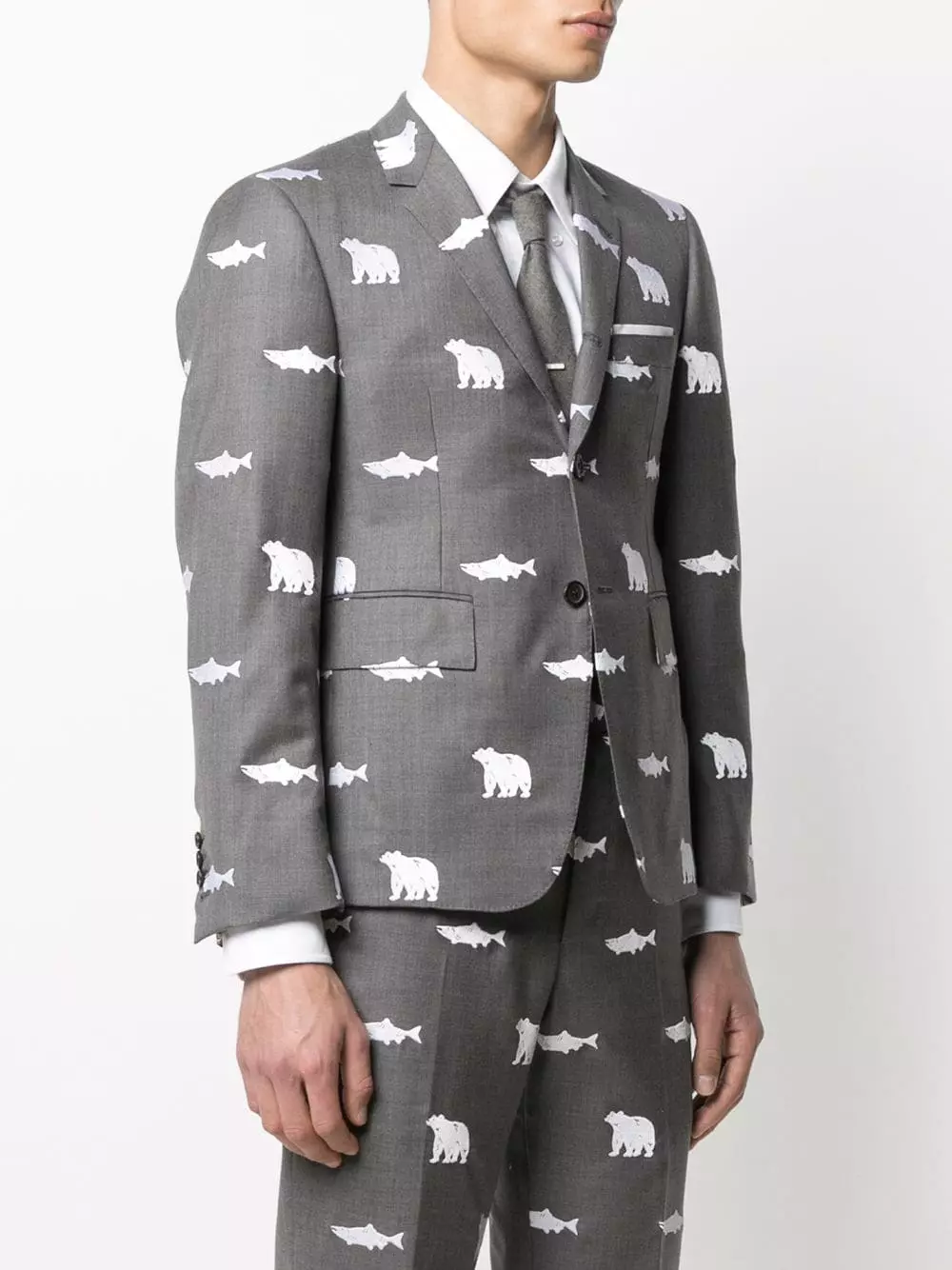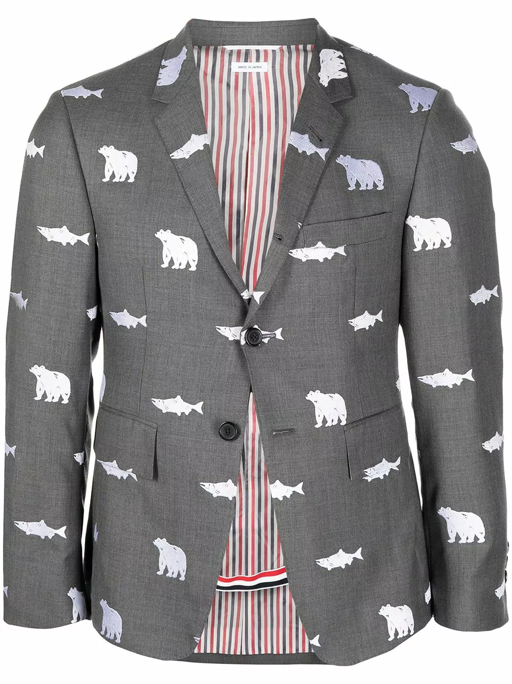 Add some whimsy to your weekwear, courtesy of Thom Browne. In an all-over animal pattern and a tailored cut, this blazer is practically overflowing with eccentric energy. Have some fun, in Thom Browne.