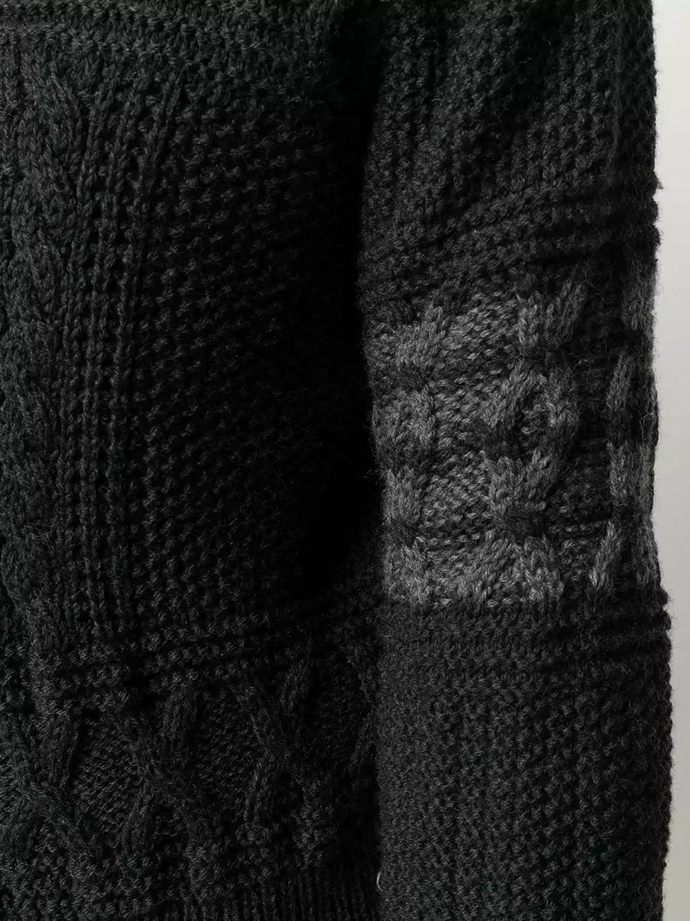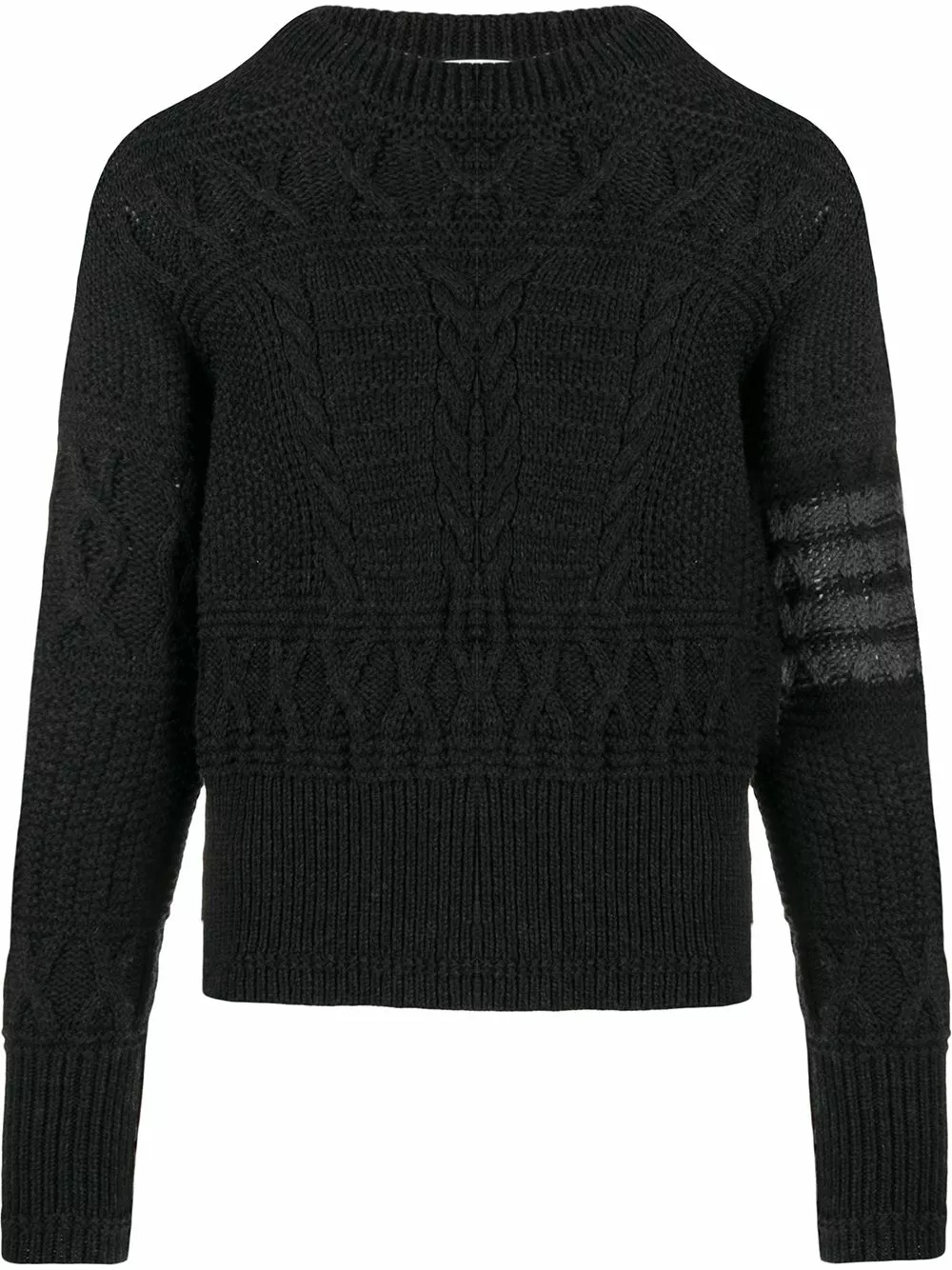 Thom Browne transforms classic silhouettes by adding signature detailing that gives the brand that avant-garde edge. Case in point: this dark grey merino wool Aran cable knit jumper. Boasting a traditional Aran knit and 4-Bar detailing to the sleeve, this jumper is instantly recognisable. Featuring a ribbed crew neck, an aran knit, a cable knit, long sleeves, a ribbed hem and cuffs, button cuffs, a side button fastening, a signature three stripe detail and signature 4-Bar detailing to the sleeve.