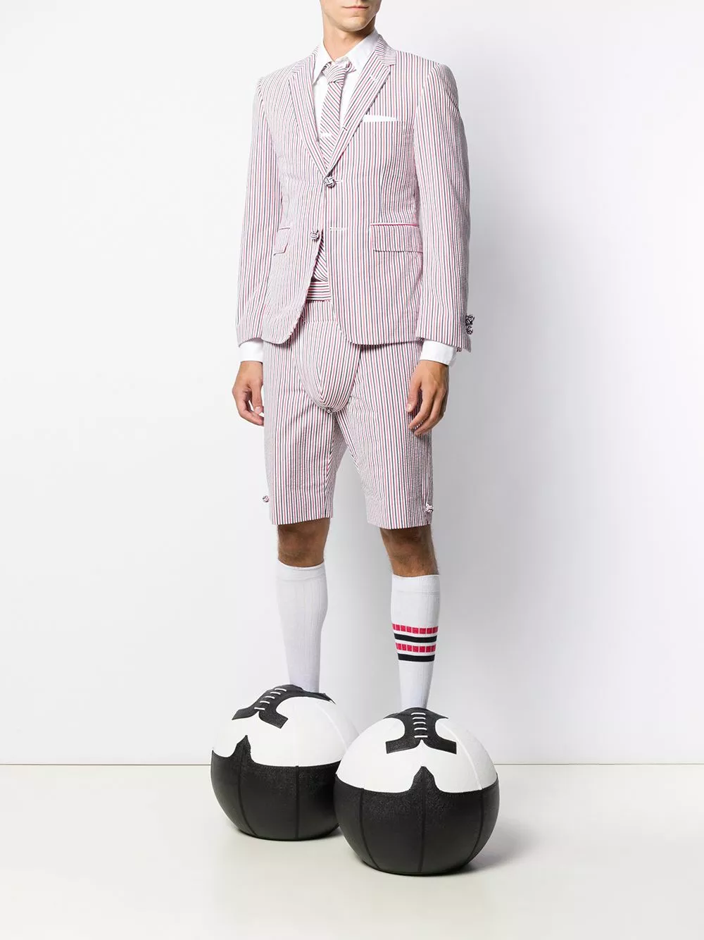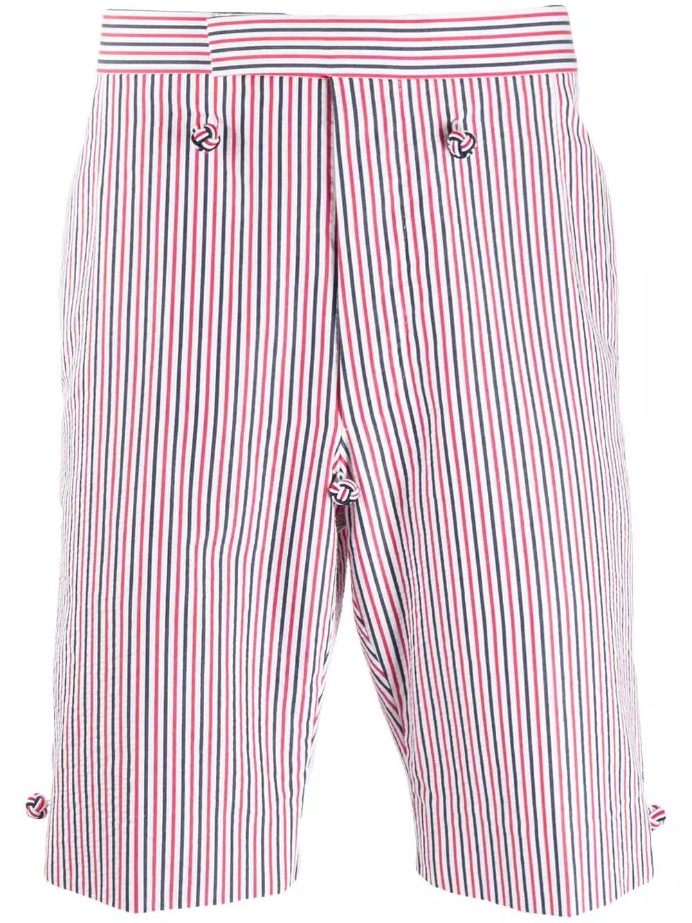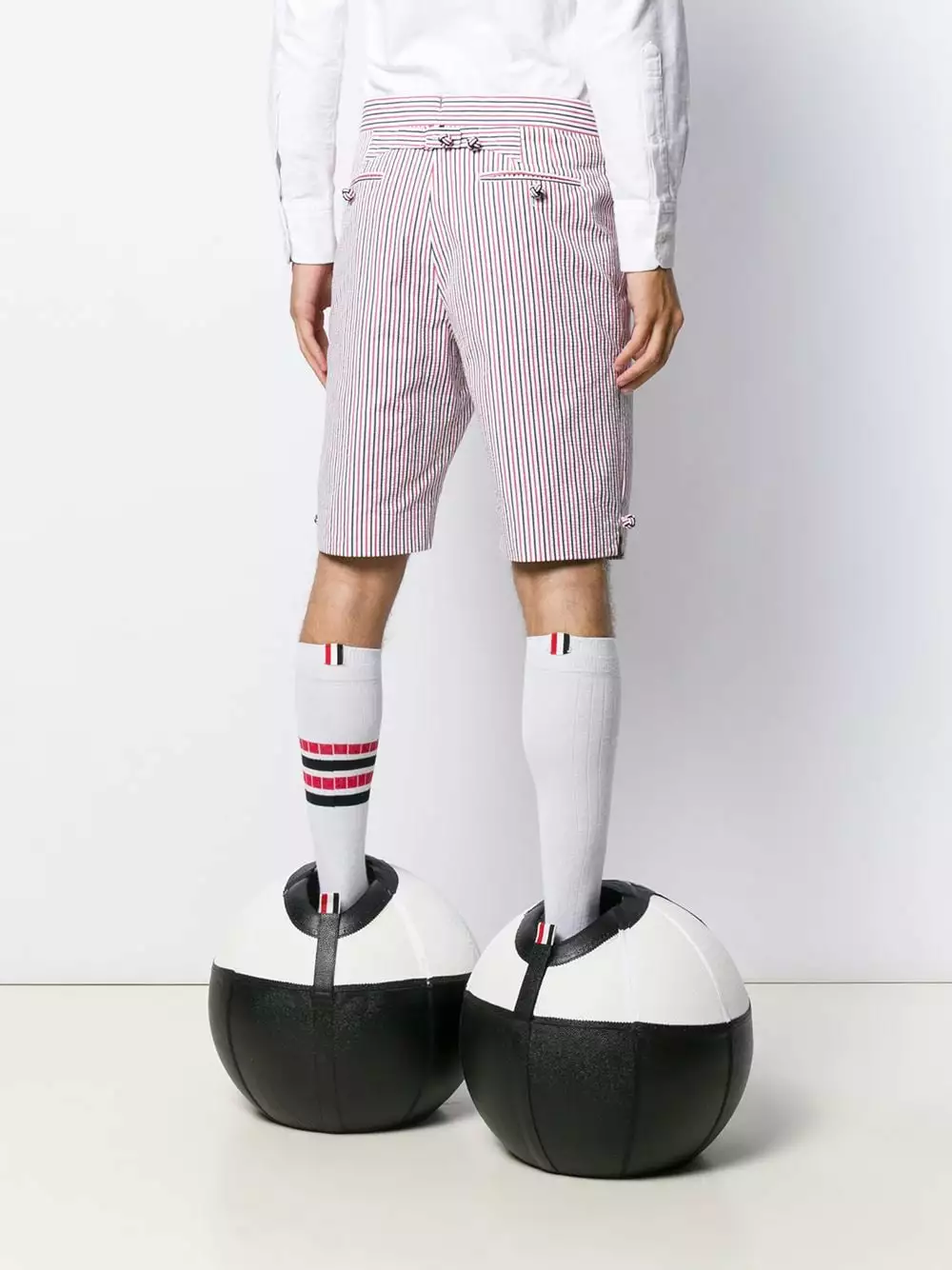 “They’re the type of items that I really hope and I do think will be in vintage stores in 20, 30 years,” says Thom Browne about his innovative garments, widely recognised by many museums and style connoisseurs around the world, as seen in these red, white and navy blue cotton backstrap striped shorts.