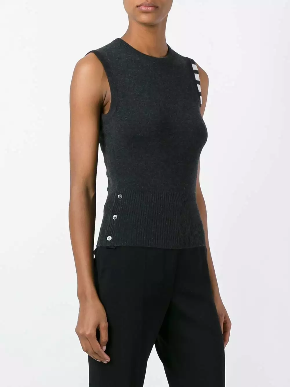 Dark grey cashmere stripe detail top from Thom Browne featuring a ribbed crew neck, a sleeveless design, a ribbed hem, 4-bar stripes at the armhole and red, white and blue grosgrain detail and back yoke tab.
