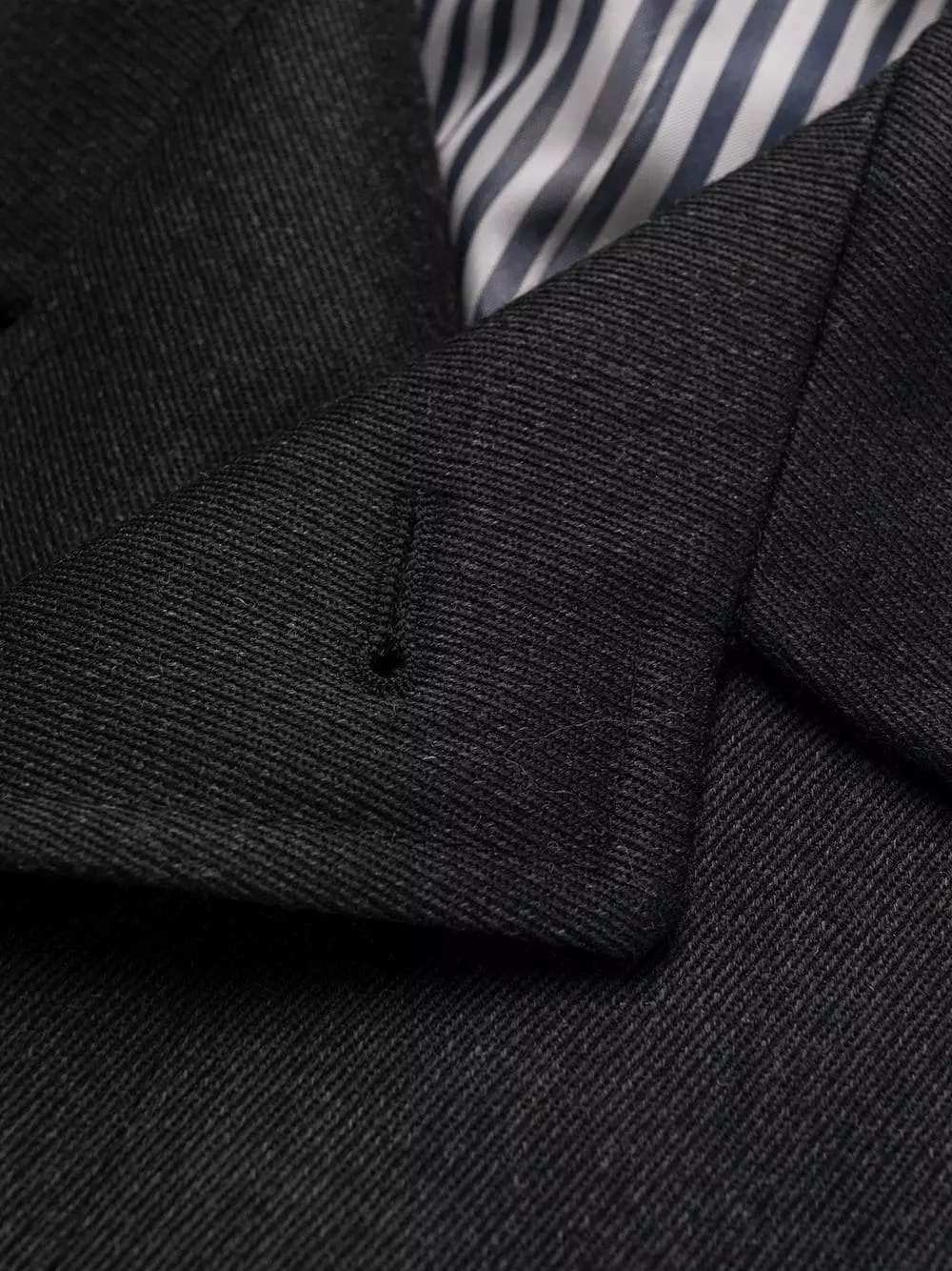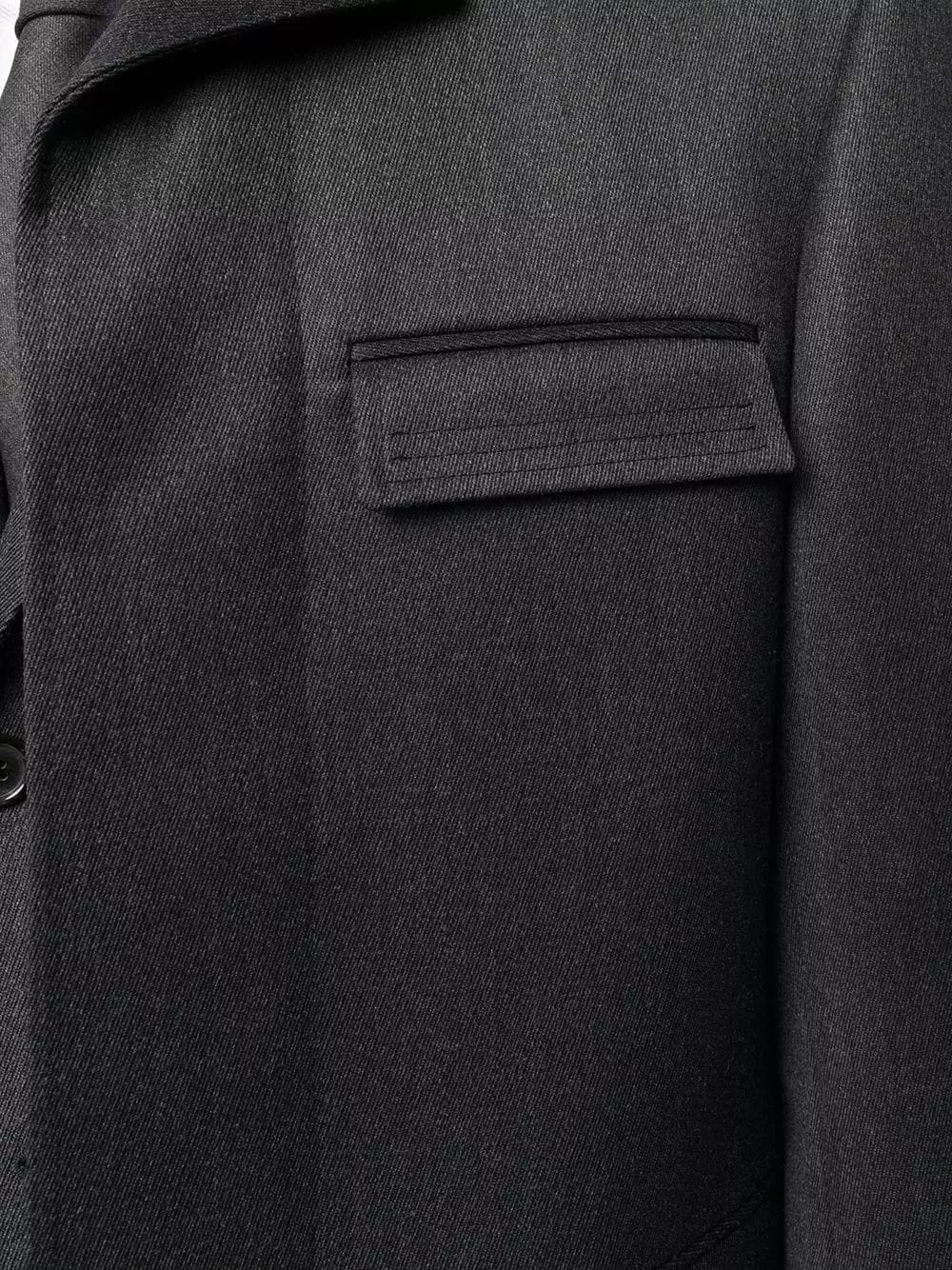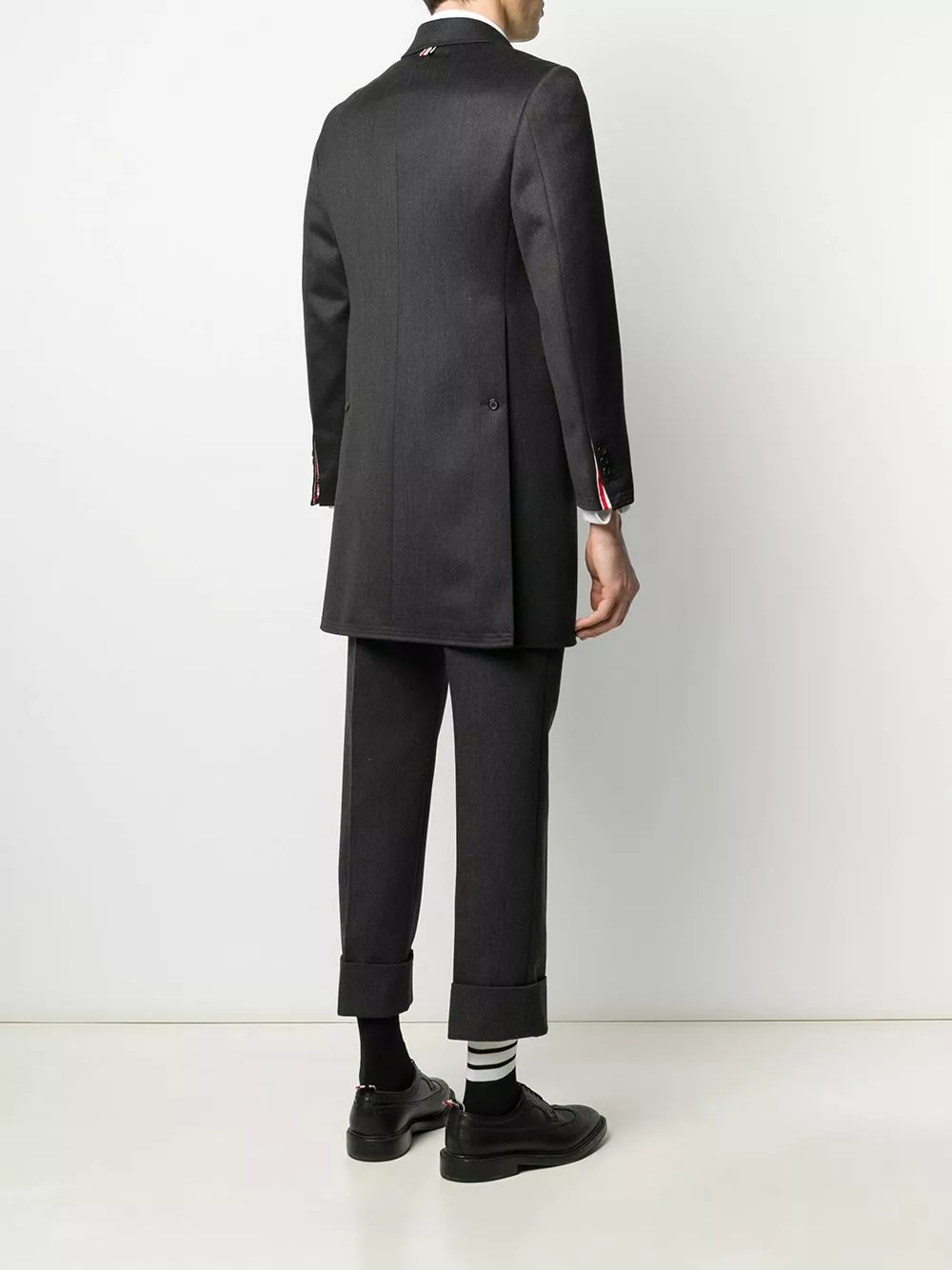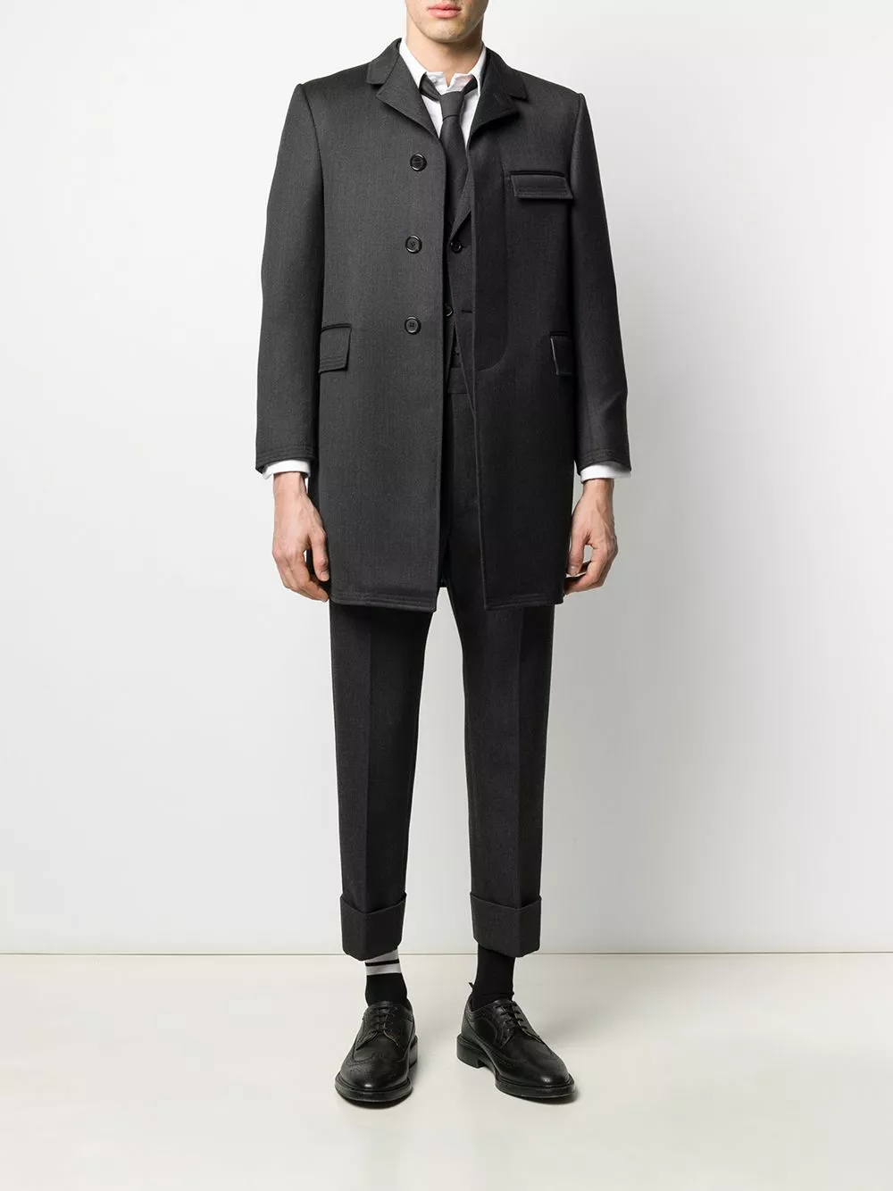 Fix up and look sharp in this cavalry twill Chesterfield overcoat from Thom Browne. This classic design will perfectly complement a formal or business smart look. Its timeless silhouette makes it a sophisticated addition to your wardrobe. Featuring notched lapels, a concealed fastening, front flap pockets, cropped sleeves, a side slit and an RWB stripe tab.