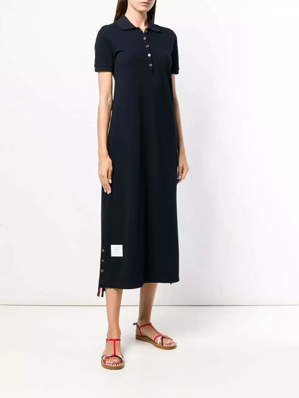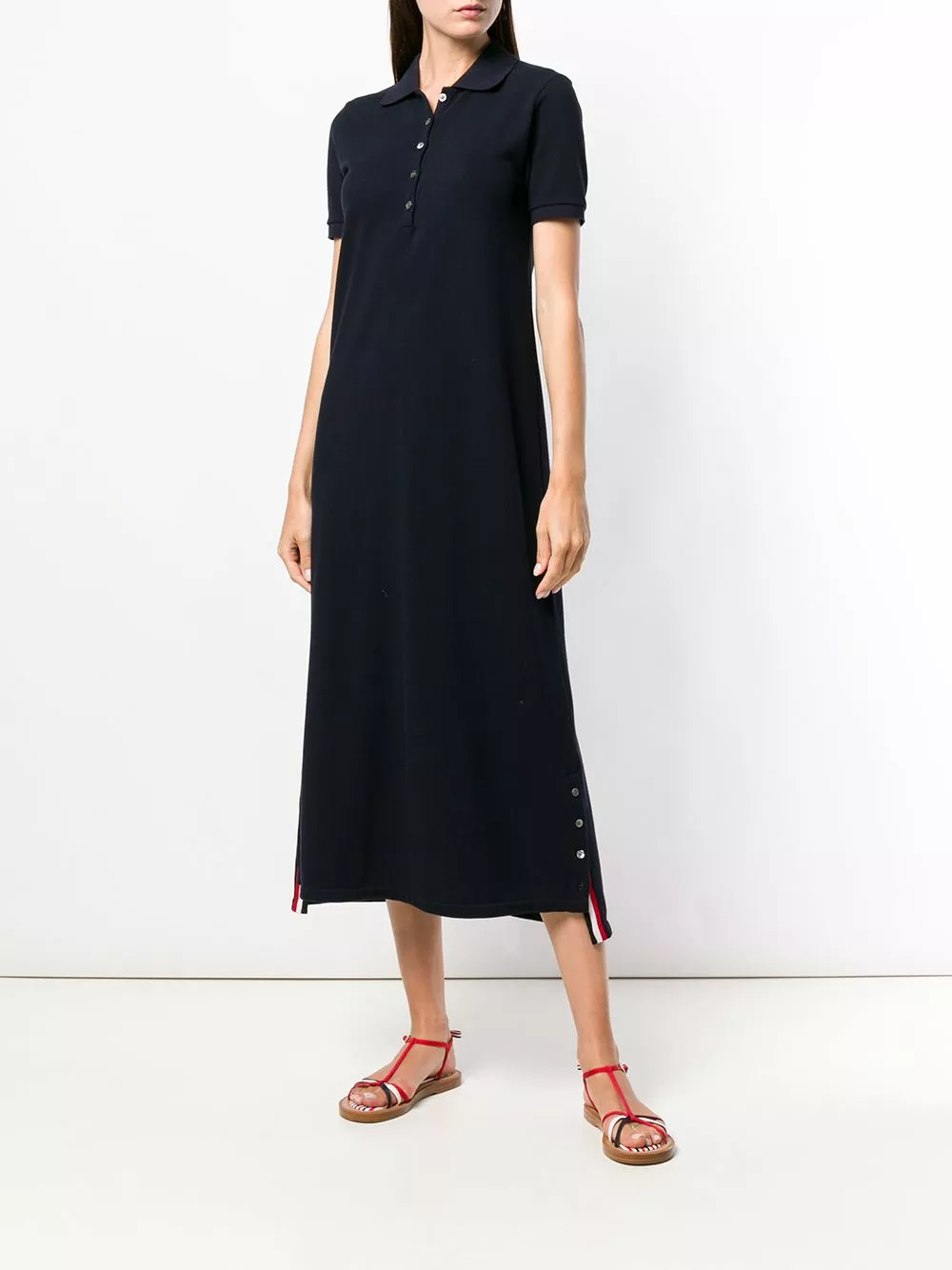 Thom Browne’s newest edit captures the immaculate craftsmanship and minimalist designs that have come to define the American label. Crafted from navy blue cotton, this center-back stripe piqué polo dress features a ribbed polo collar, a front button placket, short sleeves, fitted cuffs, a mid-length, side slits, an asymmetric hem, a tricolour grosgrain tab on the rear, side button fastenings and a signature tricolour striped trim on the back.