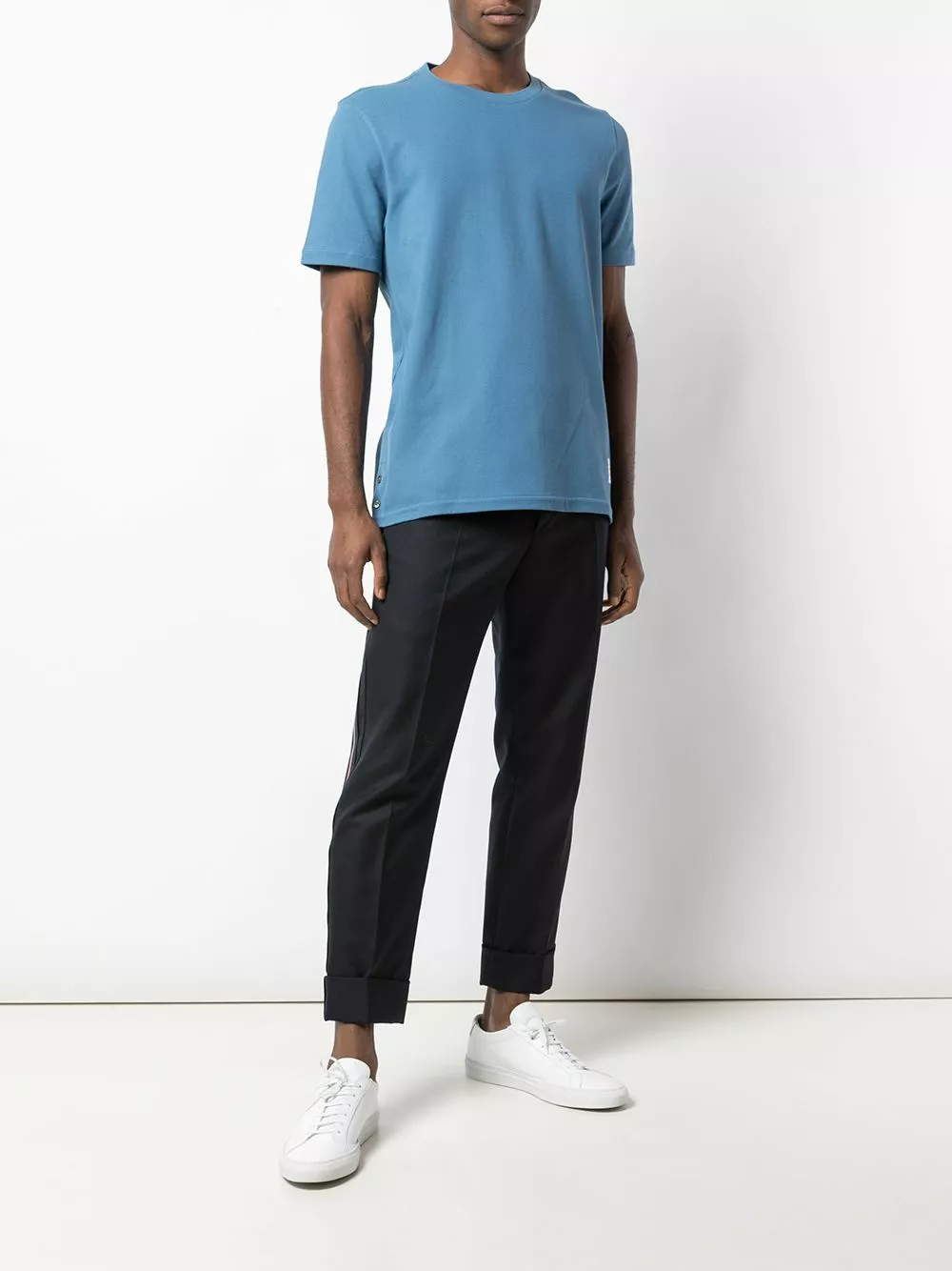 Acclaimed for his subtly deconstructed tailoring, Thom Browne incorporates traditional techniques to modern menswear for revolutionary transformations. Fashioned in Italy – the country of fashion, this T-shirt was crafted from blue piqué cotton. With a classic ribbed crew neck and short sleeves, it features a signature red, white and blue striped trim on the back, side slits fastened with buttons and finished with stripe details. An iconic detail that couldn’t be missed is the laundry patch, located on the bottom side, with Thom Browne’s stamp and size.