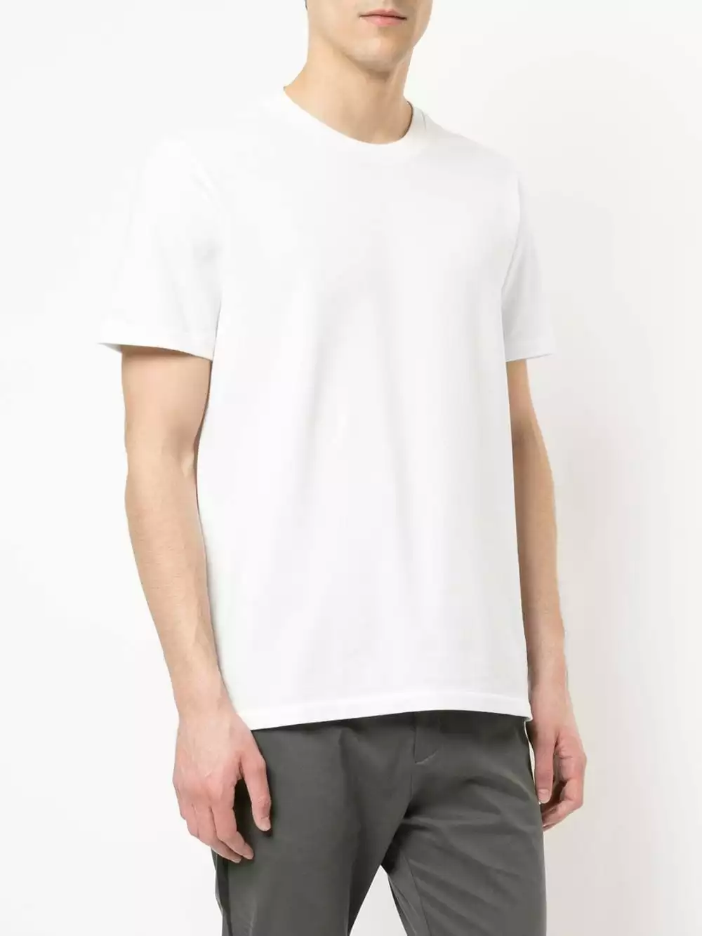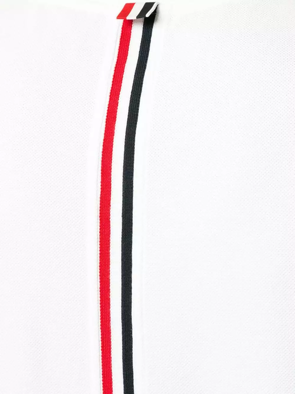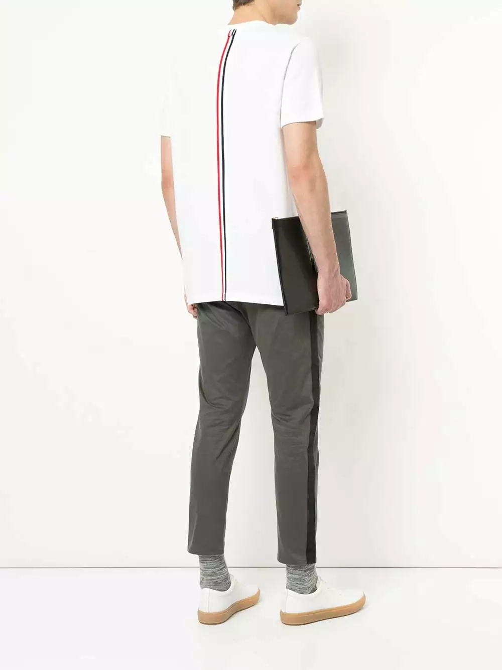 A plain white T-shirt? Not for Thom Browne. The brand’s signature RWB stripe adds a quirky touch to this piece. Featuring a ribbed crew neck, short sleeves, a front logo patch, a straight hem, a signature Grosgrain Loop Tab, asymmetric side button fastenings and RWB details.