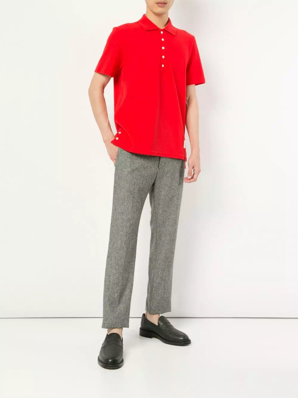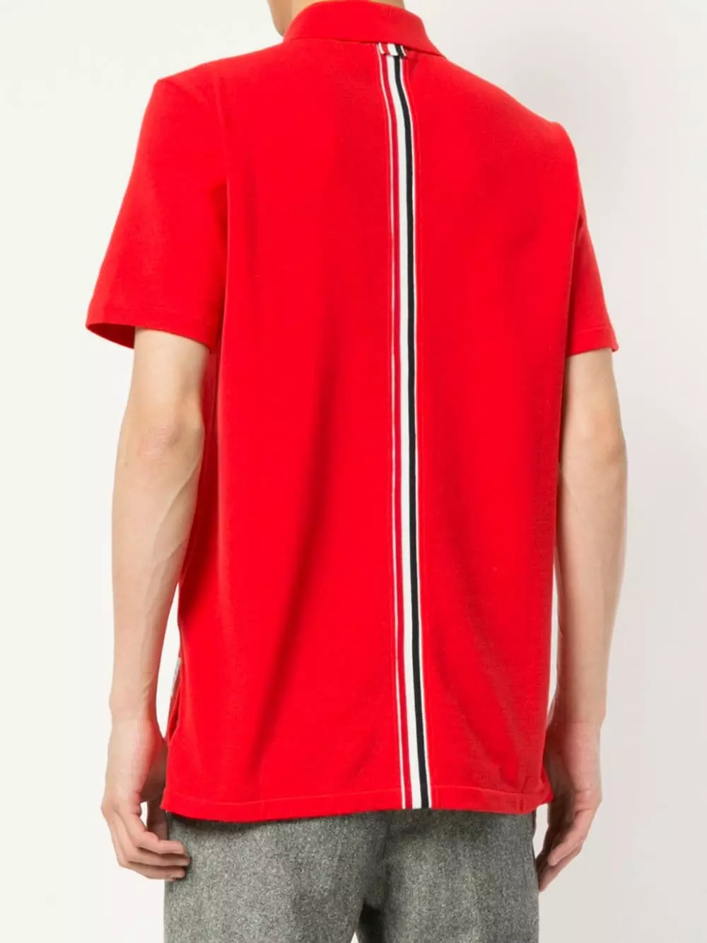 Combining highest-quality fabrics and a conservative sensibility with a touch of irreverence and humour, Thom Browne’s Spring/Summer 2019 is full of modern must-haves. This red cotton center-back stripe polo shirt from Thom Browne features a classic polo collar, a front button placket, short sleeves, a straight hem and a high low hem.
